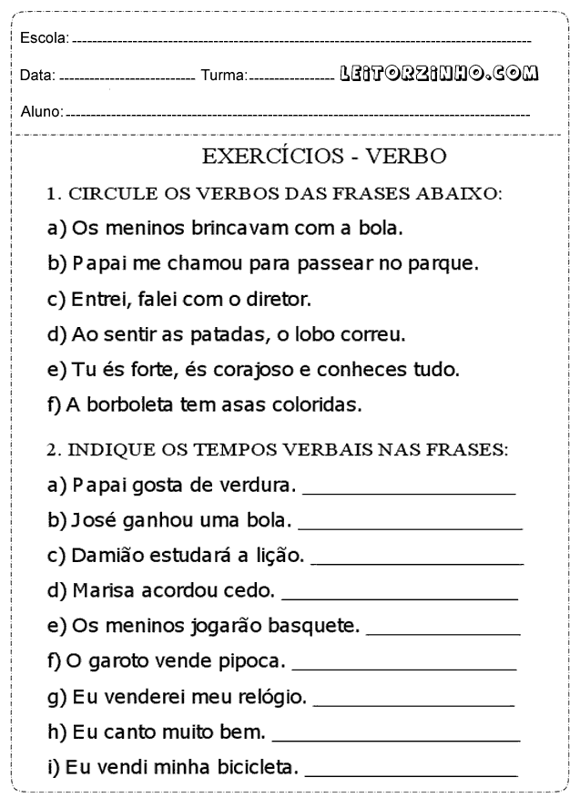 <p>Escola: Data: Turma: Aluno: EXERCÍCIOS - VERBO 1. CIRCULE os VERBOS DAS FRASES ABAIXO: a) Os meninos brincavam com a bola. b) Papai me chamou para passear no parque. c) Entrei, falei com diretor. d) Ao sentir as patadas, lobo correu. e) Tu és forte, és corajoso e conheces tudo. f) A borboleta tem asas coloridas. 2. INDIQUE os TEMPOS VERBAIS NAS FRASES: a) Papai gosta de verdura. b) José ganhou uma bola. c) Damião estudará a lição. d) Marisa acordou cedo. e) Os meninos jogarão basquete. f) garoto vende pipoca. g) Eu venderei meu relógio. h) Eu canto muito bem. i) Eu vendi minha bicicleta.</p>