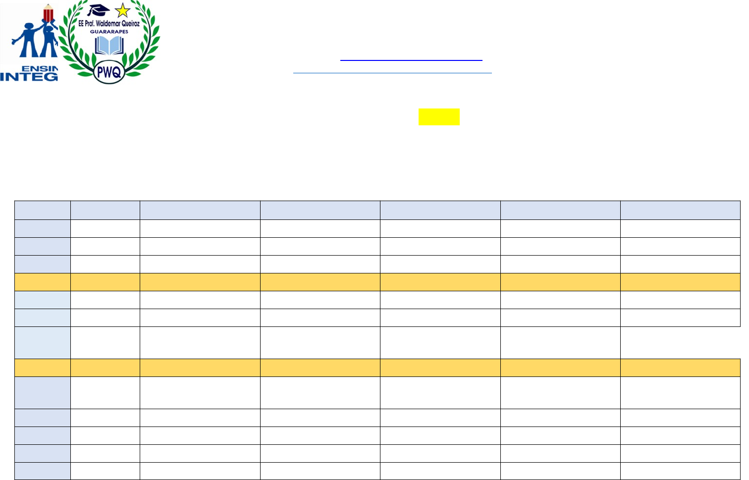 <p>EE PROFESSOR WALDEMAR QUEIROZ</p><p>Endereço: Rua Seis de Junho, 1100</p><p>Autorização da Escola: Decreto 50.537</p><p>Fone: (18) 3606-1860</p><p>E-mail: e030041a@educacao.sp.gov.br</p><p>coordenacaowaldemarqueiroz@gmail.com</p><p>ENSINO FUNDAMENTAL – ANOS FINAIS</p><p>AGENDA PEDAGÓGICA MENSAL JUNHO: 03/06/2024 a 30/06/2024</p><p>Professor(a): CAMILA FURLAN Disciplina: Tecnologia e Inovação Validação:</p><p>Aulas</p><p>Horários</p><p>Segunda-feira</p><p>Terça-feira</p><p>Quarta-feira</p><p>Quinta-feira</p><p>Sexta-feira</p><p>1ª aula</p><p>07:00 – 07:45</p><p>2ª aula</p><p>07:45 – 08:30</p><p>3ª aula</p><p>08:30 – 09:15</p><p>Intervalo</p><p>09:15 – 09:30</p><p>4ª aula</p><p>09:30 – 10:15</p><p>5ª aula</p><p>10:15 – 11:00</p><p>6ª aula</p><p>11:00 – 11:45</p><p>8ª SÉRIE C- TECNOLOGIA</p><p>Almoço</p><p>11:45 – 12:30</p><p>7ª aula</p><p>12:30 – 13:15</p><p>8ª SÉRIE C- TECNOLOGIA</p><p>9º B- TECNOLOGIA</p><p>9º A- TECNOLOGIA</p><p>9º C- TECNOLOGIA</p><p>8ª aula</p><p>13:15 – 14:00</p><p>9º B- TECNOLOGIA</p><p>9º A- TECNOLOGIA</p><p>9º C - TECNOLOGIA</p><p>14:00 – 14:45</p><p>14:45 – 15:15</p><p>15:15 – 16:00</p><p>AGENDA PEDAGÓGICA MENSAL:</p><p>ENSINO FUNDAMENTAL JULHO – 01/07/2024 A 10/07/2024</p><p>Professor(a): CAMILA FURLAN Disciplina: Tecnologia e Inovação Validação:</p><p>Aulas</p><p>Horários</p><p>Segunda-feira</p><p>Terça-feira</p><p>Quarta-feira</p><p>Quinta-feira</p><p>Sexta-feira</p><p>1ª aula</p><p>07:00 – 07:45</p><p>2ª aula</p><p>07:45 – 08:30</p><p>3ª aula</p><p>08:30 – 09:15</p><p>Intervalo</p><p>09:15 – 09:30</p><p>4ª aula</p><p>09:30 – 10:15</p><p>5ª aula</p><p>10:15 – 11:00</p><p>6ª aula</p><p>11:00 – 11:45</p><p>8ª SÉRIE C- TECNOLOGIA</p><p>Almoço</p><p>11:45 – 12:30</p><p>7ª aula</p><p>12:30 – 13:15</p><p>8ª SÉRIE C- TECNOLOGIA</p><p>9º B- TECNOLOGIA</p><p>9º A- TECNOLOGIA</p><p>9º C- TECNOLOGIA</p><p>8ª aula</p><p>13:15 – 14:00</p><p>9º B- TECNOLOGIA</p><p>9º A- TECNOLOGIA</p><p>9º C - TECNOLOGIA</p><p>14:00 – 14:45</p><p>14:45 – 15:15</p><p>15:15 – 16:00</p><p>image1.png</p><p>image2.png</p>