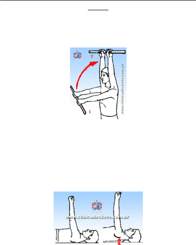 <p>O fisioterapeuta irá ajuda-lo a entender o que lhe aconteceu e a responder eficientemente à medida que o paciente tente se adaptar.</p><p>A reabilitação após o AVC significa ajudar o paciente a usar plenamente toda sua capacidade, a reassumir sua vida anterior adaptando-se a sua situação atual.</p><p>EXERCÍCIOS PARA PACIENTES PORTADORES DE AVC:</p><p>· Ombros</p><p>1. Sente-se e segure o bastão com ambas as mãos estendidas à frente (1).</p><p>2. Eleve ambos braços acima da cabeça, até sentir alongar bem (2).</p><p>3. Mantenha por 15 segundos e relaxe.</p><p>4. Repita 5 vezes, 1 ou 2 vezes ao dia.</p><p>1. Deite-se de costas com os braços estendidos para cima.</p><p>2. Eleve os ombros como se estivesse empurrando o teto para cima, sem levantar a cabeça.</p><p>3. Mantenha por 5 segundos.</p><p>4. Repita 10 vezes, 1 ou 2 vezes ao dia</p><p>· Cotovelo:</p><p>1. Deite-se de costas com o braço para cima, fixando o cotovelo com a outra mão, como mostrado.</p><p>2. Deixe que o peso de seu antebraço vá dobrando o cotovelo devagar até sentir alongar.</p><p>3. Mantenha por 5 segundos.</p><p>4. Repita 10 vezes, 1 ou 2 vezes ao dia.</p><p>1. Segure um peso de ½ Kg.</p><p>2. Fique em pé com o braço estendido para baixo e polegar para a frente.</p><p>3. Dobre o cotovelo como mostrado.</p><p>4. Mantenha por 5 segundos.</p><p>5. Repita 10 vezes, 1 ou 2 vezes ao dia.</p><p>· Punho:</p><p>1. Segure a mão como mostrado.</p><p>2. Com esse auxílio, dobre o punho para baixo até alongar.</p><p>3. Mantenha por 5 segundos.</p><p>4. Repita 5 vezes, 1 ou 2 vezes ao dia.</p><p>· Joelho:</p><p>1. Deite-se de costas com a perna a exercitar esticada e o joelho da outra dobrado, como na figura.</p><p>2. Mantendo a perna esticada, eleve-a até que o joelho fique no mesmo nível do outro.</p><p>3. Mantenha por 10 segundos e abaixe lentamente.</p><p>4. Repita 3 vezes, 1 ou 2 vezes ao dia</p><p>1. Deite-se de costas com uma toalha de rosto enrolada debaixo do joelho.</p><p>2. Eleve o calcanhar do solo até a perna estar esticada.</p><p>3. Mantenha por 10 segundos e volte lentamente.</p><p>4. Repita 5 vezes, 1 ou 2 vezes ao dia.</p><p>· Tornozelo:</p><p>1. Sente-se numa cadeira com o pé apoiado no chão.</p><p>2. Empurre os dedos do pé para elevar o calcanhar como mostrado.</p><p>3. Mantenha por 5 segundos.</p><p>4. Repita 10 vezes, 1 ou 2 vezes ao dia.</p><p>1. Sente-se no chão com uma toalha ou faixa</p><p>ao redor do pé como mostrado.</p><p>2. Puxe a ponta do pé para seu corpo até alongar.</p><p>3. Mantenha por 5 segundos.</p><p>4. Repita 10 vezes, 1 ou 2 vezes ao dia.</p><p>· Pescoço:</p><p>1. Sente-se ou fique em pé com boa postura.</p><p>2. Dobre o pescoço para a frente como mostrado.</p><p>3. Mantenha por 5 segundos, Relaxe.</p><p>4. Repita 10 vezes, 1 ou 2 vezes ao dia.</p><p>1. Sente-se ou fique em pé com boa postura.</p><p>2. Mantendo a face voltada à frente, dobre o pescoço para a direita como mostrado.</p><p>3. Mantenha por 5 segundos. Relaxe.</p><p>4. Repita 10 vezes, 1 ou 2 vezes ao dia.</p><p>· Coluna:</p><p>1. Fique em pé, com o braço sobre a cabeça.</p><p>2. Incline-se para a direita até sentir alongar.</p><p>3. Mantenha por 5 segundos.</p><p>4. Repita o movimento para o outro lado.</p><p>5. Mantenha por 5 segundos.</p><p>6. Repita 10 vezes, 1 ou 2 vezes ao dia.</p><p>1. Deite-se de costas.</p><p>2. Puxe o joelho esquerdo para o peito, mantendo a perna direita toda no piso.</p><p>3. Mantenha por 5 segundos.</p><p>4. Repita 10 vezes, 1 ou 2 vezes ao dia.</p><p>5. Repita com o outro lado.</p><p>image3.jpeg</p><p>image4.jpeg</p><p>image5.jpeg</p><p>image6.jpeg</p><p>image7.jpeg</p><p>image8.jpeg</p><p>image9.jpeg</p><p>image10.jpeg</p><p>image11.jpeg</p><p>image12.jpeg</p><p>image13.jpeg</p><p>image1.jpeg</p><p>image2.jpeg</p>