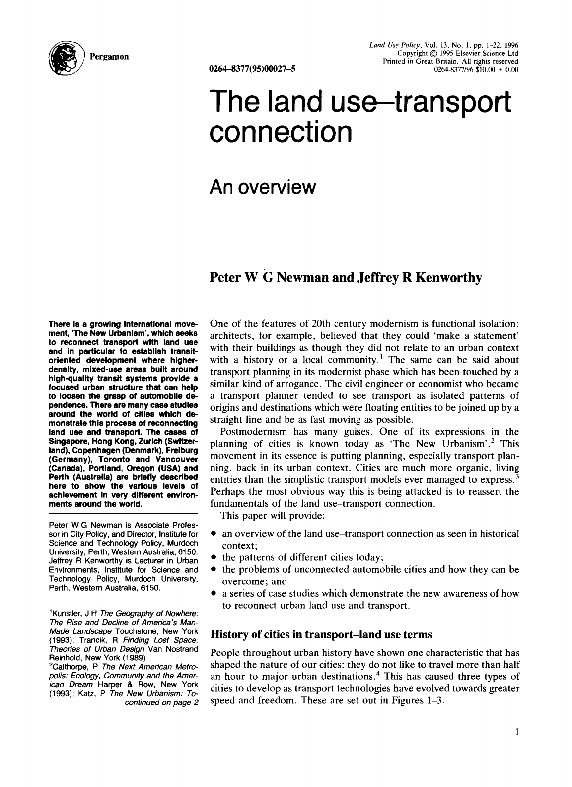<p>Pergamon</p><p>0264-8377(95)00027-5</p><p>Land Use Policy, Vol. 13, No. 1, pp. 1-22, 1996</p><p>Copyright ~ 1995 Elsevier Science Ltd</p><p>Printed in Great Britain. All rights reserved</p><p>0264-8377/96 $10.00 + 0.00</p><p>The land use-transport</p><p>connection</p><p>An overview</p><p>Peter W G Newman and Jeffrey R Kenworthy</p><p>There is a growing international move-</p><p>ment, 'The New Urbanism', which seeks</p><p>to reconnect transport with land use</p><p>and in particular to establish transit-</p><p>oriented development where higher-</p><p>density, mixed-use areas built around</p><p>high-quality transit systems provide a</p><p>focused urban structure that can help</p><p>to loosen the grasp of automobile de-</p><p>pendence. There are many case studies</p><p>around the world of clues which de-</p><p>monatrate this process of reconnecting</p><p>land use and transport. The cases of</p><p>Singapore, Hong Kong, Zurich (Switzer-</p><p>land), Copenhagen (Denmark), Freiburg</p><p>(Germany), Toronto and Vancouver</p><p>(Canada), Portland, Oregon (USA) and</p><p>Perth (Australia) are briefly described</p><p>here to show the various levels of</p><p>achievement in very different environ-</p><p>ments around the world.</p><p>Peter W G Newman is Associate Profes-</p><p>sor in City Policy, and Director, Institute for</p><p>Science and Technology Policy, Murdoch</p><p>University, Perth, Western Australia, 6150.</p><p>Jeffrey R Kenworthy is Lecturer in Urban</p><p>Environments, Institute for Science and</p><p>Technology Policy, Murdoch University,</p><p>Perth, Western Australia, 6150.</p><p>1Kunstler, J H The Geography of Nowhere:</p><p>The Rise and Decline of America's Man-</p><p>Made Landscape Touchstone, New York</p><p>(1993); Trancik, R Finding Lost Space:</p><p>Theories of Urban Design Van Nostrand</p><p>Reinhold, New York (1989)</p><p>2Calthorpe, P The Next American Metro-</p><p>polis: Ecology, Community and the Amer-</p><p>ican Dream Harper & Row, New York</p><p>(1993); Katz, P The New Urbanism: To-</p><p>continued on page 2</p><p>One of the features of 20th century modernism is functional isolation:</p><p>architects, for example, believed that they could 'make a s ta tement '</p><p>with their buildings as though they did not relate to an urban context</p><p>with a history or a local community. ~ The same can be said about</p><p>t ransport planning in its modernist phase which has been touched by a</p><p>similar kind of arrogance. The civil engineer or economist who became</p><p>a transport planner tended to see transport as isolated patterns of</p><p>origins and destinations which were floating entities to be joined up by a</p><p>straight line and be as fast moving as possible.</p><p>Postmodernism has many guises. One of its expressions in the</p><p>planning of cities is known today as 'The New Urbanism' . 2 This</p><p>movement in its essence is putting planning, especially transport plan-</p><p>ning, back in its urban context. Cities are much more organic, living</p><p>entities than the simplistic transport models ever managed to express. 3</p><p>Perhaps the most obvious way this is being at tacked is to reassert the</p><p>fundamentals of the land use- t ranspor t connection.</p><p>This paper will provide:</p><p>• an overview of the land use- t ranspor t connection as seen in historical</p><p>context;</p><p>• the patterns of different cities today;</p><p>• the problems of unconnected automobile cities and how they can be</p><p>overcome; and</p><p>• a series of case studies which demonstra te the new awareness of how</p><p>to reconnect urban land use and transport.</p><p>History of cities in transport-land use terms</p><p>People throughout urban history have shown one characteristic that has</p><p>shaped the nature of our cities: they do not like to travel more than half</p><p>an hour to major urban destinations. 4 This has caused three types of</p><p>cities to develop as transport technologies have evolved towards greater</p><p>speed and freedom. These are set out in Figures 1-3.</p><p>The land use-transport connection: P W G Newman and J R Kenworthy</p><p>• High Densi ty</p><p>• Mixed Use</p><p>• Organic Structure</p><p>Figure 1. The traditional walking city.</p><p>Up to 1850 in Europe.</p><p>continued from page 1</p><p>ward an Architecture of Community</p><p>McGraw Hill, New York (1994)</p><p>3Kenworthy, J 'Don't shoot me I'm only the</p><p>transport planner (apologies to Elton John)'</p><p>in Newman, P, Kenworthy, J and Lyons, T</p><p>Transport Energy Conservation Po/icies</p><p>for Austra/ian Cities: Strategies for Reduc-</p><p>ing Automobile Dependence ISTP, Mur-</p><p>doch University (1990); Kenworthy, J R 'An</p><p>invited submission on the Wellington Re-</p><p>gional Council's Environmental Impact Re-</p><p>port for the future state highway Number 1</p><p>route: comments on the transport modell-</p><p>ing, air pollution and energy aspects of the</p><p>report' in Audit of the Future State High-</p><p>way Number One Route Environmental</p><p>Impact Report, Vol 1, Main Report, Office</p><p>continued on page 3</p><p>The wa lk ing city</p><p>Figure 1 shows that the traditional walking city which developed around</p><p>10 000 years ago and still exists today in some places; it is characterized</p><p>by high density (100-200 people per ha), mixed land use, joined</p><p>together by narrow streets in an organic form that fits the landscape. In</p><p>walking cities all destinations can be reached on foot in half an hour and</p><p>thus these cities are rarely more than 5 km across. Many cities today</p><p>have parts which either retain historical walking characteristics, or the</p><p>municipal authorities have purposely built new sections at a walking</p><p>scale, eg the medieval core areas of many European cities, new</p><p>suburban centres along Stockholm's rail system or new district centres</p><p>such as Arabella Park (Bogenhausen District Centre) in Munich. Much</p><p>l