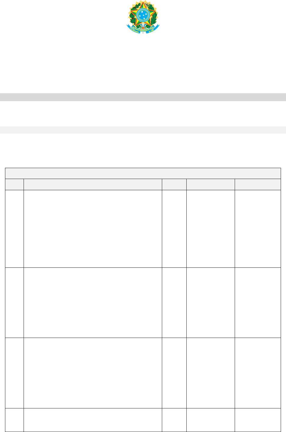 <p>SERVIÇO PÚBLICO FEDERAL</p><p>UNIVERSIDADE FEDERAL DO SUL E SUDESTE DO PARÁ</p><p>SECRETARIA DE INFRAESTRUTURA</p><p>DIVISÃO DE OBRAS E PROJETOS</p><p>TERMO DE REFERÊNCIA</p><p>1. OBJETO</p><p>Aquisição de Estação Tratamento de Esgoto (ETE) compacta, em Plástico Reforçado de Fibra de Vidro (PRFV),</p><p>com instalação inclusa, para atendimento das Unidades prediais da Unifesspa e Aparelho colorímetro e dosador</p><p>de cloro para tratamento de água.</p><p>1.1. Grupo 1</p><p>Aquisição de Estação Tratamento de Esgoto (ETE) compacta, em Plástico Reforçado de Fibra de Vidro (PRFV),</p><p>com instalação inclusa, para atendimento das Unidades prediais da Unifesspa, conforme descrições dos itens</p><p>abaixo:</p><p>GRUPO 01</p><p>Item Descrição Quant. Valor unitário Valor total</p><p>01</p><p>Aquisição com Instalação e Start up de Estação</p><p>Compacta de Tratamento de Esgoto (ETE) com</p><p>capacidade de vazão de até 10m3/d. (Completa,</p><p>abrangendo os Tratamentos preliminar, primário,</p><p>secundário e terciário).</p><p>Observação: O custo deve conter Montagem (com</p><p>material* e mão de obra) Start up e treinamento de</p><p>operadores incluso despesas de hospedagem,</p><p>alimentação, transporte e demais despesas inerentes a</p><p>entrega do equipamento instalado.</p><p>2</p><p>R$ 69.254,00</p><p>R$138.508,00</p><p>02</p><p>Aquisição com Instalação e Start up de Estação</p><p>Compacta de Tratamento de Esgoto (ETE) com</p><p>capacidade de vazão de até 20m3/d. (Completa,</p><p>abrangendo os Tratamentos preliminar, primário,</p><p>secundário e terciário).</p><p>Observação: O custo deve conter Montagem (com</p><p>material* e mão de obra) Start up e treinamento de</p><p>operadores incluso despesas de hospedagem,</p><p>alimentação e transporte.</p><p>3 R$ 103.139,50</p><p>R$ 309.418,50</p><p>03</p><p>Aquisição com Instalação e Start up de Estação</p><p>Compacta de Tratamento de Esgoto (ETE) com</p><p>capacidade de vazão de até 40m3/d. (Completa,</p><p>abrangendo os Tratamentos preliminar, primário,</p><p>secundário e terciário).</p><p>Observação: O custo deve conter Montagem (com</p><p>material* e mão de obra) Start up e treinamento de</p><p>operadores incluso despesas de hospedagem,</p><p>alimentação e transporte.</p><p>4 145.749,25 582.997,00</p><p>04</p><p>Aquisição com Instalação e Start up de Estação</p><p>Compacta de Tratamento de Esgoto (ETE) com</p><p>capacidade de vazão de até 80m3/d. (Completa,</p><p>2</p><p>197.024,25</p><p>394.048,50</p><p>SERVIÇO PÚBLICO FEDERAL</p><p>UNIVERSIDADE FEDERAL DO SUL E SUDESTE DO PARÁ</p><p>SECRETARIA DE INFRAESTRUTURA</p><p>DIVISÃO DE OBRAS E PROJETOS</p><p>* Material inerente a instalação da ETE e Estação Elevatória, desde o quadro elétrico/comando (com todas as proteções</p><p>necessárias como disjuntor, contatora, rele térmico, botoeiras, sinalização luminosa, relé de falta de fase) até o</p><p>lançamento do resíduo tratado.</p><p>1.2. Grupo 2</p><p>Aquisição de Cloradores para tratamento de água, aparelhos de colorímetro para mediação do cloro total, e seus</p><p>respectivos kit’s de reagentes para testes, para atendimento das Unidades prediais da Unifesspa, conforme</p><p>descrições dos itens abaixo.</p><p>GRUPO 02</p><p>Item Descrição Quant. Valor unitário Valor total</p><p>06 Aparelho de Colorímetro, com um kit* de reagente</p><p>teste.</p><p>8</p><p>R$ 524,37 R$ 4.194,96</p><p>07 Aparelho Dosador de Cloro -Clorador como um kit**</p><p>de pastilhas de teste.</p><p>50 R$ 727,60 R$ 36.380,00</p><p>Valor total do grupo 02 R$ 40.574,96</p><p>* 5 caixas (25 unidades cada) de reagentes para Colorímetro por aparelho</p><p>**3 frascos de pastilhas para dosador de cloro por aparelho Dosador</p><p>2. JUSTIFICATIVA</p><p>GRUPO 1</p><p>2.1. O uso indiscriminado dos recursos hídricos e a degradação do meio ambiente são práticas antigas e que vem</p><p>cada dia mais chamando a atenção da população e das autoridades. Os efeitos cumulativos causados pelas</p><p>práticas danosas ao meio ambiente vêm provocando desequilíbrios ambientais sensíveis, chegando a ponto de</p><p>exaurir a capacidade de autodepuração de muitos corpos receptores, causando danos não somente ao meio</p><p>ambiente bem como as populações que ali habitam.</p><p>2.2. O desenvolvimento de ações visando a sustentabilidade ambiental vem a cada dia se propagando e, surgindo a</p><p>necessidade de se adequar as condições sustentáveis de eliminação de resíduos provenientes do esgoto</p><p>abrangendo os Tratamentos preliminar, primário,</p><p>secundário e terciário).</p><p>Observação: O custo deve conter Montagem (com</p><p>material* e mão de obra) Start up e treinamento de</p><p>operadores incluso despesas de hospedagem,</p><p>alimentação e transporte.</p><p>05</p><p>Estação Elevatória em PRVF (Polímero Reforçado de</p><p>Fibra de Vidro) compatível para atender uma Estação</p><p>de tratamento de até 80m3/d (período de contribuição</p><p>de 12 h/d).</p><p>11 R$ 26.512,00 R$ 291.632,00</p><p>Valor total do grupo 01 1.716.604,00</p><p>SERVIÇO PÚBLICO FEDERAL</p><p>UNIVERSIDADE FEDERAL DO SUL E SUDESTE DO PARÁ</p><p>SECRETARIA DE INFRAESTRUTURA</p><p>DIVISÃO DE OBRAS E PROJETOS</p><p>doméstico das Unidades prediais da Unifesspa, para tanto objetivamos a realização de tratamento de caráter</p><p>biológico para descontaminação do efluente.</p><p>2.3. A estação compacta de Tratamento de Efluentes é um sistema modular para tratamento biológico de águas</p><p>servidas (esgoto). Sua Aplicação deverá minimizar os impactos causados, pelo lançamento dos esgotos</p><p>domésticos produzidos pelas Unidades prediais da Unifesspa, visto que ainda utilizam os métodos de tratamento</p><p>de esgoto individual (fossa, filtro e sumidouro) que possuem baixa eficiência (Assumindo uma eficiência ótima,</p><p>não ultrapassa 50% de