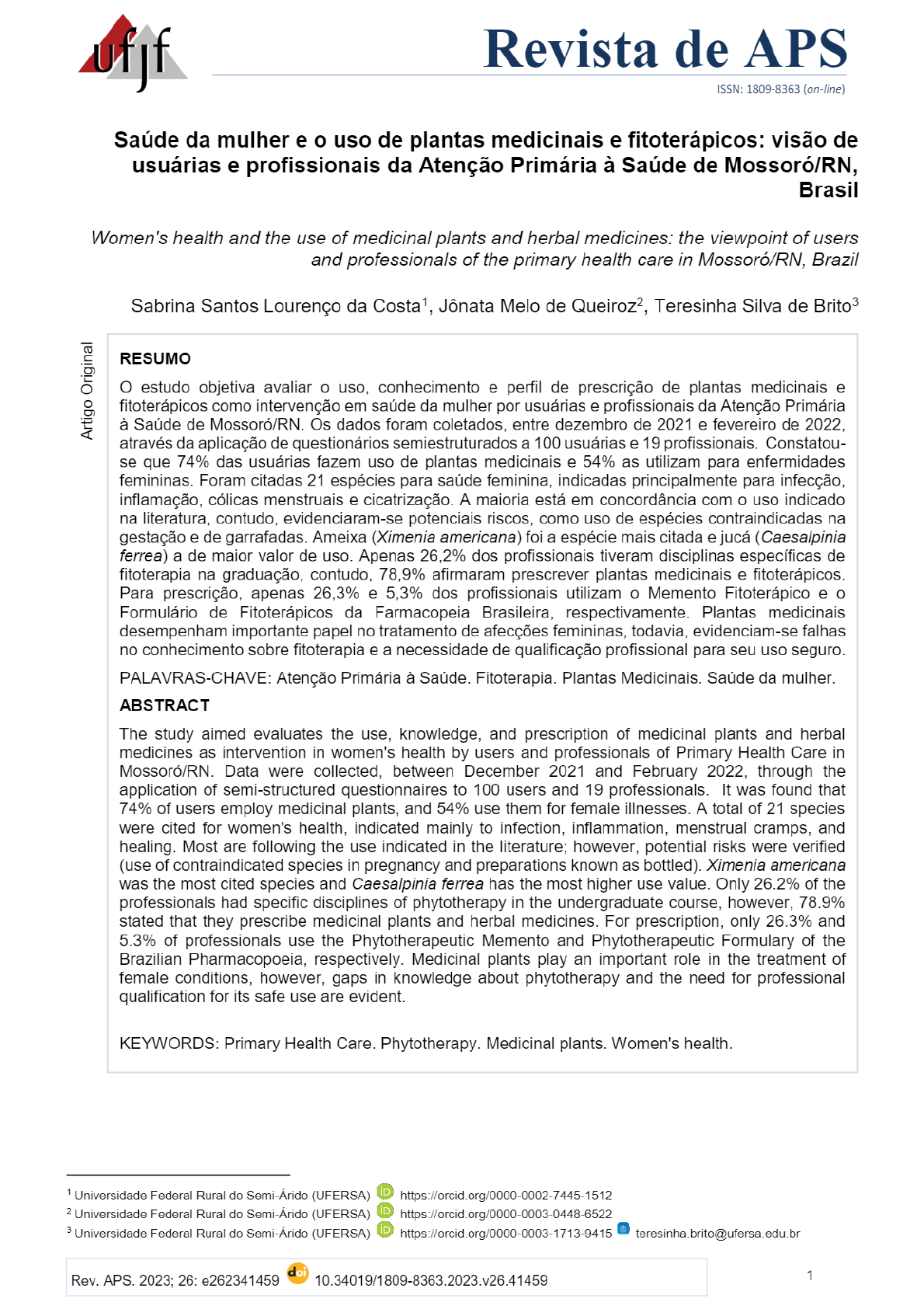 <p>Revista de APS ISSN: 1809-8363 (on-line) Saúde da mulher e o uso de plantas medicinais e fitoterápicos: visão de usuárias e profissionais da Atenção Primária à Saúde de Mossoró/RN, Brasil Women's health and the use of medicinal plants and herbal medicines: the viewpoint of users and professionals of the primary health care in Mossoró/RN, Brazil Sabrina Santos Lourenço da Jônata Melo de Queiroz², Teresinha Silva de RESUMO estudo objetiva avaliar o uso, conhecimento e perfil de prescrição de plantas medicinais e fitoterápicos como intervenção em saúde da mulher por usuárias e profissionais da Atenção Primária à Saúde de Mossoró/RN. Os dados foram coletados, entre dezembro de 2021 e fevereiro de 2022, através da aplicação de questionários semiestruturados a 100 usuárias e 19 profissionais. Constatou- se que 74% das usuárias fazem uso de plantas medicinais e 54% as utilizam para enfermidades femininas. Foram citadas 21 espécies para saúde feminina, indicadas principalmente para infecção, inflamação, cólicas menstruais e cicatrização. A maioria está em concordância com o uso indicado na literatura, contudo, evidenciaram-se potenciais riscos, como uso de espécies contraindicadas na gestação e de garrafadas. Ameixa (Ximenia americana) foi a espécie mais citada e jucá (Caesalpinia ferrea) a de maior valor de uso. Apenas 26,2% dos profissionais tiveram disciplinas específicas de fitoterapia na graduação, contudo, 78,9% afirmaram prescrever plantas medicinais e fitoterápicos. Para prescrição, apenas 26,3% e 5,3% dos profissionais utilizam o Memento Fitoterápico e o Formulário de Fitoterápicos da Farmacopeia Brasileira, respectivamente. Plantas medicinais desempenham importante papel no tratamento de afecções femininas, todavia, evidenciam-se falhas no conhecimento sobre fitoterapia e a necessidade de qualificação profissional para seu uso seguro. PALAVRAS-CHAVE: Atenção Primária à Saúde. Fitoterapia. Plantas Medicinais. Saúde da mulher. ABSTRACT The study aimed evaluates the use, knowledge, and prescription of medicinal plants and herbal medicines as intervention in women's health by users and professionals of Primary Health Care in Mossoró/RN. Data were collected, between December 2021 and February 2022, through the application of semi-structured questionnaires to 100 users and 19 professionals. It was found that 74% of users employ medicinal plants, and 54% use them for female illnesses. A total of 21 species were cited for women's health, indicated mainly to infection, inflammation, menstrual cramps, and healing. Most are following the use indicated in the literature; however, potential risks were verified (use of contraindicated species in pregnancy and preparations known as bottled). Ximenia americana was the most cited species and Caesalpinia ferrea has the most higher use value. Only 26.2% of the professionals had specific disciplines of phytotherapy in the undergraduate course, however, 78.9% stated that they prescribe medicinal plants and herbal medicines. For prescription, only 26.3% and 5.3% of professionals use the Phytotherapeutic Memento and Phytotherapeutic Formulary of the Brazilian Pharmacopoeia, respectively. Medicinal plants play an important role in the treatment of female conditions, however, gaps in knowledge about phytotherapy and the need for professional qualification for its safe use are evident. KEYWORDS: Primary Health Care. Phytotherapy. Medicinal plants. Women's health. 1 Universidade Federal Rural do Semi-Árido (UFERSA) https://orcid.org/0000-0002-7445-1512 2 Universidade Federal Rural do Semi-Árido (UFERSA) ID https://orcid.org/0000-0003-0448-6522 3 Universidade Federal Rural do Semi-Árido (UFERSA) ID https://orcid.org/0000-0003-1713-9415 teresinha.brito@ufersa.edu.br doi Rev. APS. 2023; 26: e262341459 10.34019/1809-8363.2023.v26.41459 1</p><p>Saúde da mulher e o uso de plantas medicinais e fitoterápicos: visão de usuárias e profissionais da Atenção Primária à Saúde de Mossoró/RN, Brasil INTRODUÇÃO É comum que os cuidados de saúde de países em desenvolvimento incluam o uso da medicina tradicional, sobretudo aquela que abranja o uso das ervas medicinais. Plantas medicinais podem ser definidas como espécies vegetais, cultivadas ou não, utilizadas com propósitos terapêuticos. Quando se obtém um medicamento a partir de uma planta medicinal, com emprego exclusivo de matérias-primas ativas vegetais, denomina-se esse produto de No Brasil, as políticas públicas incentivam a inserção do uso das plantas medicinais e dos fitoterápicos no âmbito terapêutico, principalmente no contexto da Atenção Primária à Saúde (APS), tendo em vista que cerca de 82% da população brasileira utiliza produtos à base de plantas medicinais para cuidados com a saúde². Dentre as medidas adotadas no Brasil para melhor inserção da fitoterapia na APS, destaca-se a publicação de guias sobre o uso correto de plantas medicinais e fitoterápicos pela Agência Nacional de Vigilância Sanitária (ANVISA), como o Memento Fitoterápico da Farmacopeia e o Formulário de Fitoterápicos da Farmacopeia O Memento Fitoterápico orienta os profissionais de saúde quanto à prescrição de plantas medicinais e de fitoterápicos, contendo monografias de 28 espécies A segunda edição do Formulário de Fitoterápicos contém informações sobre a forma correta de preparo, indicações e restrições de uso de 85 plantas medicinais4. Semelhante ao contexto brasileiro, a prevalência de uso de plantas medicinais para tratar agravos à saúde por usuários de Unidades Básicas de Saúde (UBSs), no município de Mossoró/RN, foi evidenciada em 84%5, sendo também constatado elevada prevalência do uso da fitoterapia por usuárias da APS, durante o período Contudo, em Mossoró, ainda há poucos estudos voltados para caracterização do uso de plantas medicinais como intervenção em saúde da mulher. Desse mo