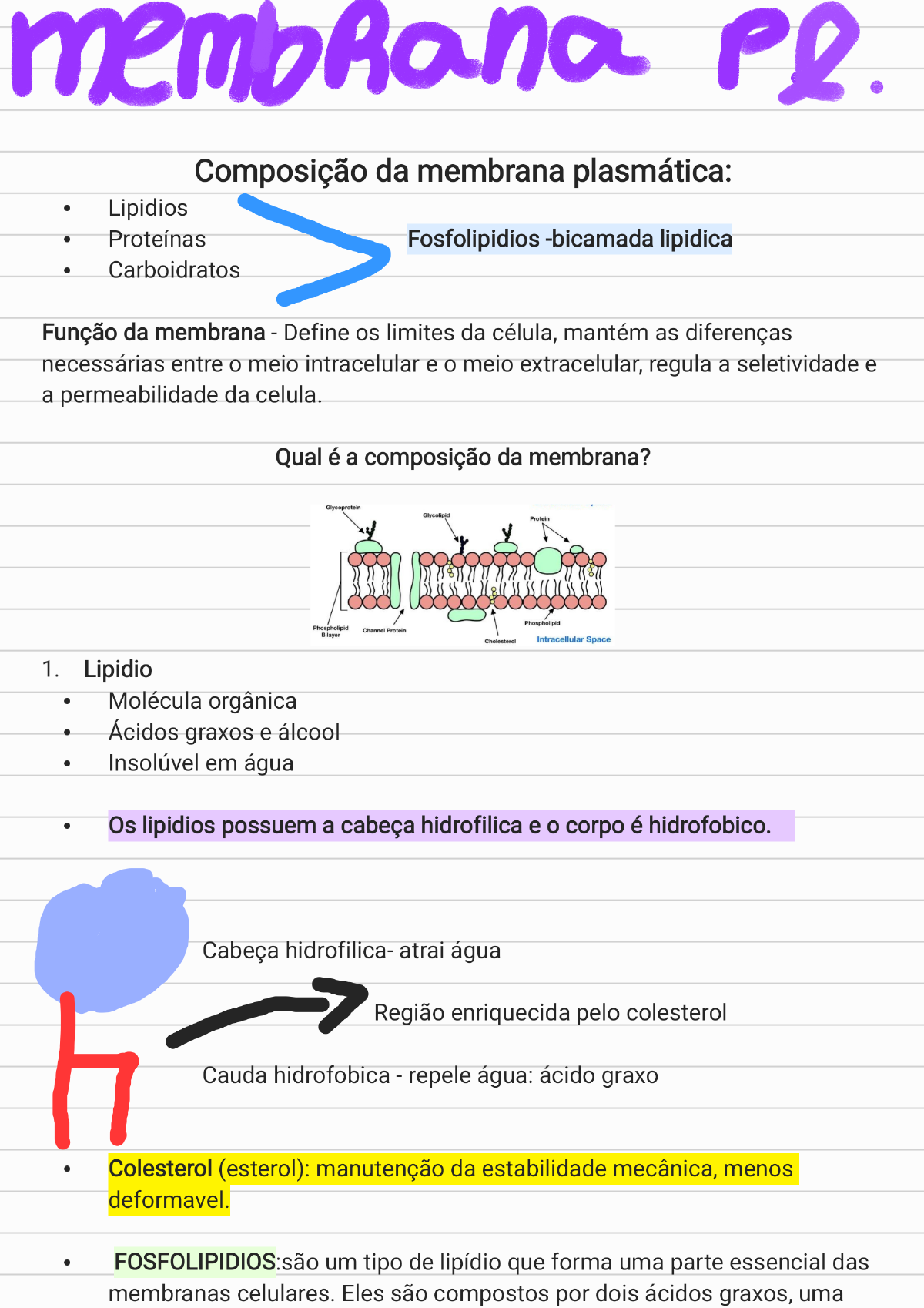 <p>pl Composição da membrana plasmática: Lipidios Proteínas Fosfolipidios -bicamada lipidica Carboidratos Função da membrana - Define os limites da célula, mantém as diferenças necessárias entre o meio intracelular e o meio extracelular, regula a seletividade e a permeabilidade da celula. Qual é a composição da membrana? Glycoprotein Glycolipid Protein Phospholipid Phospholipid Channel Protein Bilayer Cholesterol Intracellular Space 1. Lipidio Molecula orgânica Ácidos graxos e álcool Insolúvel em água Os lipidios possuem a cabeça hidrofilica e o corpo é hidrofobico. Cabeça hidrofilica- atrai água Região enriquecida pelo colesterol Cauda hidrofobica - repele água: ácido graxo Colesterol (esterol): manutenção da estabilidade mecânica, menos deformavel. FOSFOLIPIDIOS:são um tipo de lipídio que forma uma parte essencial das membranas celulares. Eles são compostos por dois ácidos graxos, uma</p><p>molécula de glicerol e um grupo fosfato. A estrutura dos fosfolipídios permite que tenham uma cabeça hidrofílica (que atrai água) e duas caudas hidrofóbicas (que repelem a água). Essa característica é fundamental para a formação da bicamada lipídica nas membranas celulares, que atua como barreira semipermeável, regulando a passagem de substâncias para dentro e para fora da célula. Proteinas são macromoleculas fornadas por Aminoácidos. 1. A proteína integral: que entra na membrana e é inserida na bicamada participa do transporte entre as membranas. 2. A proteína periférica fica apenas em um dos lados da membrana fora da bicamada no meio extracelular. Suas funções incluem: Manutenção da Estrutura Celular: Elas ajudam a manter a integridade da estrutura da célula e da membrana, ligando-se ao citoesqueleto. Transdução de Sinais: Participam na transmissão de sinais do ambiente externo para o interior da célula. Celular: Facilitam a comunicação e interação entre células ou entre células e a matriz extracelular. Organização da Membrana: Auxiliam na organização e na formação de microdomínios na membrana. CARBOIDRATOS: Compostos orgânicos constituídos por carbono, hidrogênio e oxigênio, vira fonte de energia. Carboidratos proteínas Glicolipídios: lipídios ligados ligadas a carboidratos a carboidratos Bicamada fosfolipídica Proteína Colesterol Proteínas Proteína de canal periférica integrais Filamentos de citoesqueleto Composição da membrana plasmática Glicocalice: Cobertura da membrana plasmática.</p><p>Funções: Adesão Proteção química e mecanica Reconhecimento Sinalização Redução do atrito Propriedades da membrana plasmática Fluidez ( Modelo do Mosaico Fluido). Assimetria - distribuição diferencial, fosfolipidios entre as monocamadas. Carboidratos somente na face externa da membrana (glicocalix), posicionamento variável das proteínas. Auto selagem: (buracos) que se fecham espontaneamente, realizando a formação de vesículas durante a fagocitose. Permeabilidade seletiva :afetada por atividades de transporte ou transportadores. Transporte através da membrana Transporte de moléculas ou ions separadamente Meios de transporte pela membrana: bicamada lipidica, proteinas transportadoras, vesículas membranosas. Transporte através da membrana Transporte passivo: Difusão simples -É a passagem de soluto do meio mais concentrado (hipertonico) para o meio menos concentrado (hipotonico) tornando assim os meios isotônicos (concentração iguais de solvente e</p><p>soluto) Ex: soluto (sal) + solvente (água) = solução (água com sal) Transporte passivo : difusão facilitada - Passagem de soluto do meio mais concentrado (hipertonico) para o meio menos concentrado (hiportonico), com o auxílio de proteínas de membrana ou permeases. Osmose: Não requer gasto energético, é a passagem do solvente através da membrana semipermeavel do meio hipotonico para o meio hipertonico. Transporte ativo : bomba de sódio e potássio Passagem contra o gradiente de concentração Gasto de Atp lons de potássio (K+) - maior concentração no meio intracelular lons de sódio (Na+) - maior quantidade meio extracelular Transporte Passivo Transporte Ativo Difusão simples Difusão Facilitada Transporte em massa : Endocitose :A endocitose é o processo pelo qual as</p><p>células "capturam" substâncias do exterior e as trazem para dentro. Imagine que a célula está fazendo uma refeição: ela se estende para envolver o que precisa, formando uma "bolha" ao redor da substância. Essa bolha, chamada vesícula, então se desprende da membrana da célula e leva o material para dentro dela. A endocitose é importante para a célula obter nutrientes, absorver sinais e eliminar resíduos. É como se a célula estivesse "comendo" ou "bebendo" o que está ao seu redor. fagocitose e pinocitose Fagocitose A fagocitose é um processo onde certas células do nosso corpo "engolem" e digerem partículas como germes ou restos de células. Essas células, chamadas fagócitos, ajudam a limpar e proteger o corpo de infecções e detritos. Imagine que essas células são como "lixeiras" que limpam a "sujidade" no corpo. Pinocitose (liquido): é como se a célula estivesse usando um canudo para "beber" pequenos pedaços de líquido ao seu redor. A célula faz uma pequena bolsa, pega o líquido e leva para dentro dela. É uma forma de a célula se alimentar e pegar coisas que precisa do ambiente ao seu redor. Exocitose: A exocitose é o processo pelo qual as células liberam substâncias para fora delas. Especializações da membrana - Especializações apiciais Microvilosidades e cílios</p><p>Especializações laterais: junções celulares Especializações basais: Invaginações ou reentrâncias Ex: Apiciais - vilosidades intestinais com a função de aumento de absorção dos nutrientes e aumento da superfície celular. Apiciais - Cílios, propulsão de muco como o epitélio ciliado da traqueia. Laterais : junção oclusiva, junção bloqueadora, 