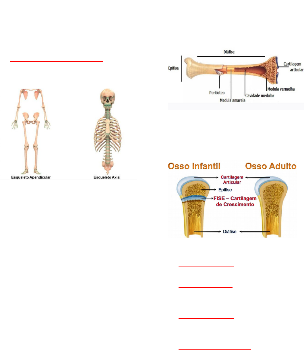 <p>Anatomia Humana</p><p>Anatomia do Crânio</p><p>Sistema esquelético</p><p>· Esqueleto axial: é formado pelos ossos da cabeça (crânio), pescoço (hioide e vértebras cervicais) e tronco (costelas, esterno, vértebras, sacro e cóccix).</p><p>· Esqueleto apendicular: formado pelos ossos dos membros inferiores.</p><p>Ossos</p><p>O osso é um tecido vivo, de forma rígida e altamente especializado em tecido conjuntivo.</p><p>Tem como função:</p><p>i. Sustentar o corpo e suas cavidades vitais</p><p>ii. Proteger as estruturas vitais</p><p>iii. Base mecânica do movimento</p><p>iv. Armazenamento de sais</p><p>v. Hematopoese (produção de novas células sanguíneas)</p><p>Os ossos podem ser classificados em osso compacto e osso esponjoso (trabecular). São distinguidos pela quantidade de material sólido e pelo número e tamanho dos espaços que contém.</p><p>Todos os ossos têm uma cavidade medular e espículas onde, entre elas, há medula óssea amarela e vermelha.</p><p>Em ossos infantis, os quais ainda irão crescer, há uma cartilagem de crescimento (metáfise). Ela localiza-se entre a epífise e a diáfise.</p><p>Tipos de ossos:</p><p>· Ossos longos: são tubulares, grandes em comprimento</p><p>· Ossos curtos: são cuboides e encontrados apenas no tarso (tornozelo) e no carpo (punho)</p><p>· Ossos planos: geralmente têm funções protetoras e são finos e compactos.</p><p>· Ossos irregulares: têm vários formatos além de longos, curtos e planos.</p><p>· Ossos sesamoides: desenvolvem-se em alguns tendões</p><p>· Ossos pneumáticos (ocos): permitem a passagem de ar através dos forames, tornando-os mais leves.</p><p>Acidentes ósseos</p><p>São formações que aparecem nos pontos de inserção de ligamentos, fáscias, tendões e no trajeto de vasos sanguíneos e nervos.</p><p>Ex: côndilo, fóvea, forame, crista etc.</p><p>Crânio</p><p>É constituído por 22 ossos que formam duas partes: neurocrânio e viscerocrânio.</p><p>O neurocrânio é a caixa óssea do encéfalo e das membranas que o revestem, as meninges cranianas. Contém as partes proximais dos nervos cranianos e a vascularização do encéfalo. Ele é formado por 8 ossos: 4 ossos ímpares centralizados na linha média (frontal, etmoide, esfenoide e occipital) e 2 pares de ossos bilaterais (temporal e parietal).</p><p>image1.png</p><p>image2.png</p><p>image3.png</p>
