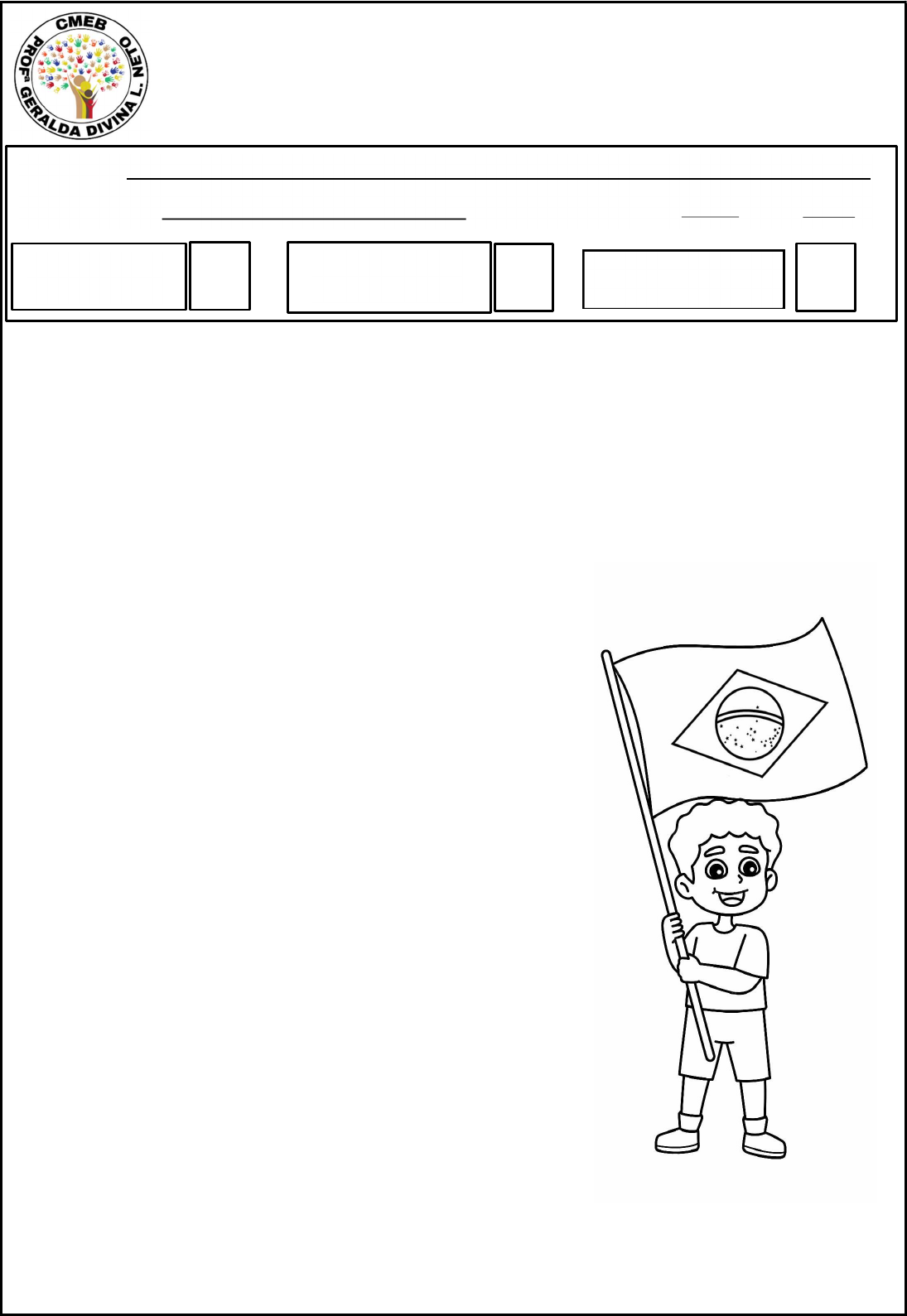 <p>CMEB PROFESSORA GERALDA DIVINA LOPES NETO</p><p>AVALIAÇÃO DE HISTÓRIA – 3° BIMESTRE</p><p>1- LEIA O POEMA ABAIXO.</p><p>ALUNO (A):</p><p>PROFESSOR(A): TURMA: _______ DATA ______/__________________/</p><p>QUALITATIVO</p><p>(60)</p><p>QUANTITATIVO</p><p>(40)</p><p>MÉDIA</p><p>CIDADÃO, CIDADANIA</p><p>Regina Célia Villaça</p><p>O QUE É SER CIDADÃO?</p><p>É NASCER, TER UM NOME,</p><p>TER FAMÍLIA, TER ONDE MORAR!</p><p>MUITOS NASCEM APENAS...</p><p>NÃO TEM NOME E NEM SOBRENOME</p><p>NÃO CONHECEM A FAMÍLIA</p><p>NÃO TÊM UM LAR PARA MORAR</p><p>NEM COMIDA E ESCOLA, NEM ONDE TRABALHAR.</p><p>É O ZÉ, A MARIA,</p><p>O JOÃO, A TIANA.</p><p>MORAM AO LÉU,</p><p>DEBAIXO DAS PONTES</p><p>SONHAM UM DIA</p><p>TER UM DOCUMENTO,</p><p>SABER ASSINAR</p><p>E TER UM LUGAR DIGNO PARA MORAR.</p><p>CONSEGUIR UM TRABALHO HONESTO</p><p>COLOCAR OS FILHOS NA ESCOLA.</p><p>PODER DIZER COM ORGULHO:</p><p>SOU CIDADÃO BRASILEIRO!</p><p>1) SEGUNDO O TEXTO, O QUE É SER CIDADÃO?</p><p>________________________________________________________________________</p><p>________________________________________________________________________</p><p>________________________________________________________________________</p><p>2) MARQUE A ALTERNATIVA QUE INDICA O OBJETIVO PELO QUAL AS PESSOAS</p><p>PROCURAM TRABALHO HOJE EM DIA?</p><p>A) PARA SE DIVERTIR.</p><p>B) PARA GARANTIR O SEU SUSTENTO E DE SUA FAMÍLIA.</p><p>C) PARA OCUPAR O TEMPO LIVRE.</p><p>D) PARA CONHECER PESSOAS NOVAS.</p><p>3) O TRABALHO É ESSENCIAL PARA O EXERCÍCIO DA CIDADANIA, MAS TER</p><p>DOCUMENTOS TAMBÉM É FUNDAMENTAL PARA A VIDA EM SOCIEDADE.</p><p>SABENDO DISSO, MARQUE A OPÇÃO QUE INDICA O PRIMEIRO DOCUMENTO DE</p><p>UM CIDADÃO.</p><p>A) TITULO DE ELEITOR</p><p>B) CARTEIRA NACIONAL DE HABILITAÇÃO (CNH)</p><p>C) CERTIDÃO DE NASCIMENTO</p><p>D) CARTEIRA DE TRABALHO</p><p> LEIA O TEXTO ABAIXO PARA RESPONDER AS QUESTÕES:</p><p>O TEMPO PASSOU E O TRABALHO MUDOU</p><p>O TRABALHO É ESSENCIAL PARA A SOBREVIVÊNCIA HUMANA, POIS É POR</p><p>MEIO DELE QUE CONSEGUIMOS OBTER OS RECURSOS PARA ALIMENTAÇÃO,</p><p>MORADIA, VESTUÁRIO E OUTRAS NECESSIDADES.</p><p>O TRABALHO RURAL É UM DOS MAIS ANTIGOS E SE DESENVOLVE NA</p><p>EXPLORAÇÃO DOS RECURSOS NATURAIS (TERRA E ÁGUA) PARA PROMOVER</p><p>AS ATIVIDADES DE PLANTIO, COLHEITA E CRIAÇÃO DE ANIMAIS, VISANDO</p><p>PRINCIPALMENTE A ALIMENTAÇÃO.</p><p>DEPENDENDO DAS DEMANDAS E DOS INTERESSES HUMANOS, HÁ</p><p>PROFISSÕES QUE EXISTIAM NO PASSADO E QUE NÃO POSSUEM MAIS</p><p>UTILIDADE ATUALMENTE. PODE-SE CITAR A PROFISSÃO DE ACENDEDOR DE</p><p>POSTES QUE EXECUTAVA O ACENDIMENTO MANUAL DE LAMPARINAS, JÁ QUE</p><p>NÃO HAVIA CIRCUITOS DE REDE ELÉTRICA. COM A DISSEMINAÇÃO E</p><p>POPULARIZAÇÃO DA ELETRICIDADE A PROFISSÃO NÃO ERA MAIS</p><p>NECESSÁRIA.</p><p>POR OUTRO LADO, HÁ PROFISSÕES MUITO ANTIGAS QUE RESISTEM AO</p><p>TEMPO, POIS SÃO INDISPENSÁVEIS INDEPENDENTEMENTE DO PERÍODO</p><p>HISTÓRICO VIVIDO, COMO A PROFISSÃO DE COZINHEIRO, POR EXEMPLO.</p><p>ALGUMAS PROFISSÕES TIVERAM QUE SE ADAPTAR ÀS NOVAS TECNOLOGIAS,</p><p>POIS OS INSTRUMENTOS NECESSÁRIOS PARA A EXECUÇÃO DAS ATIVIDADES</p><p>MODIFICARAM CONSIDERAVELMENTE. O SURGIMENTO DA REDE MUNDIAL DE</p><p>COMPUTADORES EXIGIU QUE MUITOS PROFISSIONAIS DOMINASSEM O USO</p><p>DE COMPUTADORES E, PARA ISSO, HOUVE A PROCURA POR CURSOS DE</p><p>CAPACITAÇÃO E ESPECIALIZAÇÃO.</p><p>4) SEGUNDO O TEXTO, A PROFISSÃO DE ACENDEDOR DE POSTES DEIXOU DE</p><p>EXISTIR, POIS COM A POPULARIZAÇÃO DA REDE ELÉTRICA ELA NÃO ERA MAIS</p><p>NECESSÁRIA. QUAL PROFISSÃO VOCÊ ACHA QUE PODE NÃO SER MAIS</p><p>NECESSÁRIA DAQUI HÁ ALGUNS ANOS E PORQUÊ?</p><p>________________________________________________________________________</p><p>________________________________________________________________________</p><p>________________________________________________________________________</p><p>5) DE ACORDO COM O TEXTO, O TRABALHO RURAL É UM DOS MAIS ANTIGOS MAS</p><p>QUE TAMBÉM ESTÁ SE MODERNIZANDO. ESCREVA NAS IMAGENS ABAIXO AS</p><p>DIMENSÕES TEMPORAIS DE CADA UMA, OU SEJA, SE ESTÁ NO PRESENTE OU</p><p>NO PASSADO.</p><p> LEIA O TEXTO ABAIXO E RESPONDA AS QUESTÕES:</p><p>A INDEPENDÊNCIA DO BRASIL FOI UM EVENTO MUITO IMPORTANTE NA HISTÓRIA</p><p>DO NOSSO PAÍS. O BRASIL ERA UMA COLÔNIA DE PORTUGAL E, NO INÍCIO DO</p><p>SÉCULO XIX, COMEÇOU A LUTAR POR SUA LIBERDADE.</p><p>EM 1822, O PRÍNCIPE DOM PEDRO, QUE ERA FILHO DO REI DE PORTUGAL, DECIDIU</p><p>QUE O BRASIL PODERIA SE TORNAR UM PAÍS INDEPENDENTE. A FAMOSA FRASE</p><p>“INDEPENDÊNCIA OU MORTE!” FOI PROCLAMADA POR ELE NO DIA 7 DE</p><p>SETEMBRO. ESTE ATO SIMBOLIZOU A VONTADE DE UM POVO QUE QUERIA SE</p><p>GOVERNAR E CONSTRUIR UMA NAÇÃO PRÓPRIA, LIVRE DO DOMÍNIO</p><p>PORTUGUÊS.</p><p>APÓS A INDEPENDÊNCIA, A NOVA NAÇÃO ENFRENTOU MUITOS DESAFIOS, COMO</p><p>A NECESSIDADE DE CRIAR LEIS E UM GOVERNO QUE FUNCIONASSE. APESAR</p><p>DAS DIFICULDADES, A INDEPENDÊNCIA FOI UM PASSO FUNDAMENTAL PARA QUE</p><p>O BRASIL SE TORNASSE UM PAÍS SOBERANO.</p><p>6) QUAL ERA A DATA DA INDEPENDÊNCIA DO BRASIL?</p><p>A) 1 DE JANEIRO DE 1855</p><p>B) 7 DE SETEMBRO DE 1822</p><p>C) 15 DE NOVEMBRO DE 1889</p><p>D) 12 DE OUTUBRO DE 1800</p><p>7) QUEM PROCLAMOU A INDEPENDÊNCIA DO BRASIL?</p><p>A) DOM JOÃO VI</p><p>B) DOM PEDRO I</p><p>C) TIRADENTES</p><p>D) PEDRO ÁLVARES CABRAL</p><p>8) QUAL FRASE FICOU FAMOSA DURANTE A INDEPENDÊNCIA?</p><p>A) “LIBERDADE VEM A MIM.”</p><p>B) “INDEPENDÊNCIA OU MORTE!”</p><p>C) “BRASIL, UM PAÍS LIVRE!”</p><p>D) “ORDEM E PROGRESSO.”</p><p>BOA SORTE!</p>
