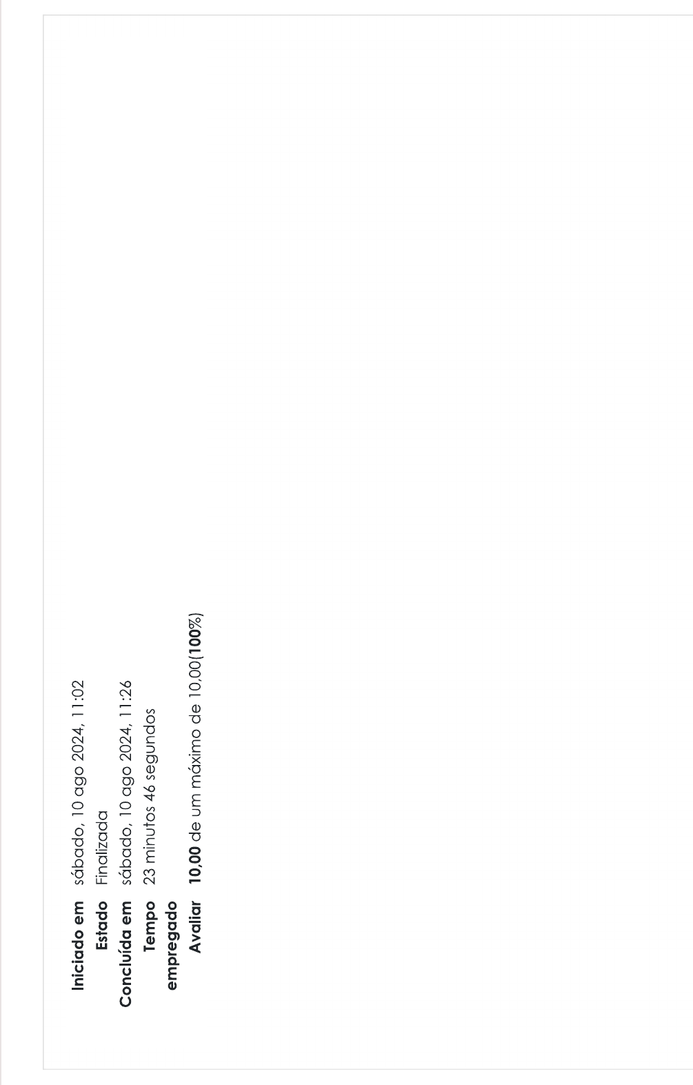 <p>Iniciado em sábado, 10 ago 2024, 11:02 Estado Finalizada Concluída em sábado, 10 ago 2024, 11:26 Tempo 23 minutos 46 segundos empregado Avaliar 10,00 de um máximo de 10,00(100%)</p><p>Questão 1 Correto Atingiu 1,00 de 1,00 Com base nos assuntos estudados nesta aula, marque a ordem certa que relaciona cada palavra com seu significado: A) Taxa B) Juros C) Montante D) Capital ( ) valor aplicado em alguma operação financeira ( ) remuneração pelo empréstimo do dinheiro representação do juro em forma porcentual (%) ( ) soma do capital com juro Escolha uma opção: a. B, C, D, A b. C, D, A, B C. D, B, A, d. A, B, D, C</p><p>Questão 2 Correto Atingiu 1,00 de 1,00 Se você tivesse um aumento salarial de 15% em um salário de $800, quanto seria seu novo salário? a. $880 b. $920 C. $915 d. $850 Questão 3 Correto Atingiu 1,00 de 1,00 Qual é 20% de 150? a. 20 b. 35 C. 25 d. 30</p><p>Questão 4 Correto Atingiu 1,00 de 1,00 Coloque em prática que você aprendeu sobre a equivalência de taxa e período: calcule 24% a.m. e período em 2 anos. Escolha uma opção: a. 12 meses b.2 meses C. 24 meses d. 10 meses</p><p>Questão 5 Correto Atingiu 1,00 de 1,00 Em uma turma de 40 alunos, 70% dos estudantes passaram no exame. Quantos alunos passaram? a. 20 b. 28 C. 25 d. 30</p><p>Questão 6 Correto Atingiu 1,00 de 1,00 Verifique se a questão é verdadeira ou falsa e indique a ordem correta da resposta: ( ) Montante é nome que se dá a valor acumulado ( ) prazo se define a partir de dias, semanas e horas ( ) nome da quantia empregada é taxa ( ) Encargos financeiros são juros ou taxas cobrados pelas instituições Escolha uma opção: a. V, F, V, F b. F C. V d. F, F, V, F</p><p>Questão 7 Correto Atingiu 1,00 de 1,00 Relacione as colunas de acordo com que representam: Como se define prazo Dias, meses e anos Nome que se dá a valor acumulado (capital+juro) Montante Nome da quantia empregada Capital Encargos financeiros Juros ou taxas cobrados pelas instituições</p><p>Questão 8 Correto Atingiu 1,00 de 1,00 Assinale a alternativa correta a respeito de juros: Escolha uma opção: a. Juros são somente recompensas ou bonificações recebidas. b. Juros podem ser calculados por juros simples ou composto. C. Taxa de juros não se relaciona a unidade de tempo. d. Juro é uma aplicação financeira criada na modernidade.</p><p>Questão 9 Correto Atingiu 1,00 de 1,00 Qual valor final de um capital no valor de R$150,00, aplicado por 4 anos, a uma taxa de 5% ao ano? Utilize regime de juros simples. Escolha uma opção: a. R$ 162,00 b. R$ 160,00 C. R$ $ 182,00 d. R$ 180,00</p><p>Questão 10 Correto Atingiu 1,00 de 1,00 Uma loja de roupas está dando 30% de desconto em uma calça que custa $70. Quanto custará a calça após desconto? a. $45 b. $49 C. $50 d. $40 2.2 Conceitos da matemática financeira Seguir para... 2.4 Juros Simples Baixar aplicativo móvel.</p>