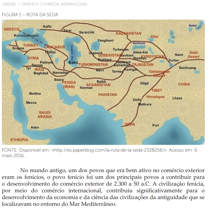 <p>UNIDADE DINAMICA COMERCIAL INTERNACIONAL FIGURA 1 - ROTA DA SEDA Kaffa GREECE Saral KAZAKHSTAN Konstantinople Altai Yangikent TURKEY Smyma Tbilisi Turkestan Urgench Alma-Ata Gobi Nami SYRIA Bukhara Bishkek KYRGYSTAN Desert Palmyr Baku Damas TURKMENISTAN JAJIKISTAN Tyr IRAQ Dunhuang Merv Kashga Namadap Baghdad Desert Basra PERSIA Balkh AFGANISTAN Gilgit CHINA (IRAN) Kerman TIBET Medina PAKISTAN Himalayas Lhaza Delhi Mecca Mathura SAUDI ARABIA INDIA Puri Aden ETHIOPIA Disponível Acesso em: 6 maio 2016. No mundo antigo, um dos povos que era bem ativo no comércio exterior eram os fenícios, o povo fenício foi um dos principais povos a contribuir para desenvolvimento do comércio exterior de 2.300 a 50 a.C. A civilização fenícia, por meio do comércio internacional, contribuiu significativamente para o desenvolvimento da economia e da ciência das civilizações da antiguidade que se localizavam no entorno do Mar Mediterrâneo.</p>