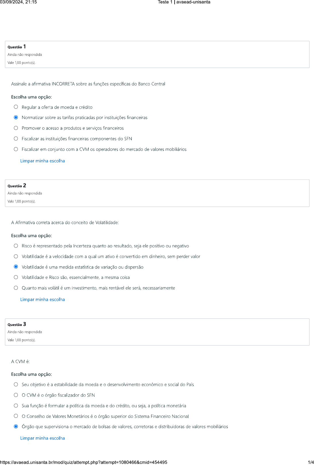 <p>03/09/2024, 21:15 Teste 1 avaead-unisanta Questão 1 Ainda não respondida Vale 1,00 ponto(s). Assinale a afirmativa INCORRETA sobre as funções específicas do Banco Central Escolha uma opção: Regular a oferta de moeda e crédito Normatizar sobre as tarifas praticadas por instituições financeiras Promover acesso a produtos e serviços financeiros Fiscalizar as instituições financeiras componentes do SFN Fiscalizar em conjunto com a CVM os operadores do mercado de valores mobiliários Limpar minha escolha Questão 2 Ainda não respondida Vale 1,00 ponto(s). A Afirmativa correta acerca do conceito de Volatilidade: Escolha uma opção: Risco é representado pela Incerteza quanto ao resultado, seja ele positivo ou negativo Volatilidade é a velocidade com a qual um ativo é convertido em dinheiro, sem perder valor Volatilidade é uma medida estatística de variação ou dispersão Volatilidade e Risco são, essencialmente, a mesma coisa Quanto mais volátil é um investimento, mais rentável ele será, necessariamente Limpar minha escolha Questão 3 Ainda não respondida Vale 1,00 ponto(s). A CVM é: Escolha uma opção: Seu objetivo é a estabilidade da moeda e desenvolvimento econômico e social do País O CVM é órgão fiscalizador do SFN Sua função é formular a política da moeda e do crédito, ou seja, a política monetária Conselho de Valores Monetários é órgão superior do Sistema Financeiro Nacional Órgão que supervisiona mercado de bolsas de valores, corretoras e distribuidoras de valores mobiliários Limpar minha escolha 1/4</p><p>03/09/2024, 21:15 Teste 1 avaead-unisanta Questão 4 Ainda não respondida Vale 1,00 Assinale a afirmativa INCORRETA: Escolha uma opção: Em via de regra, ativos mais voláteis tem maior potencial de retorno A lei da oferta e demanda afetam a liquidez dos ativos e, logo, seu potencial de retorno. A Volatilidade é uma medida genérica de risco, podendo haver outras formas de risco, que não reduz a importância da volatilidade. Com a diversificação é possível diminuir a volatilidade de uma carteira de investimentos, mas não eliminá-la Não há volatilidade na renda fixa Limpar minha escolha Questão 5 Ainda não respondida Vale 1,00 ponto(s). Sobre os Agentes do SFN assinale a afirmativa FALSA: Escolha uma opção: Bolsas de Valores são ambientes fictícios nos quais ativos de renda variável são, exclusivamente, negociados. As cooperativas são organizações sem fins lucrativos que atuam no Instituição de pagamento (IP) é a pessoa jurídica que viabiliza serviços de compra e venda e de movimentação de recursos, no âmbito de um arranjo de pagamento, sem a possibilidade de conceder empréstimos e financiamentos a seus clientes. Banco é a instituição financeira especializada em intermediar dinheiro entre poupadores e aqueles que precisam de empréstimos, além de custodian (guardar) esse dinheiro. Ele providencia serviços financeiros para os clientes (saques, empréstimos, investimentos, entre outros). As corretoras de títulos e valores mobiliários (CTVM) e as distribuidoras de títulos e valores mobiliários (DTVM) atuam nos mercados financeiro e de capitais e no mercado cambial intermediando a negociação de títulos e valores mobiliários entre investidores e tomadores de recursos. Limpar minha escolha 2/4</p><p>03/09/2024, 21:15 Teste 1 avaead-unisanta Questão 6 Ainda não respondida Vale 1,00 ponto(s). Acerca dos Agentes Normativos e Fiscalizadores do SFN assinale a alternativa INCORRETA: Escolha uma opção: A Comissão de Valores Mobiliários (CVM) foi criada em 07/12/1976 pela Lei 6.385/76, com objetivo de fiscalizar, normatizar, disciplinar e desenvolver mercado de valores mobiliários no Brasil. A SUSEP é órgão responsável pelo controle e fiscalização dos mercados de seguro, previdência privada aberta, capitalização e resseguro. O Conselho Monetário Nacional (CMN) é agente superior do Sistema Financeiro Nacional (SFN) e tem a responsabilidade de formular apenas a política monetária. Banco Central é uma autarquia federal ligada ao Ministério da Fazenda, que tem como missão garantir a estabilidade do poder de compra da moeda do país, Real, e assegurar a eficiência e bom funcionamento do mercado financeiro local. A CMN tem por objetivo a estabilidade da moeda (controlar a inflação e a volatilidade cambial) e O desenvolvimento econômico e social do país (mediante a defesa do poder de compra e acesso à crédito). Limpar minha escolha Questão 7 Ainda não respondida Vale 1,00 ponto(s). Acerca do que é Inflação, assinale a definição teórica CORRETA: Escolha uma opção: A inflação é uma média da variação de preços de uma cesta de produtos e serviços. A inflação mede quanto aumentou custo de vida dos brasileiros. A inflação é resultado da desvalorização cambial. A inflação é uma medida de desvio de preços para O consumidor comum. A inflação é uma medida usada como base para as taxas de juros. Limpar minha escolha Questão 8 Ainda não respondida Vale 1,00 ponto(s). Com relação ao CVM assinale a atribuição INCORRETA: Escolha uma opção: Estabelecer as taxas e corretagens cobradas por operações financeiras no mercado da bolsa. Liberar as Ofertas Públicas de Ações. pela transparência das informações no mercado de capitais. Fiscalizar agentes operadores como CTVMs e DTVMs. Prestar informações à justiça em caso de operações financeiras fraudulentas no mercado de valores mobiliários. Limpar minha escolha https://avaead.unisanta.br/mod/quiz/attempt.php?attempt=1080466&cmid=454495 3/4</p><p>03/09/2024, 21:15 Teste 1 I avaead-unisanta Questão 9 Ainda não respondida Vale 1,00 Assinale a alternativa CORRETA: Escolha uma opção: Não há risco de crédito na renda variável. A Volatilidade é uma medida estatística de risco, que generaliza, mas não abrange, todos os tipos de risco. Não há risco na renda fixa já que FGC cobre seu prejuízo. O r