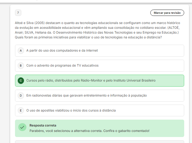 <p>7 Marcar para revisão Altoé e Silva (2005) destacam quanto as tecnologias educacionais se configuram como um marco histórico da evolução em acessibilidade educacional e vêm ampliando sua consolidação no cotidiano (ALTOÉ, Anair; SILVA, Heliana da. Desenvolvimento Histórico das Novas Tecnologias e seu Emprego na Educação.) Quais foram as primeiras iniciativas para viabilizar uso de tecnologias na educação a distância? A A partir do uso dos computadores e da internet B Com advento de programas de TV educativos Cursos pelo rádio, pelo Rádio-Monitor e pelo Instituto Universal Brasileiro D Em radionovelas diárias que geravam entretenimento e informação à população E uso de apostilas viabilizou dos cursos à distância Resposta correta Parabens, você selecionou a alternativa correta. Confira gabarito comentado!</p>