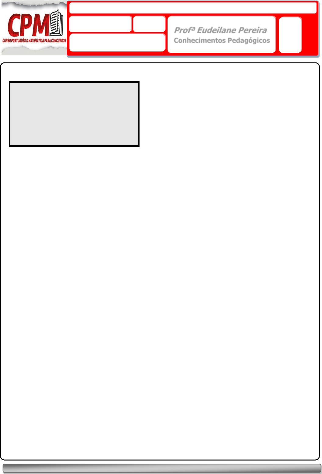 <p>Página(s): 1 de 4</p><p>Futuro Aprovado:</p><p>Data:</p><p>Turma:</p><p>Turno:</p><p>Profª Eudeilane Pereira</p><p>Conhecimentos Pedagógicos</p><p>P</p><p>ro</p><p>fe</p><p>s</p><p>s</p><p>o</p><p>r:</p><p>1. As concepções de educação e escola podem variar</p><p>amplamente de acordo com as perspectivas</p><p>filosóficas, culturais e contextuais. Considerando a</p><p>educação como Construção de Significado, a escola</p><p>é</p><p>A) vista como um ambiente que fornece</p><p>oportunidades para os alunos explorarem,</p><p>questionarem e produzir seu próprio</p><p>conhecimento.</p><p>B) vista como um espaço de conscientização e de</p><p>ação.</p><p>C) vista como um ambiente que promove a</p><p>autorrealização e o florescimento dos alunos.</p><p>D) um local que desempenha um papel importante</p><p>na preservação e na transmissão da herança</p><p>cultural.</p><p>2. A escola desempenha um papel fundamental na</p><p>sociedade, e os educadores têm um compromisso</p><p>social importante em relação à sua função. Eles</p><p>não apenas transmitem conhecimento, mas</p><p>também</p><p>A) vendem produtos para conseguir fundos para</p><p>comprar material escolar para as crianças. B) lutam</p><p>para que todos os estudantes vivam em um</p><p>ambiente familiar de paz .</p><p>C) promovem a aprendizagem dos alunos,</p><p>adaptando métodos de ensino às necessidades</p><p>individuais e às características da classe.</p><p>D) Investem financeiramente em projetos para a</p><p>compra de computadores e de materiais de</p><p>tecnologia e de inovação.</p><p>3. A mediação entre professor e aluno, os</p><p>procedimentos metodológicos e a abordagem da</p><p>teoria da atividade são elementos importantes na</p><p>educação. Considerando esses elementos, assinale</p><p>a alternativa correta.</p><p>A) Na teoria da atividade, os alunos são vistos</p><p>como agentes ativos que resolvem as atividades e</p><p>os problemas por meio de práticas de</p><p>memorização específicas.</p><p>B) A mediação é o processo pelo qual o professor</p><p>facilita a aprendizagem do aluno, auxiliando-o na</p><p>compreensão de conceitos, na resolução de</p><p>problemas e no desenvolvimento de habilidades.</p><p>C) Diferentes métodos e abordagens pedagógicas</p><p>podem ser adotados, independente dos objetivos</p><p>de aprendizado, do contexto educacional e das</p><p>características dos alunos.</p><p>D) A escolha dos procedimentos metodológicos</p><p>deve ser feita de forma que leve em consideração</p><p>a adequação ao conteúdo e a motivação dos</p><p>resultados que são esperados pela escola.</p><p>4. O núcleo do trabalho educativo é o processo de</p><p>ensino‐aprendizagem. Ensinar bem visando à</p><p>formação global do educando é a função essencial</p><p>da escola. Nesse processo assume significado</p><p>relevante a questão da produção do</p><p>conhecimento. Com base na questão do processo</p><p>ensino‐aprendizagem e na construção do</p><p>conhecimento, assinale a alternativa INCORRETA.</p><p>A) O conhecimento é apenas uma cópia, uma</p><p>fotografia da realidade, não envolvendo os saberes</p><p>que o aluno por ventura já tenha e nem a</p><p>participação do professor.</p><p>B) A questão da relação pedagógica entre o</p><p>professor que ensina e o aluno que aprende realça</p><p>CONTEUDOS COMUNS A TODOS OS</p><p>CARGOS</p><p>DIDATICA E O PROCESSO DE ENSINO – ES-</p><p>COLA E SOCIEDADE- TENDENCIAS PEDA-</p><p>GÓGICAS-AVALIAÇÃO – PLANEJA-</p><p>MENTO- PPP – GESTÃO DEMOCRÁTICA-</p><p>TEORIAS DA APRENDIZAGEM</p><p>Página(s): 2 de 4</p><p>a necessidade de se (re)significar a unidade entre</p><p>aprendizagem e ensino.</p><p>C) O professor tem que ter competência – “saber”</p><p>e “saber fazer” – que propicie uma intervenção</p><p>pedagógica eficaz no processo de ensino para o</p><p>aluno realizar atividades significativas.</p><p>D) Para se garantir um ensino e uma aprendizagem</p><p>de qualidade, a complexidade da atividade</p><p>docente exige que o professor tenha bem claro</p><p>“como o aluno aprende” e o “que ele aprende”.</p><p>5. As práticas pedagógicas formam o conjunto central</p><p>das atividades que propiciam a aprendizagem das</p><p>crianças e dos adolescentes dentro da escola. A</p><p>maior parcela de responsabilidade sobre o sucesso</p><p>ou fracasso da escola na aprendizagem de seus</p><p>alunos é atribuída a essas práticas. Considerando</p><p>as práticas pedagógicas, assinale a afirmativa</p><p>INCORRETA.</p><p>A) Para serem fortes e efetivas, as práticas</p><p>demandam uma atitude atenta e cuidadosa no</p><p>planejar, realizar e avaliar cada passo, com a</p><p>participação de todos.</p><p>B) As práticas pedagógicas são fruto da soma de</p><p>condições objetivas e do compromisso de todas as</p><p>pessoas participantes do cotidiano da escola com a</p><p>qualidade do ensino que será oferecido a cada</p><p>criança e adolescente.</p><p>C) Pensar a escola de forma isolada, limitar‐ se a</p><p>desenvolver formas diferenciadas de organização</p><p>do trabalho pedagógico, nas quais o docente</p><p>possa, individualmente, pensar alternativas</p><p>intencionais para a solução das questões que se</p><p>apresentam.</p><p>D) Fazem parte das condições objetivas da prática:</p><p>a formação inicial e continuada dos professores; a</p><p>capacitação dos funcionários; a definição clara dos</p><p>objetivos a que a escola se propõe em relação à</p><p>formação dos alunos; o acompanhamento e a</p><p>avaliação permanente do trabalho desenvolvido;</p><p>dentre outras.</p><p>6. As tendências pedagógicas são de extrema</p><p>relevância para a Educação, principalmente as</p><p>mais recentes, pois contribuem para a condução</p><p>de um trabalho docente mais consciente, baseado</p><p>nas demandas atuais da clientela em questão.</p><p>Reflita sobre as assertivas e assinale o item correto<