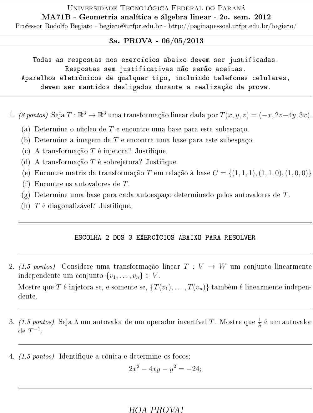<p>Universidade Tecnológica Federal do Paraná</p><p>MA71B - Geometria analítica e álgebra linear - 2o. sem. 2012</p><p>Professor Rodolfo Begiato - begiato@utfpr.edu.br - http://paginapessoal.utfpr.edu.br/begiato/</p><p>3a. PROVA - 06/05/2013</p><p>Todas as respostas nos exercícios abaixo devem ser justificadas.</p><p>Respostas sem justificativas não serão aceitas.</p><p>Aparelhos eletrônicos de qualquer tipo, incluindo telefones celulares,</p><p>devem ser mantidos desligados durante a realização da prova.</p><p>1. (8 pontos) Seja T : R3 → R3 uma transformação linear dada por T (x, y, z) = (−x, 2z−4y, 3x).</p><p>(a) Determine o núcleo de T e encontre uma base para este subespaço.</p><p>(b) Determine a imagem de T e encontre uma base para este subespaço.</p><p>(c) A transformação T é injetora? Justi�que.</p><p>(d) A transformação T é sobrejetora? Justi�que.</p><p>(e) Encontre matriz da transformação T em relação à base C = {(1, 1, 1), (1, 1, 0), (1, 0, 0)}</p><p>(f) Encontre os autovalores de T .</p><p>(g) Determine uma base para cada autoespaço determinado pelos autovalores de T .</p><p>(h) T é diagonalizável? Justi�que.</p><p>ESCOLHA 2 DOS 3 EXERCÍCIOS ABAIXO PARA RESOLVER</p><p>2. (1.5 pontos) Considere uma transformação linear T : V → W um conjunto linearmente</p><p>independente um conjunto {v1, . . . , vn} ∈ V .</p><p>Mostre que T é injetora se, e somente se, {T (v1), . . . , T (vn)} também é linearmente indepen-</p><p>dente.</p><p>3. (1.5 pontos) Seja λ um autovalor de um operador invertível T . Mostre que 1</p><p>λ</p><p>é um autovalor</p><p>de T−1.</p><p>4. (1.5 pontos) Identi�que a cônica e determine os focos:</p><p>2x2 − 4xy − y2 = −24;</p><p>BOA PROVA!</p>