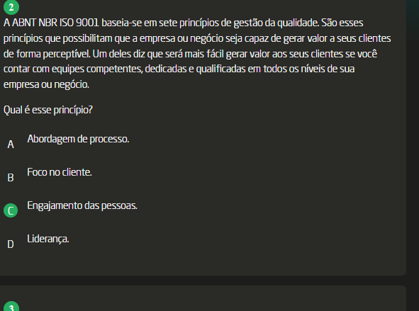 <p>2 A ABNT NBR ISO 9001 baseia-se em sete princípios de gestão da qualidade São esses princípios que possibilitam que a empresa ou negócio seja capaz de gerar valor a seus clientes de forma Um deles diz que será mais fácil gerar valor aos seus clientes se você contar com equipes competentes, dedicadas e qualificadas em todos os níveis de sua empresa ou negócio. Qual é esse princípio? A Abordagem de processo. Foco no cliente. B Engajamento das pessoas. D Liderança. 3</p>