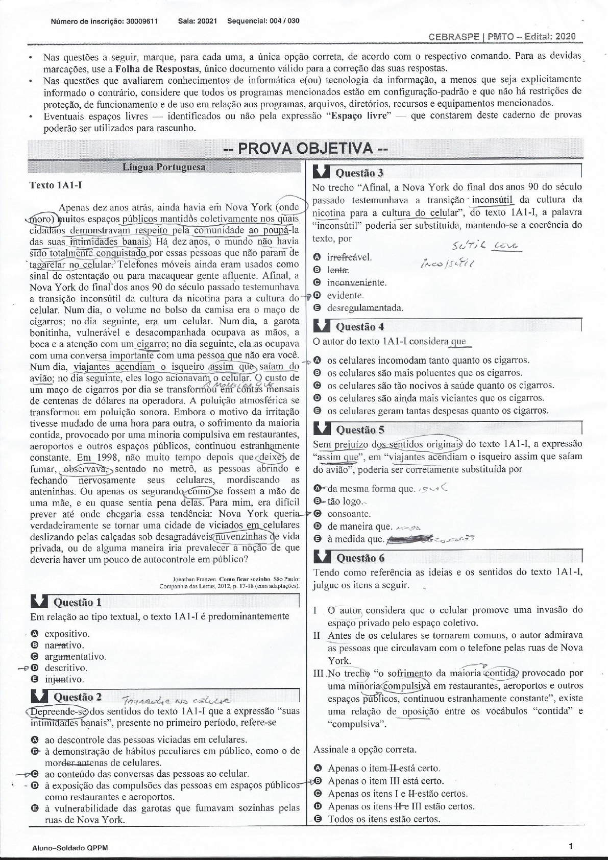 <p>Número de inscrição: 30009611 Sala: 20021 Sequencial: 004/030 CEBRASPE PMTO Edital: 2020 Nas questões a seguir, marque, para cada uma, a única opção correta, de acordo com o respectivo comando. Para as devidas marcações, use a Folha de Respostas, único documento válido para a correção das suas respostas. Nas questões que avaliarem conhecimentos de informática e(ou) tecnologia da informação, a menos que seja explicitamente informado o contrário, considere que todos os programas mencionados estão em configuração-padrão e que não há restrições de proteção, de funcionamento e de uso em relação aos programas, arquivos, diretórios, recursos e equipamentos mencionados. Eventuais espaços livres identificados ou não pela expressão "Espaço livre" que constarem deste caderno de provas poderão ser utilizados para rascunho. PROVA OBJETIVA -- Língua Portuguesa Questão 3 Texto 1A1-I No trecho "Afinal, a Nova York do final dos anos 90 do século passado testemunhava a transição inconsútil da cultura da Apenas dez anos atrás, ainda havia em Nova York (onde nicotina para a cultura do celular", do texto 1A1-I, a palavra moro) muitos espaços públicos mantidos coletivamente nos quais demonstravam respeito pela comunidade ao poupá-la "inconsútil" poderia ser substituída, mantendo-se a coerência do das suas intimidades banais.) Há dez anos, o mundo não havia texto, por sido totalmente por essas pessoas que não param de irrefreável. tagarelar no Telefones móveis ainda eram usados como lenta. sinal de ostentação ou para macaquear gente afluente. Afinal, a inconveniente. Nova York do dos anos 90 do século passado testemunhava a transição inconsútil da cultura da nicotina para a cultura do D evidente. celular. Num dia, o volume no bolso da camisa era o maço de E desregulamentada. cigarros; no dia seguinte, era um celular. Num dia, a garota Questão 4 bonitinha, vulnerável e desacompanhada ocupava as mãos, a boca e a atenção com um cigarro; no dia seguinte, ela as ocupava O autor do texto 1A1-I considera que com uma conversa importante com uma pessoa que não era você. os celulares incomodam tanto quanto os cigarros. Num dia, viajantes acendiam o isqueiro assim que saíam do avião; no dia seguinte, eles logo acionavam o celular. custo de os celulares são mais poluentes que os cigarros. um maço de cigarros por dia se transformou em contas mensais os celulares são tão nocivos à saúde quanto os cigarros. de centenas de dólares na operadora. A poluição atmosférica se D os celulares são ainda mais viciantes que os cigarros. transformou em poluição sonora. Embora o motivo da irritação E os celulares geram tantas despesas quanto os cigarros. tivesse mudado de uma hora para outra, o sofrimento da maioria contida, provocado por uma minoria compulsiva em restaurantes, Questão 5 aeroportos e outros espaços públicos, continuou estranhamente Sem prejuízo dos sentidos originais do texto 1A1-I, a expressão constante. Em 1998, não muito tempo depois que de "assim que", em "viajantes acendiam o isqueiro assim que saíam fumar, observava, sentado no metrô, as pessoas abrindo e do poderia ser corretamente substituída por fechando nervosamente seus celulares, mordiscando as anteninhas. Ou apenas os segurando como se fossem a mão de da mesma forma que. uma mãe, e eu quase sentia pena delas. Para mim, era difícil tão prever até onde chegaria essa tendência: Nova York queria consoante. verdadeiramente se tornar uma cidade de viciados em celulares de maneira que. deslizando pelas sob de vida E à medida que. privada, ou de alguma maneira iria prevalecer a noção de que deveria haver um pouco de autocontrole em público? Questão 6 Tendo como referência as ideias e os sentidos do texto 1A1-I, Jonathan Franzen. Como ficar São Paulo: Companhia das Letras, 2012, p. 17-18 (com adaptações). julgue os itens a seguir. Questão 1 I O considera que o celular promove uma invasão do Em relação ao tipo textual, o texto 1A1-I é predominantemente espaço privado pelo espaço coletivo. expositivo. II Antes de os celulares se tornarem comuns, o autor admirava narrativo. as pessoas que circulavam com o telefone pelas ruas de Nova C argumentativo. York. descritivo. III No trecho sofrimento da maioria provocado por E injuntivo. uma em restaurantes, aeroportos e outros Questão 2 espaços continuou estranhamente constante", existe Depreende-s dos sentidos do texto 1A1-I que a expressão "suas uma relação de oposição entre os vocábulos "contida" e intimidades banais", presente no primeiro período, refere-se "compulsiva". A ao descontrole das pessoas viciadas em celulares. à demonstração de hábitos peculiares em público, como o de Assinale a opção correta. antenas de celulares. Apenas o certo. ao conteúdo das conversas das pessoas ao celular. D à exposição das compulsões das pessoas em espaços públicos Apenas o item III está certo. como restaurantes e aeroportos. Apenas os itens I e Hestão certos. à vulnerabilidade das garotas que fumavam sozinhas pelas D Apenas os itens He III estão certos. ruas de Nova York. Todos os itens estão certos. Aluno-Soldado QPPM 1</p><p>Número de inscrição: 30009611 Sala: 20021 Sequencial: CEBRASPE PMTO Edital: 2020 Texto 1A2-I Questão 7 Cada uma das opções a seguir apresenta uma proposta de O papel da polícia militar é exclusivamente o reescrita para o seguinte trecho do texto 1A1-I: "Embora o patrulhamento ostensivo. É por isso que essa é a anda motivo da irritação tivesse mudado de uma hora para fardada e caracterizada, mostrando sua presença ostensiva e sofrimento da maioria contida, / provocado por uma minoria passando segurança à sociedade. compulsiva em restaurantes, aeroportos e outros espaços 2 Nesse a polícia militar tem papel de públicos, continuourestranhamente constante.". Assinale a opção uma vez que se destaca, também, como força pública, primando que contém a prop