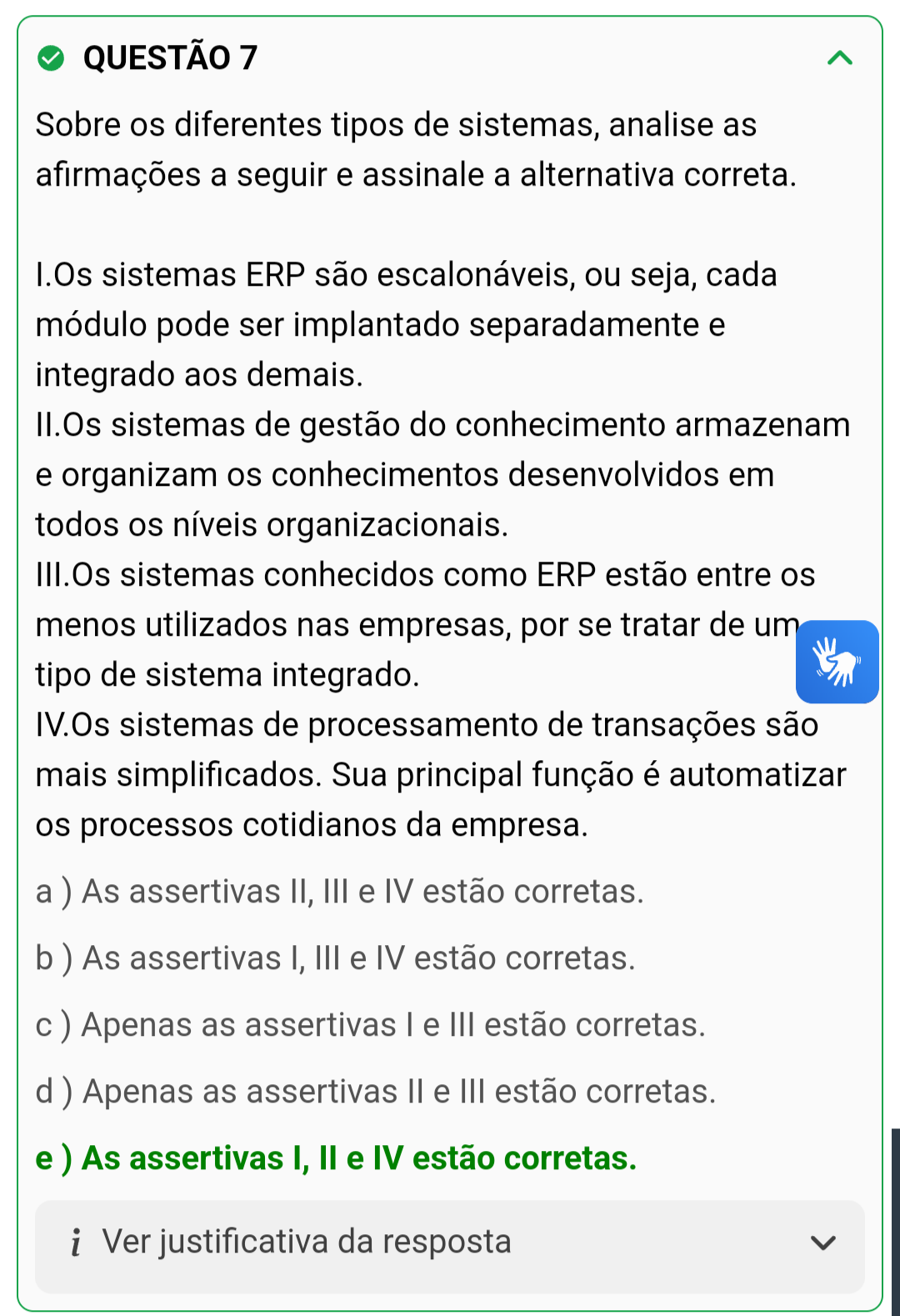 <p>QUESTÃO 7 Sobre os diferentes tipos de sistemas, analise as afirmações a seguir e assinale a alternativa correta. I.Os sistemas ERP são escalonáveis, ou seja, cada módulo pode ser implantado separadamente e integrado aos demais. II.Os sistemas de gestão do conhecimento armazenam e organizam os conhecimentos desenvolvidos em todos os níveis organizacionais. III.Os sistemas conhecidos como ERP estão entre os menos utilizados nas empresas, por se tratar de um tipo de sistema integrado. IV.Os sistemas de processamento de transações são mais simplificados. Sua principal função é automatizar os processos cotidianos da empresa. a ) As assertivas II, III e IV estão corretas. b) As assertivas I, III e IV estão corretas. c) Apenas as assertivas e III estão corretas. d ) Apenas as assertivas e III estão corretas. e) As assertivas I, II e IV estão corretas. i Ver justificativa da resposta</p>