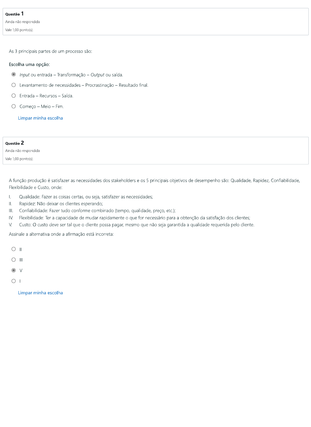 <p>Questão 1 Ainda não respondida Vale 1,00 ponto(s). As 3 principais partes de um processo são: Escolha uma opção: Input ou entrada - Transformação - Output ou saída. Levantamento de necessidades - Procrastinação - Resultado final. Entrada - Recursos Saída. Começo Meio - Fim. Limpar minha escolha Questão 2 Ainda não respondida Vale 1,00 ponto(s). A função produção é satisfazer as necessidades dos stakeholders e os 5 principais objetivos de desempenho são: Qualidade, Rapidez, Confiabilidade, Flexibilidade e Custo, onde: I. Qualidade: Fazer as coisas certas, ou seja, satisfazer as necessidades; II. Rapidez: Não deixar os clientes esperando; III. Confiabilidade: Fazer tudo conforme combinado (tempo, qualidade, preço, etc.); IV. Flexibilidade: Ter a capacidade de mudar rapidamente que for necessário para a obtenção da satisfação dos clientes; V. Custo: O custo deve ser tal que cliente possa pagar, mesmo que não seja garantida a qualidade requerida pelo cliente. Assinale a alternativa onde a afirmação está incorreta: III V Limpar minha escolha</p><p>Questão 3 Ainda não respondida Vale 1,00 ponto(s). Leia as afirmações abaixo: A função produção é a mais importante em uma organização. II. A função vendas e marketing é responsável por comunicar os produtos ou serviços de uma empresa ao mercado que irá comprá-los. III. A função desenvolvimento de produto ou serviço é responsável por criar novos produtos e serviços e modificá-los de acordo com as necessidades percebidas dos consumidores. IV. A função produção é responsável por produzir e entregar os bens e serviços que os clientes esperam. Assinale a alternativa onde a afirmação está incorreta: Escolha uma opção: III IV Limpar minha escolha Questão 4 Ainda não respondida Vale 1,00 ponto(s). Just in Time, Engenharia Simultânea, Tecnologia de grupo, Consórcio Modular, Células de produção, QFD, Co-fabricação, Sistemas flexíveis de manufatura, Manufatura integrada por computador e Benchmarking são: Escolha uma opção: Técnicas que devem sempre ser utilizadas separadamente. Conceitos utilizados na produção enxuta. Técnicas utilizadas somente em empresas fabricantes de veículos. Técnicas do mercantilismo. Limpar minha escolha</p><p>Questão 5 Ainda não respondida Vale 1.00 Observe as afirmações: I. Ford criou a linha de montagem em série; II. Produção em massa é mesmo que produção de grande quantidade de produtos padronizados ou praticamente iguais; III. A utilização de técnicas de controle estatístico passou a ser uma prática em função do aumento da produção em massa. IV. A produção enxuta não teve sua origem com aumento da produção em massa. Assinale a alternativa onde a afirmação está incorreta: Escolha uma opção: III IV Limpar minha escolha Questão 6 Ainda não respondida Vale 1,00 ponto(s). Escolha a alternativa que preencha as lacunas da frase: Os são as pessoas ou grupos que possuem interesse na produção e que podem ser influenciados ou influenciarem nas atividades da operação produtiva. Eles podem ser (empregados, etc.) e (sociedade, grupos comunitários, acionistas, fornecedores, etc.). Stakeholders - Internos - Externos Stakeholders - Operadores - Grupos gerais Compradores - Internos - Externos Gerentes Operadores - Grupos gerais Limpar minha escolha Questão 7 Ainda não respondida Vale 1,00 ponto(s). pai da administração científica é: Escolha uma opção: Whitney Ford Fayol Taylor Limpar minha escolha</p><p>Questão 8 Ainda não respondida Vale 1,00 ponto(s). Leia as afirmações abaixo: I. Shewart, Juran, Deming, Feigenbaum e Ishikawa são considerados gurus da qualidade por desenvolverem e/ou aperfeiçoarem técnicas para a garantia da qualidade; II. Entender as características dos clientes pode ser feito depois do produto ou serviço já estar disponível para venda; III. Clientes satisfeitos são fiéis; IV. A relação custo X benefício do que os clientes recebem é que define a opção de compra. Assinale a alternativa onde a afirmação está incorreta: Escolha uma opção: IV III Limpar minha escolha Questão 9 Ainda não respondida Vale 1,00 Quanto às 8 ferramentas de análise de análise e visualização do processo, não podemos afirmar que: Escolha uma opção: diagrama de fluxo de dados permite a visualização do processo quanto às suas entradas e saídas; diagrama de causa e efeito visa identificar as raízes dos problemas e como tais problemas afetam os processos; brainstorming não pode ser utilizado para processos relacionados a prestações de serviços. FMEA avalia tipos de falhas possíveis e permite uma análise dos possíveis efeitos. Limpar minha escolha Questão 10 Ainda não respondida Vale 1,00 ponto(s). Quanto ao TQM (Total Quality Management ou Gerenciamento da Qualidade Total), não podemos Escolha uma opção: É um modelo gerencial centrado no controle de processo e tem como meta, a satisfação das necessidades dos clientes. Acontece sem comprometimento da alta administração. Desenvolvido por Armand Vallin Feigenbaum. Nele deve haver O envolvimento de todas as pessoas e níveis hierárquicos em uma empresa sem exceções. Limpar minha escolha</p>