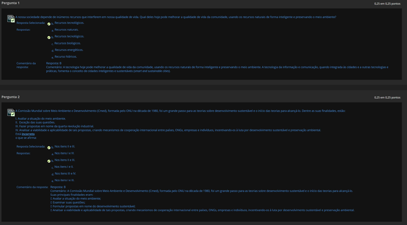<p>Pergunta 1 0,25 em 0,25 pontos A nossa sociedade depende de inúmeros recursos que interferem em nossa qualidade de vida. Qual deles hoje pode melhorar a qualidade de vida da comunidade, usando os recursos naturais de forma inteligente e preservando meio ambiente? Resposta Selecionada: b. Recursos tecnológicos. Respostas: a. Recursos naturais. b. Recursos tecnológicos. C. Recursos biológicos. d. Recursos energéticos. e. Recurso Comentário da Resposta: B resposta: Comentário: A tecnologia hoje pode melhorar a qualidade de vida da comunidade. usando os recursos naturais de forma inteligente e preservando meio ambiente. A tecnologia da informação e comunicação, quando integrada às cidades e a outras tecnologias e práticas, fomenta conceito de cidades inteligentes e sustentáveis (smart and sustainable cities). Pergunta 2 0.25 em 0,25 pontos A Comissão Mundial sobre Meio Ambiente e Desenvolvimento (Cmed), formada pelo ONU na década de 1980, foi um grande passo para as teorias sobre desenvolvimento sustentável e início das teorias para Dentre as suas finalidades, estão: I. Avaliar a situação do meio ambiente. II. Exceção das suas questões. III. Fazer propostas em nome da quarta revolução industrial. IV. Analisar a viabilidade e aplicabilidade de tais propostas, criando mecanismos de cooperação internacional entre países, empresas e indivíduos, incentivando-os à luta por desenvolvimento sustentável e preservação Está incorreto C que se afirma: Resposta Selecionada: b. Nos itens III. Respostas: a. Nos itens IV. b. Nos itens II III. Nos itens II. C. d. Nos itens III e IV. e. Nos itens e III. Comentário da resposta: Resposta: B Comentário: A Comissão Mundial sobre Meio Ambiente e Desenvolvimento (Cmed), formada pelo ONU na década de foi um grande passo para as teorias sobre desenvolvimento sustentável e início das teorias para Suas principais finalidades eram: a situação do meio ambiente: Examinar suas Formular propostas em nome do desenvolvimento sustentável: Analisar a viabilidade e aplicabilidade de tais propostas, criando mecanismos de cooperação internacional entre países, empresas e indivíduos, incentivando-os à luta por desenvolvimento sustentável e preservação</p><p>Pergunta 3 0,25 em 0,25 pontos Sediada pelo Rio de Janeiro ocorreu em 1992 a Conferência das Nações Unidas sobre Meio Ambiente e Desenvolvimento, popularmente conhecida como Eco-92. Foi a segunda grande reunião das Nações Unidas sobre meio ambiente e reuniu 178 Estados-nação. Qual é O documento mais importante da Eco-92? Resposta Selecionada: d. Agenda 21. Respostas: a Convenção da biodiversidade. b. Convenção da desertificação. C. Carta da terra. d. Agenda 21. e. A declaração do Rio sobre ambiente e desenvolvimento. Comentário da Resposta: D resposta: Comentário: documento mais importante da Eco-92 é a Agenda 21. Acordo entre 179 países que tentou planejar um desenvolvimento sustentável e abranger a gestão correta de recursos necessários ao desenvolvimento, considerando questões econômicas e sociais, responsabilizando os grupos envolvidos e estabelecendo um plano de implementação. Pergunta 4 0,25 em 0,25 pontos Esse setor gera um conflito de interesses muito grande entre número de empregos e impacto ambiental, sendo também que mais explora os recursos naturais e gera uma grande quantidade de resíduos. Trata-se de qual setor? Resposta Selecionada: a. Construção civil. Respostas: a. Construção civil. b. Hospitalar. C. Radioativos. d. Agrícola. e. Mineração. Comentário da Resposta: A resposta: Comentário: Apesar dos avanços, as práticas sustentáveis ainda se apresentam de forma lenta e sutil nas organizações. Na construção civil, por exemplo, um dos setores que mais explora os recursos naturais e que gera uma grande quantidade de a conscientização das empresas ainda não é satisfatória.</p><p>Pergunta 5 0,25 em 0,25 pontos Tecnologia que se refere ao processamento, análise e armazenamento de dados mais próximos de onde eles são gerados para permitir análises e respostas quase em tempo real. De qual tecnologia estamos falando? Resposta Selecionada: a. Computação de borda. Respostas: a. Computação de borda. b. Software. C. Tecnologias digitais. d. Análise de grande volume de e. Inteligência artificial. Comentário da Resposta: A resposta: Comentário: A computação de borda é muito importante e utilizada. Boa parte da tecnologia que usamos hoje para entretenimento e negócios, de sistemas de entrega de conteúdo e tecnologia inteligente, até jogos, 5G ou manutenção preditiva, incorpora alguma forma de tecnologia de computação de borda. Plataformas de streaming de músicas e vídeos, por exemplo, geralmente guardam informações em cache para reduzir a latência, oferecendo mais flexibilidade de rede quando se trata de demandas de tráfego do usuário. A computação de bordo é uma tecnologia que permite deslocar a capacidade computacional dos centros de dados para os extremos da rede, aumentar a velocidade e a diversificação do processamento em tempo real na localização real do sistema, que é necessário para aumentar a funcionalidade da Pergunta 6 0,25 em 0,25 pontos Sistema oriundo da palavra em inglês que significa "aglomerar", "agrupar", dentro da Tecnologia da Informação (TI), que significa integrar dois ou mais computadores para que trabalhem simultaneamente no processamento de uma determinada tarefa. De qual sistema estamos falando? Resposta Selecionada: Clusters. Respostas: a. Assinatura eletrônica. b. Gerenciamento de projetos. C. d. e. Comentário da Resposta: C resposta: Comentário: Frequentemente, clusters são desenvolvidos na vizinhança de universidades e institutos públicos de pesquisa, que provêm conhecimento, competência e infraestrutura necessária para inovação e empreendedorismo, sobretudo nos setores de alta tecnologia. Hoje as construtoras têm fomentado uma mudança nova e