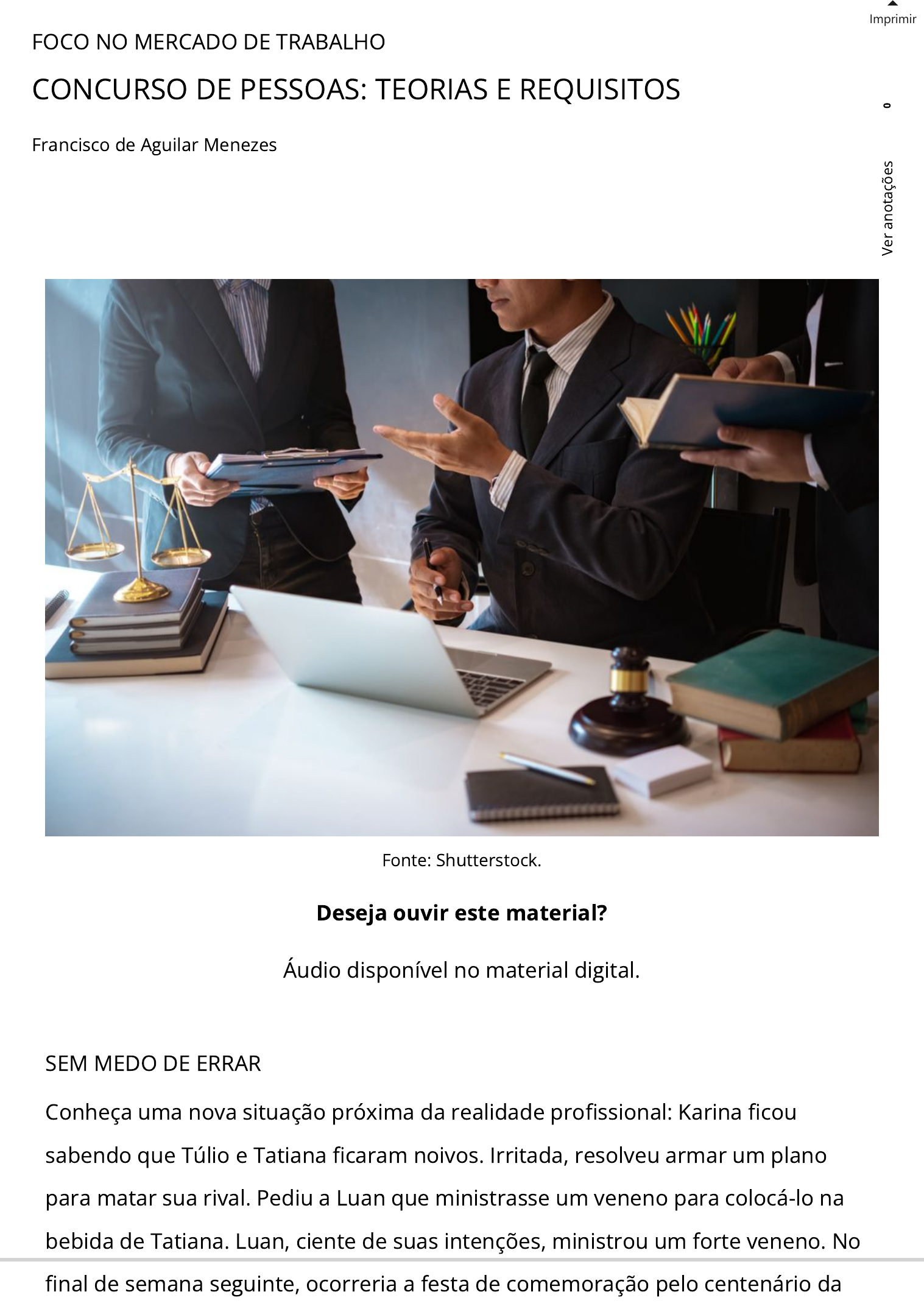 <p>07/04/2024, 20:32 lddkls212_teo_jur_dir_pen</p><p>https://www.colaboraread.com.br/integracaoAlgetec/index?usuarioEmail=thayssfernandaferraz%40gmail.com&usuarioNome=THAÍS+FERNANDA+FERRAZ&disciplinaDescricao=TEORIA+JURÍDICA+DO+DIREITO… 1/4</p><p>FOCO NO MERCADO DE TRABALHO</p><p>CONCURSO DE PESSOAS: TEORIAS E REQUISITOS</p><p>Francisco de Aguilar Menezes</p><p>Imprimir</p><p>SEM MEDO DE ERRAR</p><p>Conheça uma nova situação próxima da realidade pro�ssional: Karina �cou</p><p>sabendo que Túlio e Tatiana �caram noivos. Irritada, resolveu armar um plano</p><p>para matar sua rival. Pediu a Luan que ministrasse um veneno para colocá-lo na</p><p>bebida de Tatiana. Luan, ciente de suas intenções, ministrou um forte veneno. No</p><p>�nal de semana seguinte, ocorreria a festa de comemoração pelo centenário da</p><p>Fonte: Shutterstock.</p><p>Deseja ouvir este material?</p><p>Áudio disponível no material digital.</p><p>0</p><p>V</p><p>e</p><p>r</p><p>a</p><p>n</p><p>o</p><p>ta</p><p>çõ</p><p>e</p><p>s</p><p>07/04/2024, 20:32 lddkls212_teo_jur_dir_pen</p><p>https://www.colaboraread.com.br/integracaoAlgetec/index?usuarioEmail=thayssfernandaferraz%40gmail.com&usuarioNome=THAÍS+FERNANDA+FERRAZ&disciplinaDescricao=TEORIA+JURÍDICA+DO+DIREITO… 2/4</p><p>cidade, ocasião em que Karina pretendia colocar o plano em prática. Chegando à</p><p>festa, ela avistou Tatiana conversando com uma amiga e, aproveitando-se de sua</p><p>distração, colocou o veneno dentro de seu copo de suco. Tatiana, sentindo um</p><p>grande mal-estar, foi levada às pressas para o hospital, porém, em razão da</p><p>agilidade e e�cácia no atendimento, sobreviveu.</p><p>Houve concurso de pessoas entre Karina e Luan? Para responder a esta indagação,</p><p>você deverá compreender todos os requisitos do concurso de pessoas, bem como</p><p>assimilar a distinção entre autoria e participação.</p><p>LEMBRE-SE</p><p>O concurso de pessoas é a ciente e voluntária colaboração de duas ou mais</p><p>pessoas em uma mesma infração penal. Ainda, são requisitos do concurso</p><p>de pessoas: pluralidade de pessoas, pluralidade de condutas, identidade de</p><p>fato, nexo causal e liame subjetivo.</p><p>ATENÇÃO</p><p>O partícipe é aquele que possui uma conduta secundária e acessória ao</p><p>crime, auxiliando materialmente ou psicologicamente o autor. Neste esteio,</p><p>impende ressaltar que o partícipe não pratica o verbo-núcleo do tipo, bem</p><p>como não possui o domínio �nal ou funcional do fato.</p><p>No presente caso, houve pluralidade de pessoas e de conduta? Ambos incorreram</p><p>na prática de uma mesma infração penal? Houve nexo causal entre a conduta de</p><p>Karina e Luan e o resultado? Houve liame subjetivo entre ambos os</p><p>intervenientes?</p><p>Caso sejam a�rmativas as respostas anteriores, é possível de�nir se Karina e Luan</p><p>são autores ou partícipes? Como você analisa essas questões?</p><p>AVANÇANDO NA PRÁTICA</p><p>CONCURSO DE PESSOAS</p><p>0</p><p>V</p><p>e</p><p>r</p><p>a</p><p>n</p><p>o</p><p>ta</p><p>çõ</p><p>e</p><p>s</p><p>07/04/2024, 20:32 lddkls212_teo_jur_dir_pen</p><p>https://www.colaboraread.com.br/integracaoAlgetec/index?usuarioEmail=thayssfernandaferraz%40gmail.com&usuarioNome=THAÍS+FERNANDA+FERRAZ&disciplinaDescricao=TEORIA+JURÍDICA+DO+DIREITO… 3/4</p><p>Oscar colocou-se de tocaia atrás do portão de sua casa, a �m de atingir</p><p>mortalmente Amanda. Clara, sua esposa, percebendo as intenções do marido,</p><p>vendo o que ocorria e pretendendo ajudá-lo, colocou-se atrás da janela e disse: “se</p><p>ele não acertar, eu acerto”. Quando Amanda apareceu, ambos atiraram em sua</p><p>direção, e ela veio a falecer. Quando do exame de corpo de delito, chegou-se à</p><p>conclusão de que o projétil que a atingiu mortalmente veio da arma de Clara.</p><p>Resolva a questão à luz do concurso de pessoas.</p><p>LEMBRE-SE</p><p>O liame subjetivo (vínculo psicológico que une os agentes) é indispensável</p><p>para a con�guração do concurso de pessoas.</p><p>FAÇA VOCÊ MESMO</p><p>Pense na seguinte situação: Duarte instigou Clício a matar Sérgio por</p><p>envenenamento, e ambos decidiram que Clício ministraria o veneno no</p><p>suco da vítima. Feito o combinado, os dois se arrependeram, mas Sérgio</p><p>veio a falecer. Ocorre que, quando do exame de corpo de delito, constatou-</p><p>se ataque cardíaco como causa da morte . Como você resolveria a questão</p><p>RESOLUÇÃO</p><p>Não há concurso de pessoas, uma vez que não estão presentes os cinco</p><p>requisitos. Há pluralidade de agentes (Oscar e Clara), há pluralidade de</p><p>condutas (cada um disparou um tiro), há identidade de fato (ambos pretendem</p><p>matar a vítima), há nexo causal (o tiro foi a causa da morte de Amanda), mas</p><p>não há liame subjetivo, pois Oscar não sabia das intenções de Clara. Se o</p><p>projétil que atingiu a vítima tivesse saído da arma de Oscar, haveria concurso</p><p>de pessoas e Clara responderia pelo mesmo crime de Oscar na medida de sua</p><p>culpabilidade, conforme disciplina a teoria monista. Contudo, não foi o que</p><p>ocorreu, pois Oscar não aderiu à conduta de Clara. Assim, ela será autora do</p><p>crime de homicídio, e o marido responderá pela tentativa, já que o crime não</p><p>se consumou por circunstâncias alheias à sua vontade.</p><p>0</p><p>V</p><p>e</p><p>r</p><p>a</p><p>n</p><p>o</p><p>ta</p><p>çõ</p><p>e</p><p>s</p><p>07/04/2024, 20:32 lddkls212_teo_jur_dir_pen</p><p>https://www.colaboraread.com.br/integracaoAlgetec/index?usuarioEmail=thayssfernandaferraz%40gmail.com&usuarioNome=THAÍS+FERNANDA+FERRAZ&disciplinaDescricao=TEORIA+JURÍDICA+DO+DIREITO… 4/4</p><p>à luz do concurso de pessoas? Quem seria autor e quem seria partícipe?</p><p>Como �caria a questão do arrependimento de Duarte e Clício? Ainda, qual é</p><p>a consequência da causa da morte ter sido um ataque cardí