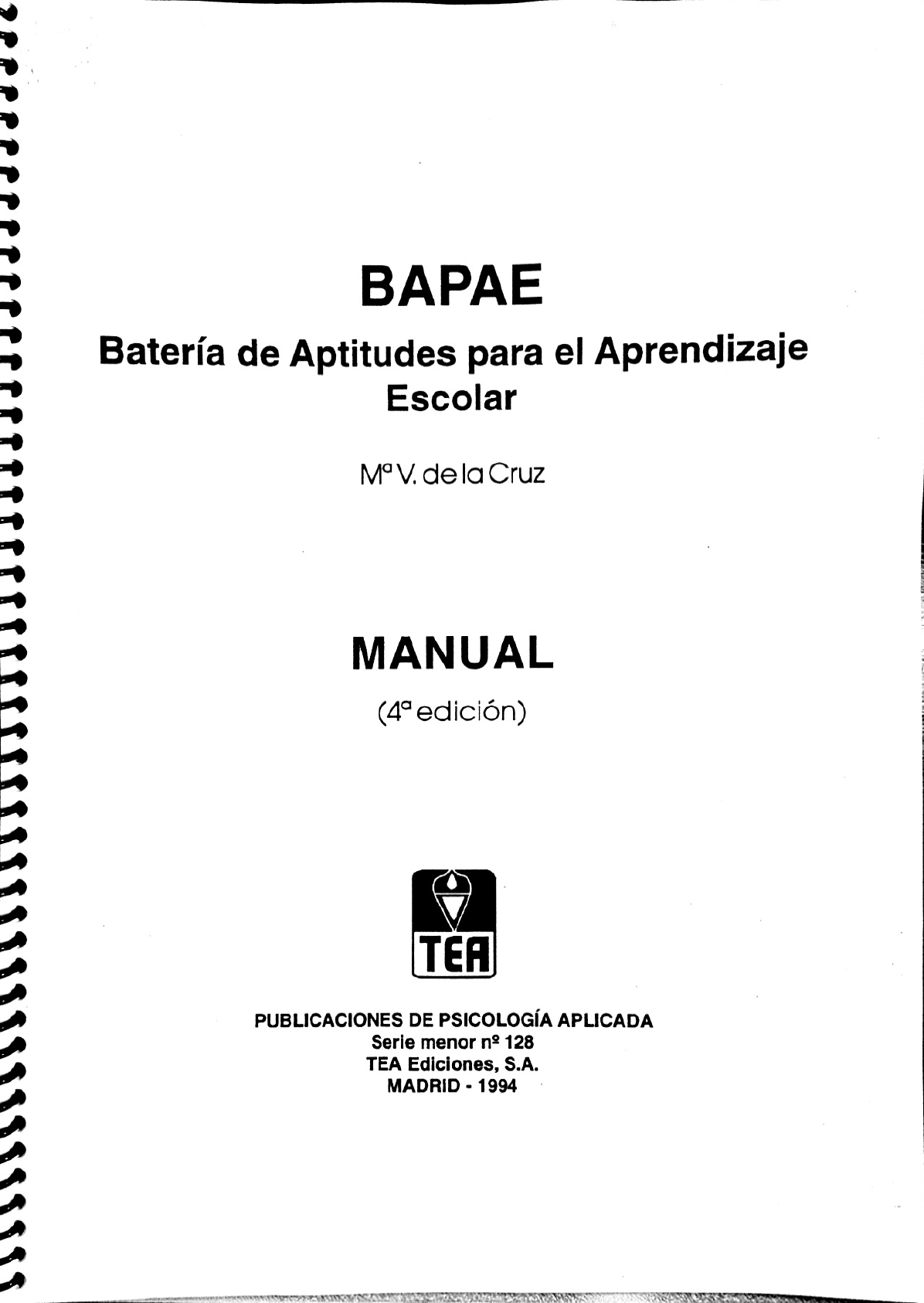 <p>BAPAE Batería de Aptitudes para el Aprendizaje Escolar Cruz MANUAL (4° edición) TEA PUBLICACIONES DE PSICOLOGÍA APLICADA Serie menor n° 128 TEA Ediciones, S.A. MADRID - 1994</p><p>INDICE Págs. INTRODUCCION 3 GENERALES 5 1.1 Ficha técnica 5 1.2 - Fundamentación teórica 5 1.3 - Elaboración de las pruebas 6 1.4 Aplicaciones 6 1.5 - Material 6 2. NORMAS DE APLICACION 7 2.1 Instrucciones generales 7 2.2 - Instrucciones específicas 7 3.-CORRECCION Y PUNTUACION 11 4.-JUSTIFICACION ESTADISTICA 11 4.1 Fiabilidad 11 4.2 Validez 12 5.-NORMAS INTERPRETATIVAS 13 5.1 - Muestra de tipificación 13 5.2 - Interpretación de las puntuaciones 13 BAREMOS 14 15</p><p>Introduccion En diversas ocasiones se nos han solicitado pruebas sencillas, de aplicación colectiva, que aprecien las aptitudes básicas requeridas para el aprendizaje en los primeros cursos escolares. Estas peticiones nos han impulsado a elaborar la presente Batería de Aptitudes para el Aprendizaje Escolar, que ofrece una evaluación de las aptitudes verbal, numérica, espacial y perceptiva y que se caracteriza por la facilidad y rapidez de aplicación. En el proceso de aplicación experimental y análisis de elementos hemos contado con la valiosa ayuda de María del Carmen Mazaira; también han colaborado en la aplicación Ana Calles, José Crespo y Flo- rentino Rodao y los colegios Agustin de Foxá, Alberto Alcocer, Bolivia, Carmen Cabezuelo, Lora Tamayo, Nuestra Señora del Lucero, II, Ramón María del Valle Inclán y Santa Marta de a todos ellos nuestro sincero agradecimiento. Victoria de la Cruz Sección de Estudios de Tests</p><p>1. Caracteristicas generales 1.1 - FICHA TECNICA Nombre: Batería de Aptitudes para el Aprendizaje Escolar (BAPAE). Autora: María Victoria de la Cruz. Procedencia: TEA Ediciones, S. A. (Madrid). Administración: Individual colectiva. Duración: Aproximadamente 60 minutos. Aplicación: Primer curso del Ciclo Inicial de EGB. Puntuación: Número de aciertos. Significación: Apreciación de algunas de las aptitudes que tienen influencia en el aprendizaje escolar. Tipificación: Muestras de escolares. 1.2 - FUNDAMENTACION TEORICA La elaboración de la Batería de Aptitudes para el ferencias individuales en el desarrollo de la actividad Aprendizaje Escolar (BAPAE) responde a la idea de de una clase hasta el punto de que muchos autores ofrecer un instrumento de fácil empleo que contribuya afirman que, si no se tienen en cuenta, pueden llevar al conocimiento de las características de un grupo o al fracaso los planes escolares elaborados con el mayor una clase y de los aspectos particulares de los alumnos cuidado. La moderna pedagogía admite la necesidad que la forman. Esta información, junto con otras con- de adaptar la enseñanza a estas diferencias de los alum- sideraciones, resultará muy útil a la hora de progra- nos, sin prescindir por ello de una educación integral mar la posibilitando su adaptación a las ca- con objetivos comunes para todos. racterísticas del grupo, de modo que sea posible incre- mentar el rendimiento del mismo. Con las pruebas que integran el BAPAE se aprecian: Los estudios realizados sobre algunos aspectos de la educación han demostrado la gran influencia de las di- Comprensión verbal: Vocabulario. 5</p><p>Aptitud numérica: Conceptos cuantitativos y ma- Estos aspectos se han considerado importantes para nejo de números. la adquisición de los conocimientos que se imparten en - Aptitud perceptiva y espacial: Relaciones espa- el Ciclo Inicial. Las pruebas se destinan al primer curso ciales, constancia de forma y orientación espacial. de este nivel. 1.3 - ELABORACION DE LAS PRUEBAS En la elaboración de estas pruebas se siguió el pro- que parecieron aconsejables: eliminación de elementos ceso normal de la construcción de pruebas psicológicas. demasiado fáciles, poco discriminativos, introducción de algunos nuevos y disposición ordenada de los mismos, Considerando que los sujetos a quienes se destinan, según su dificultad. También se alteró el orden de pre- por su edad, se fatigan pronto cuando el trabajo requie- sentación de las pruebas, ya que se había observado re una concentración prolongada, se intentó medir sólo durante las aplicaciones que, en general, resultaba fa- las aptitudes que mayor influencia tienen en el apren- tigosa para los niños la realización de la prueba numé- dizaje de las materias correspondientes a los primeros rica detrás de la verbal. Para evitar en lo posible este cursos escolares; en definitiva: lectura, escritura y ma- efecto, se introdujo una prueba perceptivo-espacial nejo de números en un determinado nivel de operacio- entre ambas y se observó el efecto de este cambio. Los nes. Una vez fijado este marco teórico de las pruebas niños se mostraron claramente más descansados en esta se establecieron los tres apartados aptitudinales de las segunda forma de aplicación, por lo cual el orden de- mismas: verbal, numérico y perceptivo y se comenzó finitivo de las pruebas quedó establecido de este modo: la elaboración de los elementos de las mismas. Verbal, Perceptivo-espacial, Constancia de forma y Orientación espacial. La primera versión se aplicó a una muestra de 400 niños y niñas, escolarizados en centros nacionales y Teniendo en cuenta todo lo expuesto anteriormente privados. Con los resultados obtenidos se realizaron aná- se elaboró la revisión definitiva de las pruebas que se lisis de elementos de variabilidad, etc., y a partir de ha aplicado nuevamente para obtener datos con los ellos se introdujeron en las pruebas las modificaciones que se han realizado los estudios del presente Manual. 1.4 - APLICACIONES La prueba se puede aplicar en forma colectiva o in- dividual a niños de 6 ó 7 años, primer curso del Ciclo Inicial. 1.5 - MATERIAL Ejemplar que contiene los elementos para las cinco Manual con instrucciones de aplicación y corrección. partes de la prueba. Modelo corrector. 6</p><p>2. Normas de a