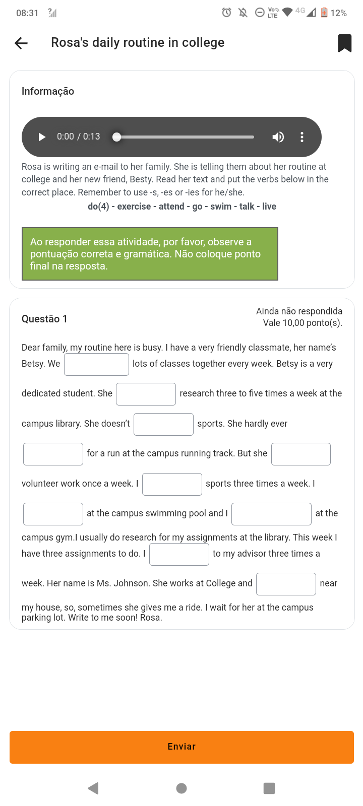 <p>08:31 ? Vo 4G LTE 12% Rosa's daily routine in college Informação 0:00 / 0:13 Rosa is writing an e-mail to her family. She is telling them about her routine at college and her new friend, Besty. Read her text and put the verbs below in the correct place. Remember to use -S, -es or -ies for he/she. do(4) - exercise - attend - go - swim - talk - live Ao responder essa atividade, por favor, observe a pontuação correta e gramática. Não coloque ponto final na resposta. Ainda não respondida Questão 1 Vale 10,00 ponto(s). Dear family, my routine here is busy. I have a very friendly classmate, her name's Betsy. We lots of classes together every week. Betsy is a very dedicated student. She research three to five times a week at the campus library. She doesn't sports. She hardly ever for a run at the campus running track. But she volunteer work once a week. I sports three times a week. at the campus swimming pool and at the campus gym.l usually do research for my assignments at the library. This week have three assignments to do. to my advisor three times a week. Her name is Ms. Johnson. She works at College and near my house, so, sometimes she gives me a ride. wait for her at the campus parking lot. Write to me soon! Rosa. Enviar</p>