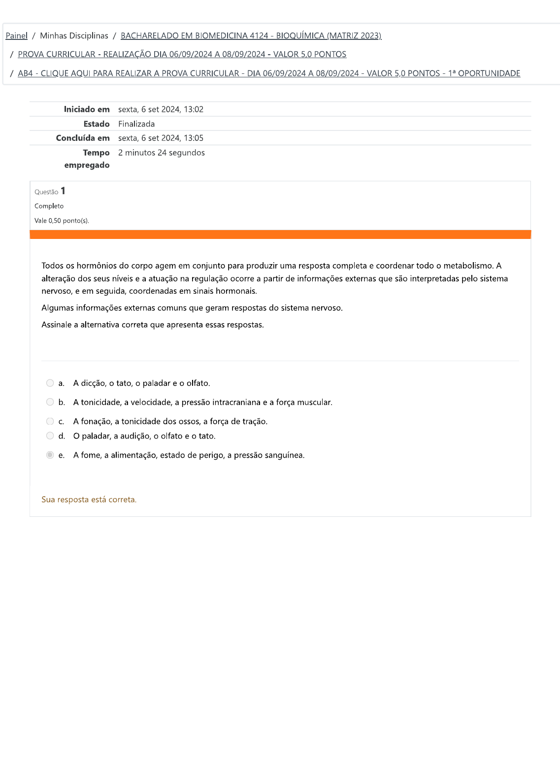 <p>Painel / Minhas Disciplinas / BACHARELADO EM BIOMEDICINA 4124 - BIOQUÍMICA (MATRIZ 2023) / PROVA CURRICULAR - REALIZAÇÃO DIA 06/09/2024 A 08/09/2024 - VALOR 5,0 PONTOS / AB4 - CLIQUE AQUI PARA REALIZAR A PROVA CURRICULAR - DIA 06/09/2024 A 08/09/2024 - VALOR 5,0 PONTOS - OPORTUNIDADE Iniciado em sexta, 6 set 2024, 13:02 Estado Finalizada Concluída em sexta, 6 set 2024, 13:05 Tempo 2 minutos 24 segundos empregado Questão 1 Completo Vale 0,50 ponto(s). Todos os hormônios do corpo agem em conjunto para produzir uma resposta completa e coordenar todo o metabolismo. A alteração dos seus níveis e a atuação na regulação ocorre a partir de informações externas que são interpretadas pelo sistema nervoso, e em seguida, coordenadas em sinais hormonais. Algumas informações externas comuns que geram respostas do sistema nervoso. Assinale a alternativa correta que apresenta essas respostas. a. A dicção, o tato, o paladar e o olfato. b. A tonicidade, a velocidade, a pressão intracraniana e a força muscular. C. A fonação, a tonicidade dos ossos, a força de tração. d. paladar, a audição, o olfato e o tato. e. A fome, a alimentação, estado de perigo, a pressão sanguínea. Sua resposta está correta.</p><p>Questão 2 Completo Vale 0,50 ponto(s). Um dos princípios da biologia revela que as diversas formas de vida interagem entre si por meio de relações harmônicas ou não, causando assim consequências para ambos os organismos envolvidos. Diante do exposto, assinale a alternativa correta acerca de como ocorrem a maioria das interações entre os organismos. a. Esse tipo de interação descrito ocorre apenas em níveis de vida marinho e nunca foi visto no meio terrestre. b. Esses momentos de interação são raros e difíceis de encontrar em toda a natureza. C. Essas interações ocorrem na sua maior parte através da participação de biomoléculas complexas em diversos mecanismos e processos químicos fundamentais para o funcionamento da vida humana. d. As interações ocorrem por meio de parasitismo obrigatório, onde um dos lados sempre sairá prejudicado. e. Quando se trata de interações, é sempre um benefício para ambas as partes envolvidas. Sua resposta está correta. Questão 3 Completo Vale 0,50 ponto(s). As células vivas apresentam características universais e a partir do padrão de organização e de seus constituintes, podemos classificá-las em dois grupos: a célula animal e a vegetal. Alguns elementos estão presentes apenas em um dos tipos celulares. Tento em vista o exposto, quais são as diferenças da célula animal e da célula vegetal? a. A ausência de membrana plasmática na célula vegetal e presença de membrana plasmática na célula animal. b. A presença de cloroplasto apenas na célula vegetal e de lisossomos apenas na célula animal. C. Ausência de cloroplasto na célula vegetal e presença de cloroplasto na célula animal. d. A presença de completo de Golgie na célula vegetal e ausência do mesmo célula animal. e. A presença de retículo endoplasmático rugoso e liso na célula vegetal, e a presença somente de retículo endoplasmático rugoso na célula animal. Sua resposta está correta.</p><p>Questão 4 Completo Vale 0,50 ponto(s). Os lipídeos são compostos químicos que apresentam como principal característica a sua insolubilidade em água. A insolubilidade ocorre porque os lipídeos são constituídos por um esqueleto de hidrocarbonetos que confere essa propriedade apolar. Eles desempenham funções variadas nas células, sendo as duas principais: Assinale a alternativa correta: a. Proteção do envoltório nuclear onde encontra-se a cromatina. b. Tem como principal função transformar água em nutriente para alimentar a célula. C. A ligação de tripla base nitrogenada entre as cadeias que formam a fita de DNA. d. A liberação de substâncias para proteção celular; e. Armazenamento de energia como gorduras e óleos e componentes de membranas biológicas. Sua resposta está correta. Questão 5 Completo Vale 0,50 ponto(s). ciclo do ácido cítrico ou ciclo dos ácidos tricarboxílicos, e é constituído de uma série de reações biológicas que resultam na produção de energia para as células. Além da glicose, outras moléculas também podem entrar nesse ciclo, mas não são processadas anteriormente em piruvato. ciclo do ácido cítrico é popularmente conhecido por outro nome, além dos dois nomes citados no início do enunciado. Assinale a alternativa correta: a. Ciclo reparador. b. Ciclo indutor. C. Ciclo de Krebs. d. Ciclo circadiano. e. Ciclo manufatureiro. Sua resposta está correta.</p><p>Questão 6 Completo Vale 0,50 ponto(s). A glicólise é uma via metabólica responsável pela produção de energia para tecidos e células animais e vegetais e microrganismos através da degradação, via oxidação, de moléculas de glicose. Durante o processo, a energia da glicose é conservada na forma de NADH e de ATP. Com base no excerto e em seus conhecimentos, assinale a alternativa correta que aponta qual a estrutura da molécula de glicose a. A molécula de glicose é formada por três pentoses. b. A glicose é uma molécula de seis átomos de carbono. C. A molécula da glicose é formada por duas pentoses. d. Molecula formada por quatro grupos de pentose. e. É uma molécula formatada por 4 átomos de hidrogênio. Sua resposta está correta. Questão 7 Completo Vale 0,50 ponto(s). Os carboidratos são utilizados principalmente para produzir glicogênio ou utilizar a glicose como fonte de energia. As vias envolvidas no processo de utilização da glicose para gerar energia são glicólise (ciclo do ácido cítrico e cadeia respiratória) ou a via das pentoses-fosfato. A glicose e o glicogênio são muito importantes para? A alternativa correta que completa a frase é: a. funcionamento do sistema periférico e cartilaginoso. b. funcionamento das articulações e do sistema nervoso central. C. O funcionamento dos 