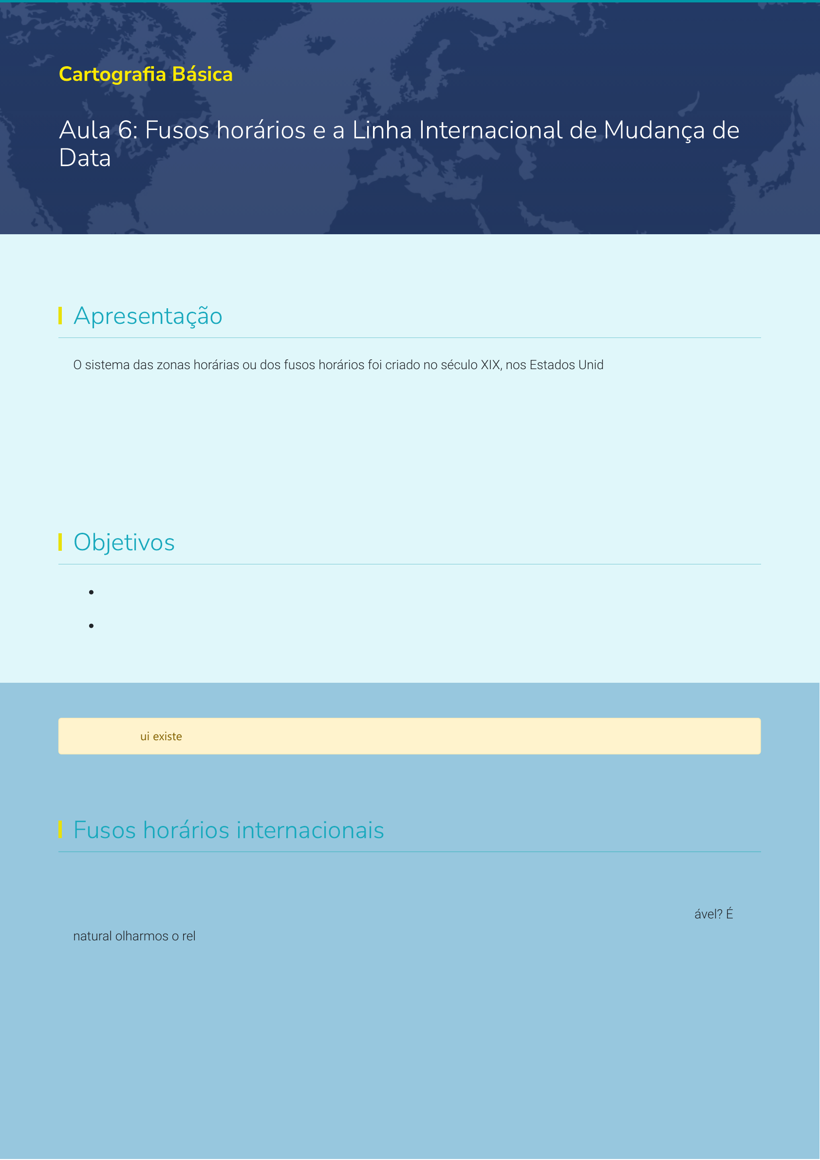 <p>Cartogra�a Básica</p><p>Aula 6: Fusos horários e a Linha Internacional de Mudança de</p><p>Data</p><p>Apresentação</p><p>O sistema das zonas horárias ou dos fusos horários foi criado no século XIX, nos Estados Unidos, quando o mundo foi</p><p>dividido em 24 fusos horários distintos, considerando-se o tamanho longitudinal do planeta Terra (360º) e a quantidade de</p><p>duração de um dia (24h).</p><p>Você sabe como os fusos horários são organizados? Sabe como estabelecer a diferença horária entre duas cidades,</p><p>contando com as longitudes? Nesta aula, vamos aprender tudo isso!</p><p>Objetivos</p><p>Descrever os fusos horários internacionais;</p><p>Analisar a Linha Internacional de Data.</p><p>Atenção! Aqui existe uma videoaula, acesso pelo conteúdo online</p><p>Fusos horários internacionais</p><p>Está nos minutos �nais de uma aula? Em um compromisso improdutivo de trabalho? Em uma reunião interminável? É</p><p>natural olharmos o relógio a cada 5 segundos quando estamos com pressa ou entediados.</p><p>O tempo é uma referência importante para as atividades humanas. Você tem hora certa para ir ao dentista, para o jantar e</p><p>até mesmo para ir à praia ou um passeio pelo parque.</p><p>Ele deve ser considerado, inclusive, quando precisamos nos comunicar com uma pessoa localizada além do nosso lugar</p><p>geográ�co, pois é importante saber a hora do lugar onde a pessoa mora (hora local). Não podemos arriscar ligar de</p><p>madrugada, não é mesmo?</p><p>Observe, na �gura que, se em Nova York são 6h da manhã, em Londres, serão 10h da manhã. Neste caso, em Moscou,</p><p>capital da Rússia, será 13h, e assim por diante.</p><p>Diferentes fusos horários em capitais mundiais: Até mesmo dentro do</p><p>território brasileiro, há mudanças de fuso horário.</p><p> Como esse sistema funciona?</p><p> Clique no botão acima.</p><p>Como esse sistema funciona?</p><p>Você sabe que o movimento de rotação promove os dias e as noites no planeta Terra, e, como consequência,</p><p>vários pontos da superfície do planeta apresentam diferença de horários.</p><p>Cada região tem horário diferenciado para as atividades relacionadas aos seres humanos, como movimentação</p><p>de trens, ônibus e aviões, bem como abertura e fechamento de repartições públicas e horário de aulas.</p><p>Como resolver as trocas comerciais e contatos humanos sem o sistema de fusos horários?</p><p>Como nos diz Venturi (2008), o Planeta Terra gira de oeste para o leste, portanto, o Sol nasce primeiro nos lugares</p><p>a leste. Essa dinâmica se repete em qualquer lugar.</p><p>Dica: Você quer ver o amanhecer? Busque sempre o lado leste geográ�co de onde você está localizado.</p><p>O início da hora legal: a origem de tudo</p><p>De acordo com Carvalho & Araújo (2008), a Grã-Bretanha foi o primeiro país a adotar, ainda no século XIX, uma hora legal</p><p>para todos os componentes do seu território: País de Gales, Escócia e Inglaterra.</p><p>A técnica foi se popularizando ao longo do tempo, mas havia um problema: não existia sincronização de horas/minutos e</p><p>nem a distinção legal de outros países em relação às marcações de outros.</p><p>Para resolver essa questão, a Conferência Internacional do Primeiro</p><p>Meridiano, nos Estados Unidos, em 1884, estabeleceu os fusos horários</p><p>padronizados .1</p><p>Saiba mais</p><p>Não deixe de ler o texto Meridiano de Greenwich faz 125 anos.</p><p> Como foi feito o cálculo dessa proposta que vem sendo utilizada até hoje?</p><p> Clique no botão acima.</p><p>Como foi feito o cálculo dessa proposta que vem sendo utilizada até hoje?</p><p>Como foi feito o cálculo dessa proposta que vem sendo utilizada até hoje?</p><p>Usando as longitudes!</p><p>Considerando que a esfera terrestre tem 360º de longitude e que o movimento de rotação da Terra,</p><p>simpli�cadamente, acontece em 24 horas, estabeleceu-se que a cada 15º de longitude, muda-se uma hora.</p><p>Todo mundo acha que basta passar de 0º para 15º para ter mudança de fuso horário, mas os especialistas</p><p>alertam que o primeiro fuso horário abrangeria uma faixa que vai de 07º 30’ E (de East, sigla inglesa para Leste) a</p><p>07º 30’ W (de West, sigla inglesa para Oeste). Portanto, 15º de longitude.</p><p>Observe a �gura a seguir.</p><p>https://stecine.azureedge.net/webaula/estacio/go0082/aula6.html</p><p>javascript:void(0);</p><p>Em que direção devemos contar os fusos?</p><p>Outra grande preocupação é para onde devemos contar!</p><p>As horas sempre sofrem acréscimo de 1 unidade quando você se dirige para leste e sofrem redução no sentido</p><p>oeste.</p><p>Simples? Não.</p><p>Observe na �gura a seguir que esse acréscimo e redução de horário funciona até o meridiano de 180º ou</p><p>antimeridiano, localizado de maneira muito conveniente no Oceano Pací�co, local ideal para o estabelecimento da</p><p>Linha Internacional de Datas (LID) ou Linha Internacional de Mudança de Data.</p><p>Repare onde �ca o Meridiano de Greenwich (na Inglaterra). Está a zero graus de longitude, certo?</p><p>Agora, veri�que onde �ca a Linha Internacional de Mudança de Data. Fica “atrás da Terra”, no meridiano de 180º.</p><p> Fonte: Fusos horários que começam em Greenwich. Disponível em: www.aeroclubedebrasilia.org</p><p> Acréscimo e redução de fusos horários. Adaptado de Fitz (2008)</p><p>javascript:void(0);</p><p>Hora solar ou fuso horário solar</p><p>Considerando que Greenwich é o limite inicial para o desenvolvimento dos fusos horários, pegue a �gura anterior e corte</p><p>exatamente no meridiano de 180º, e abra a folha completa, como se fosse um papel.</p><p>Teríamos, assim, um exemplar da �gura a seguir, que mostra os fusos reais, considerando a fórmula matemática dos 15º</p><p>a cada hora.</p><p>Chamamos isso de hora solar ou fuso horário solar, porque respeita integralmente a organizaç