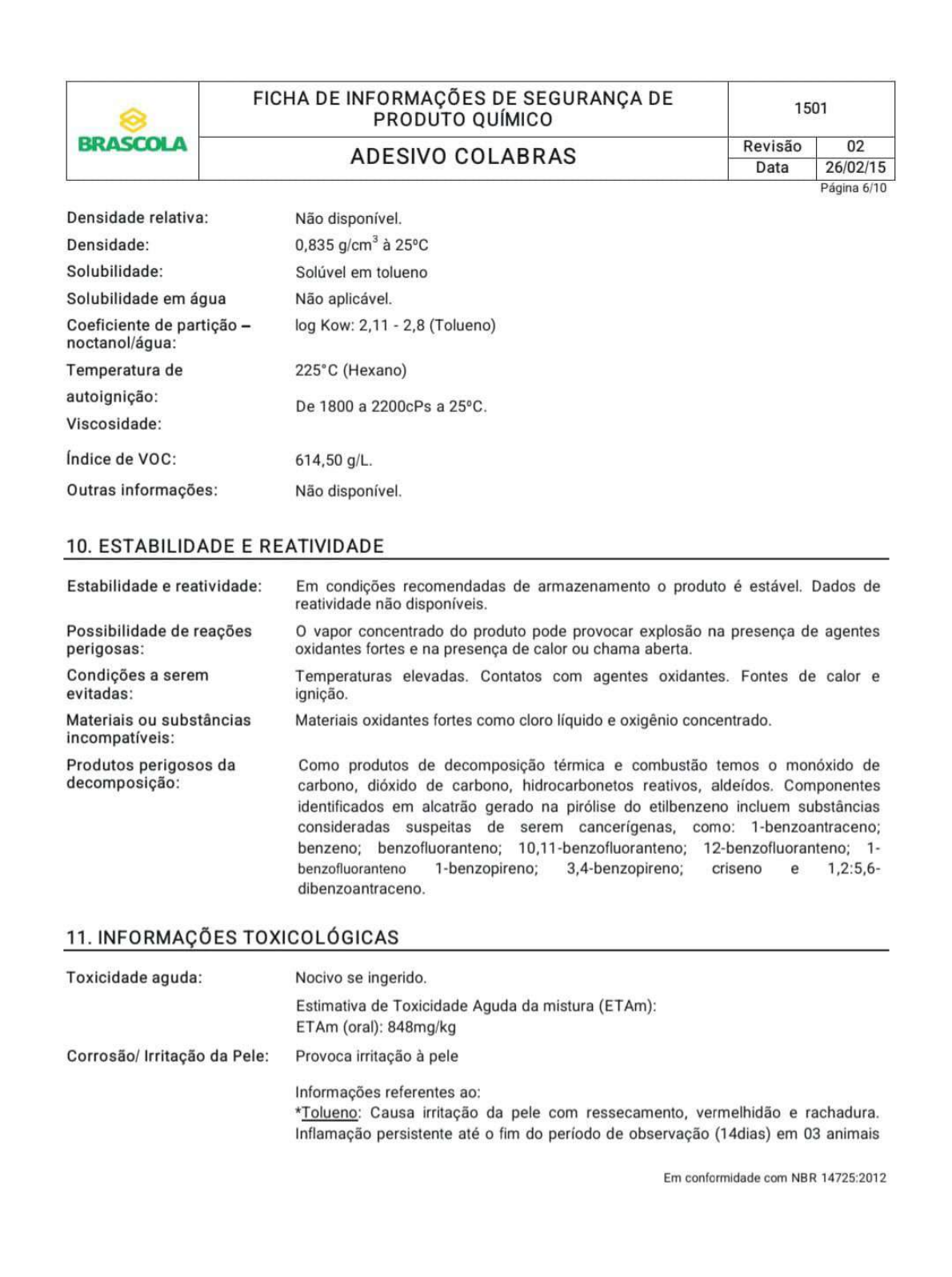 <p>FICHA DE INFORMAÇÕES DE SEGURANÇA DE 1501 PRODUTO QUÍMICO BRASCOLA Revisão 02 ADESIVO COLABRAS Data 26/02/15 Página 6/10 Densidade relativa: Não disponível. Densidade: 0,835 à 25°C Solubilidade: Solúvel em tolueno Solubilidade em água Não aplicável. Coeficiente de partição - log Kow: 2,11 - 2,8 (Tolueno) noctanol/água: Temperatura de 225°C (Hexano) autoignição: De 1800 a 2200cPs a 25°C. Viscosidade: Índice de VOC: 614,50 g/L. Outras informações: Não disponível. 10. ESTABILIDADE E REATIVIDADE Estabilidade e reatividade: Em condições recomendadas de armazenamento o produto é Dados de reatividade não disponíveis. Possibilidade de reações o vapor concentrado do produto pode provocar explosão na presença de agentes perigosas: oxidantes fortes e na presença de calor ou chama aberta. Condições a serem Temperaturas elevadas. Contatos com agentes oxidantes. Fontes de calor e evitadas: ignição. Materiais ou substâncias Materiais oxidantes fortes como cloro líquido e oxigênio concentrado. incompatíveis: Produtos perigosos da Como produtos de decomposição térmica e combustão temos o monóxido de decomposição: carbono, dióxido de carbono, hidrocarbonetos reativos, Componentes identificados em alcatrão gerado na pirólise do etilbenzeno incluem substâncias consideradas suspeitas de serem como: 1-benzoantraceno; benzeno; benzofluoranteno; 1- benzofluoranteno 1-benzopireno; 3,4-benzopireno; criseno e 1,2:5,6- dibenzoantraceno. 11. INFORMAÇÕES TOXICOLÓGICAS Toxicidade aguda: Nocivo se ingerido. Estimativa de Toxicidade Aguda da mistura (ETAm): ETAm (oral): 848mg/kg Corrosão/ Irritação da Pele: Provoca irritação à pele Informações referentes ao: *Tolueno: Causa irritação da pele com ressecamento, vermelhidão e rachadura. Inflamação persistente até o fim do período de observação (14dias) em 03 animais Em conformidade com NBR 14725:2012</p><p>FICHA DE INFORMAÇÕES DE SEGURANÇA DE 1501 PRODUTO QUÍMICO BRASCOLA Revisão 02 ADESIVO COLABRAS Data 26/02/15 Página 7/10 em estudo. Observada alopecia e descamação. *Hexano: Provoca irritação à pele com ressecamento e vermelhidão. Lesões oculares grave/ Provoca irritação ocular grave. Irritação ocular: Informação referente ao: *Tolueno: Demonstraram-se ser irritante para os olhos de coelhos com reversão dos sintomas em até 07 dias. Sensibilização respiratória Não são esperados efeitos de sensibilização respiratória ou da pele. ou à pele: Informação referente ao: *Tolueno: Estudos em animais demonstraram que este produto não provoca sensibilização respiratória ou da pele Mutagenicidade em células Suspeito de provocar defeitos genéticos. germinativas: Informação referente ao: *Tolueno: Resultados negativos em ensaios de mutagenicidade in vivo com células somáticas e germinativas de *Benzeno: Resultados positivos para testes de mutagenicidade in vivo e in vitro com células somáticas humanas ensaios de aberrações Carcinogenicidade: Suspeito de provocar câncer. Informação referente ao: *Benzeno: Carcinogênico para humanos (Grupo 1 IARC). Toxicidade à reprodução: Pode prejudicar a fertilidade ou o feto. Informação referente ao: *Tolueno: Com base em dados epidemiológicos, pode causar malformação do feto, desenvolvimento anormal e aborto. *Benzeno: Estudo realizado em ratos com redução na espermatogênese. Toxicidade para Provoca danos aos órgãos através da exposição específicos - exposição Pode provocar sonolência e vertigem com dor de cabeça, fadiga, tonturas, visão única: turva, náuseas, confusão mental, inconsciência, sonolência. Pode provocar irritação respiratória com tosse e dificuldades respiratórias. Toxicidade para órgãos-alvo Provoca danos ao sistema nervoso central, rins e fígado através da exposição específicos - exposições repetida. repetidas: Perigo por aspiração: Pode ser fatal se ingerido e penetrar nas vias respiratórias. 12. INFORMAÇÕES ECOLÓGICAS Efeitos ambientais, comportamento e impactos do produto Ecotoxicidade: Tóxico para organismos aquáticos. Em conformidade com NBR 14725:2012</p><p>FICHA DE INFORMAÇÕES DE SEGURANÇA DE 1501 PRODUTO QUÍMICO BRASCOLA Revisão 02 ADESIVO COLABRAS Data 26/02/15 Página 10/10 16. OUTRAS INFORMAÇÕES Informações importantes, mas não especificamente descritas às seções anteriores: Esta FISPQ foi elaborada com base nos atuais conhecimentos sobre o manuseio apropriado do produto e sob as condições normais de uso, de acordo com a aplicação especificada na embalagem. Qualquer outra forma de utilização do produto que envolva a sua combinação com outros materiais, além de formas de uso diversas daquelas indicadas, são de responsabilidade do usuário. Adverte-se que o manuseio de qualquer substância química requer o conhecimento prévio de seus perigos pelo usuário. No local de trabalho cabe à empresa usuária do produto promover o treinamento de seus empregados e contratados quanto aos possíveis riscos advindos da exposição ao produto químico. Legendas e abreviaturas: ACGIH - American Conference of Governamental Industrial Hygienists BCF Bioconcentration Factor (Fator de Bioconcentração) BEI Biological Exposure Index Biológico de Exposição) CAS Chemical Abstracts Service CL50 Concentração Letal 50% DL50 Dose Letal 50% IBMP - Índice biológico máximo permitido LEI Limite de explosividade inferior LES Limite de explosividade superior LT - Limite de tolerância NR Norma Regulamentadora ONU Organização das Nações Unidas TLV Threshold Limit Value TWA Time Weighted Average STEL - Short Term Exposure Level CONAMA Conselho Nacional do Meio Ambiente Referências bibliográficas: BANDEIRANTE BRAZMO. Ficha de informações de segurança de produtos químicos, acetona. Revisão 02, 2013. TOXICOLOGY DATA Disponível em: Acesso em: fev.2015. BANDEIRANTE BRAZMO. Ficha de informações de segurança de produtos químicos, hexano. Rev