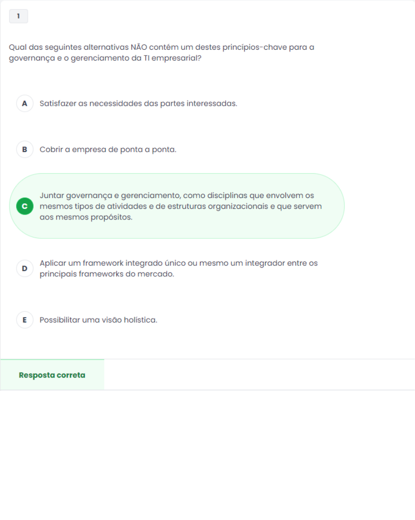 <p>A alternativa C, que sugere juntar governança e gerenciamento como disciplinas que envolvem os mesmos tipos de atividades e de estruturas organizacionais e que servem aos mesmos propósitos, é a que não contém um princípio-chave para a governança e o gerenciamento da TI empresarial. Embora a governança e o gerenciamento possam ter algumas semelhanças, eles não são a mesma coisa e não devem ser tratados como tal. A governança se refere à definição de expectativas, à concessão de poder ou à verificação do desempenho, enquanto o gerenciamento é a execução dessas expectativas definidas através da governança. Portanto, eles não devem ser juntados como a mesma disciplina.</p><p>O princípio do COBIT que corresponde à descrição dada é "Cobrir a Organização de Ponta a Ponta". Este princípio enfatiza a necessidade de integrar a governança de TI à governança corporativa, abrangendo todas as funções e processos da organização. Ele não se limita apenas à função de TI, mas considera a TI e as tecnologias relacionadas como ativos que devem ser gerenciados como qualquer outro ativo na organização. Além disso, leva em conta todos os facilitadores de governança e gestão de TI aplicáveis em toda a organização, incluindo todos os aspectos e pessoas - internas e externas - que são considerados relevantes para a governança e gestão das informações e de TI da organização.</p><p>De acordo com o COBIT 5, o mapeamento correto entre o objetivo de TI "Gestão do risco organizacional de TI" e os processos de TI é: Gerenciar Fornecedores (P - primário), Garantir a Otimização de Recursos (S - secundário), Gerenciar Segurança (P - primário) e Gerenciar Programas e Projetos (P - primário). Isso significa que os processos de Gerenciar Fornecedores, Gerenciar Segurança e Gerenciar Programas e Projetos são fundamentais para a consecução do objetivo de TI, enquanto o processo de Garantir a Otimização de Recursos é um apoio secundário para o objetivo de TI.</p><p>O modelo COBIT, ao realizar um diagnóstico de maturidade, fornece uma orientação de quais processos devem ser priorizados para a evolução da maturidade na área de TI. Isso significa que, ao identificar os níveis de maturidade dos processos de TI, o modelo COBIT ajuda a determinar quais processos necessitam de mais atenção e desenvolvimento para alcançar um nível de maturidade mais alto. Portanto, a alternativa correta é: "Orientação de priorização dos processos a serem trabalhados para a evolução da maturidade na área de TI".</p><p>A alternativa correta é a A, que afirma que "3 dos objetivos são da dimensão Financeira, um objetivo é da dimensão Cliente e os outros são da dimensão Treinamento e Crescimento". Isso se dá porque os objetivos corporativos do COBIT 5 são enquadrados nas 4 dimensões do Balanced Scorecard (BSC). Nesse caso, os objetivos de "Valor dos investimentos da organização percebidos pelas partes interessadas, especialmente pela sociedade", "Gestão do risco do negócio" e "Conformidade com as leis e regulamentos externos, com foco nas leis ambientais e leis trabalhistas que tratam dos contratos de terceirização" são da dimensão Financeira. O objetivo "Resposta rápida para um ambiente de negócios em mudança" é da dimensão Cliente. E o objetivo "Pessoas qualificadas e motivadas, que reconhecem que o sucesso da organização depende de seus colaboradores" é da dimensão Treinamento e Crescimento.</p><p>categorias de habilitadores. Entre essas categorias, temos os "Processos", que são uma série de atividades coordenadas que transformam entradas em saídas. Além disso, o COBIT 5 também apresenta um conjunto de dimensões comuns a esses habilitadores, entre as quais se incluem as "Partes interessadas", que são indivíduos ou organizações que podem afetar, ser afetadas por, ou perceber-se afetadas por uma decisão ou atividade. Portanto, "Processos" e "Partes interessadas" são exemplos de habilitador e dimensão, respectivamente, no contexto do COBIT 5.</p><p>O processo de "Definir a Arquitetura da Informação" está corretamente inserido no domínio "Planejamento e Organização" do COBIT 4.1. Este domínio é responsável por estabelecer a estratégia e táticas de TI, e inclui processos que orientam a organização de TI para atender aos requisitos de negócio. Portanto, a alternativa C é a correta.</p><p>De acordo com o COBIT 5, a cascata de objetivos da organização tem como principal função definir metas e objetivos relevantes e exequíveis. Isso significa que a cascata de objetivos é uma ferramenta que auxilia a organização a estabelecer metas que são tanto significativas quanto realizáveis, levando em consideração os recursos disponíveis e as necessidades da organização. Portanto, a alternativa correta é a C: "Definir metas e objetivos relevantes e exequíveis".</p><p>De acordo com o COBIT 4.1, que é um guia de melhores práticas apresentado pelo ISACA para gestão de tecnologia da informação, os pilares que sustentam o núcleo da governança de TI são representados por cinco áreas. Entre as opções apresentadas, a alternativa que melhor representa dois desses pilares é o "Gerenciamento de risco e gerenciamento de recursos". O gerenciamento de risco envolve a identificação, avaliação e tratamento de riscos que podem afetar a realização dos objetivos da organização. Já o gerenciamento de recursos se refere ao uso eficiente e eficaz dos recursos da organização. Portanto, a alternativa correta é a B.</p><p>image7.png</p><p>image8.png</p><p>image9.png</p><p>image10.png</p><p>image1.png</p><p>image2.png</p><p>image3.png</p><p>image4.png</p><p>image5.png</p><p>image6.png</p>