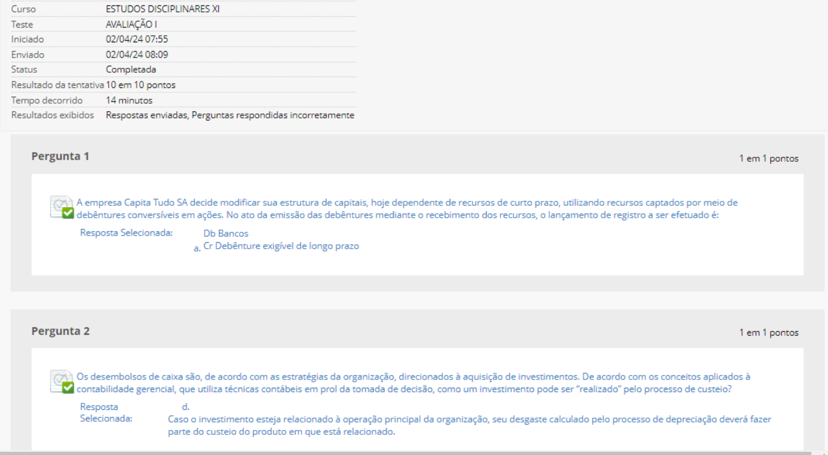 <p>Curso ESTUDOS DISCIPLINARES XI Teste AVALIAÇÃO Iniciado 02/04/24 07:55 Enviado 02/04/24 08:09 Status Completada Resultado da tentativa 10 em 10 pontos Tempo decorrido 14 minutos Resultados exibidos Respostas enviadas, Perguntas respondidas incorretamente Pergunta 1 1 em 1 pontos A empresa Capita Tudo SA decide modificar sua estrutura de capitais, hoje dependente de recursos de curto prazo, utilizando recursos captados por meio de debêntures conversíveis em ações. No ato da emissão das debêntures mediante o recebimento dos recursos, o lançamento de registro a ser efetuado é: Resposta Selecionada: Db Bancos a. Cr Debênture exigível de longo prazo Pergunta 2 1 em 1 pontos Os desembolsos de caixa são, de acordo com as estratégias da organização, direcionados à aquisição de De acordo com os conceitos aplicados à contabilidade gerencial, que utiliza técnicas contábeis em prol da tomada de decisão, como um investimento pode ser "realizado" pelo processo de custeio? Resposta d. Selecionada: Caso o investimento esteja relacionado à operação principal da organização, seu desgaste calculado pelo processo de depreciação deverá fazer parte do custeio do produto em que está relacionado.</p>