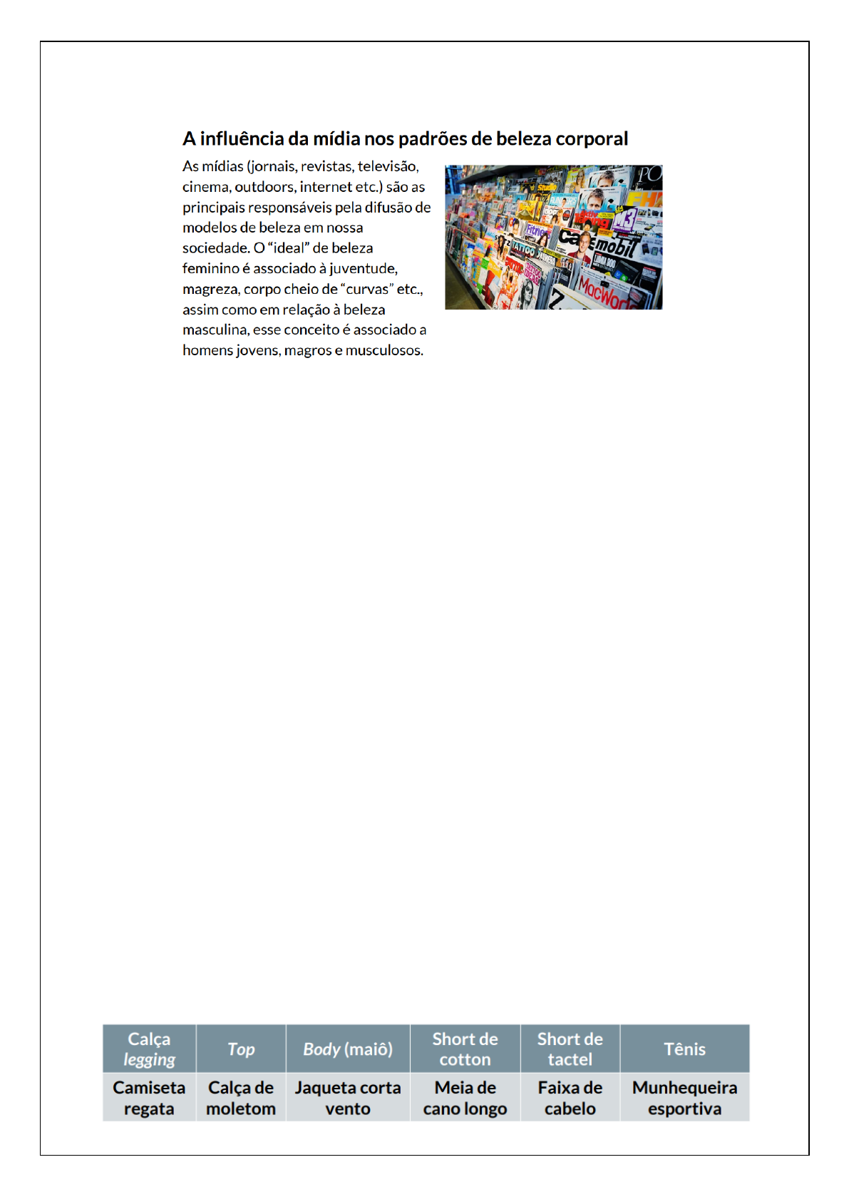 <p>AVALIAÇÃO DE EDUCAÇÃO FÍSICA - PROFª PRISCILA</p><p>NOME:________________________________________________________________ SÉRIE:___________</p><p>1) MARQUE UM X NAS OPÇÕES QUE SE ENQUADRAM NO QUE SE CONSIDERA PADRÃO DE BELEZA</p><p>ATUAL:</p><p>( ) MAGRO ( ) ALTO ( ) VELHO</p><p>( ) BAIXO ( ) JOVEM ( ) GORDO</p><p>2) LEIA A REPORTAGEM:</p><p>OS RISCOS DA PREOCUPAÇÃO EXAGERADA COM O CORPO. A IMAGEM TORNA-SE ALGO MAIS</p><p>IMPORTANTE QUE A PRÓPRIA SAÚDE. MAS QUAIS OS LIMITES SEGUROS DA VAIDADE?</p><p>A IMAGEM TORNA-SE ALGO MAIS IMPORTANTE QUE A PRÓPRIA SAÚDE. MAS QUAIS OS</p><p>LIMITES SEGUROS DA VAIDADE? A BUSCA PELO CORPO PERFEITO ENVOLVE DIETAS SUPER</p><p>RESTRITIVAS OU HIPERPROTEICAS QUE PODEM LEVAR A TRANSTORNOS ALIMENTARES . A</p><p>NUTRICIONISTA MARCELA KOTAIT MOSTROU QUANDO A PREOCUPAÇÃO COM O CORPO E COM A</p><p>ALIMENTAÇÃO VIRA EXAGERO A PONTO DE COLOCAR A SAÚDE EM RISCO.</p><p>O EXAGERO À BUSCA DO PADRÃO DE BELEZA PODE LEVAR A:</p><p>A) ( ) TRANSTORNOS ALIMENTARES.</p><p>B) ( ) MELHORIA DA SAÚDE.</p><p>C) ( ) BEM ESTAR FÍSICO E MENTAL.</p><p>D) ( )MELHORIA DAS CONDIÇÕES CARDIOVASCULARES.</p><p>3) A MODA TAMBÉM ESTÁ PRESENTE NO MUNDO FITNESS, CIRCULE NO QUADRO AS ROUPAS QUE</p><p>VOCÊ COSTUMA USAR:</p><p>GINÁSTICA RÍTMICA</p><p>4) A GINÁSTICA RÍTMICA É UMA MODALIDADE ESPORTIVA, QUE POSSUI ELEMENTOS CORPORAIS</p><p>OBRIGATÓRIO, QUAIS SÃO ESSES ELEMENTOS?</p><p>______________________________________________________________________________________</p><p>______________________________________________________________________________________</p><p>5) SÃO UTILIZADOS 5 APARELHOS NA GINÁSTICA RÍTMICA, QUAIS SÃO ELES:</p><p>______________________________________________________________________________________</p><p>______________________________________________________________________________________</p>