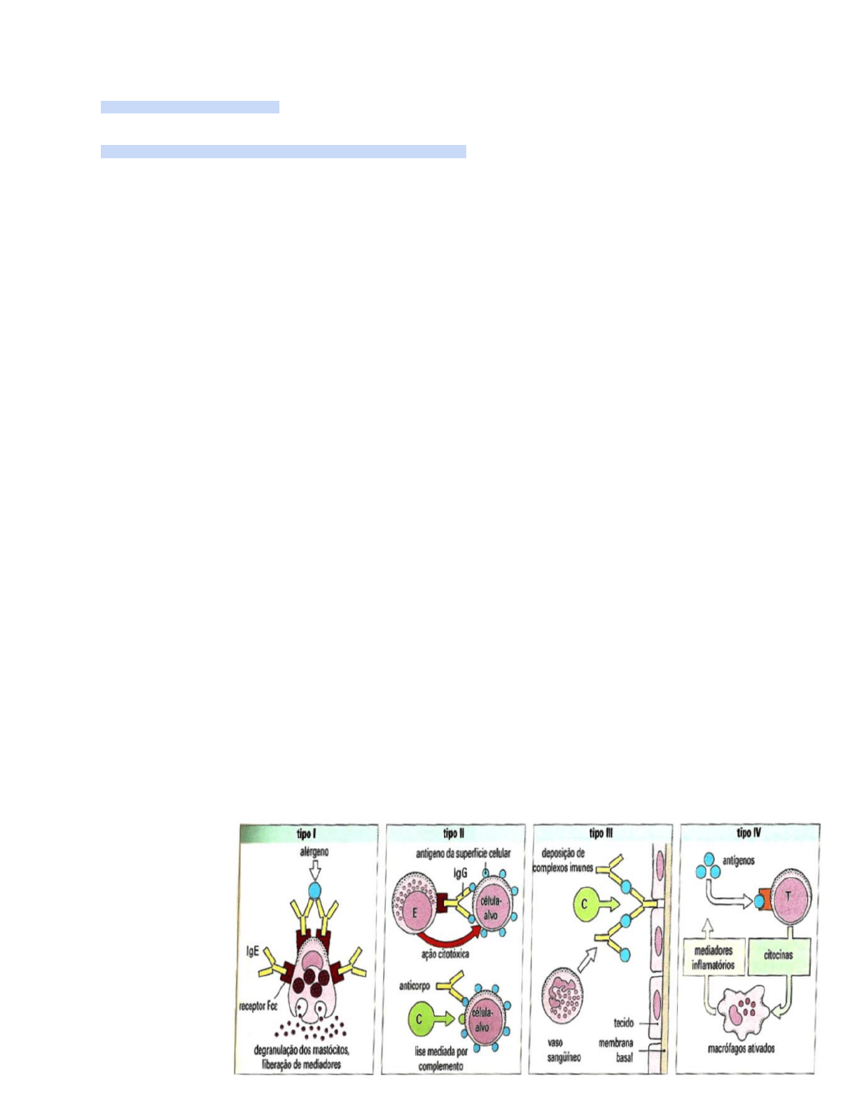 <p>1- Definir o que é hipersensibilidade</p><p>- Definição</p><p>- Causas das doenças de hipersensibilidade</p><p>2- Descrever os tipos de hipersensibilidade e suas manifestações clínicas</p><p>- Imediata (tipo 1)</p><p>- Mediada por anticorpos (tipo 2)</p><p>- Mediada por imunocomplexos (tipo 3)</p><p>- Mediada por células T (tipo 4)</p><p>Hipersensibilidad�</p><p>Definiçã�</p><p>Resposta imunológica exagerada que se desenvolve após a</p><p>exposição a um determinado antígeno. Ocorre em indivíduos</p><p>susceptíveis ou previamente sensibilizados, depende da</p><p>sensibilidade do indivíduo e da natureza do antígeno</p><p>(distúrbios causados pela resposta imune)</p><p>Causas:</p><p>- Autoimunidade: reações contra auto antígenos. Falha nos</p><p>mecanismos de tolerância. Afetam cerca de 2 a 5% da</p><p>população e tem incidência crescente. Faixa etária de 20 a</p><p>40 anos, mais comuns em mulheres. Geralmente são crônicas e</p><p>frequentemente debilitantes</p><p>- Reações contra microrganismos: causada por reações</p><p>excessivas ou microrganismos anormalmente persistentes. As</p><p>cél. T contra microrganismos persistentes podem causar</p><p>inflamação grave.</p><p>- Reações contra antígenos ambientais não microbianos: cerca</p><p>de 20% da população é anormalmente responsiva a uma ou mais</p><p>dessas substâncias e produzem IgE que causa doenças</p><p>alérgicas</p><p>!!! Em todas essas condições, os mecanismos de lesão tecidual</p><p>são os mesmos que normalmente participam da eliminação de</p><p>agentes infecciosos: respostas imunes inatas e adaptativas que</p><p>envolvem fagócitos, anticorpos, linfócitos T, mastócitos e</p><p>várias outras células efetoras, além dos mediadores da</p><p>inflamação.</p><p>Hipersensibilidad� imediat� (tip� I)</p><p>A hipersensibilidade imediata é mediada por anticorpos como o</p><p>IgE, que reconhecem antígenos denominados alérgenos. Quase todos</p><p>os alérgenos são proteínas relativamente pequenas, com alta</p><p>solubilidade em fluidos, se difundem rapidamente pelas mucosas e</p><p>apresentam glicosilações. São exemplos de alérgenos: ácaros,</p><p>fungos, pelos de cães e gatos, baratas, pólens e poluentes</p><p>ambientais</p><p>Agrupadas em alergia ou atropia. Geralmente causada pela</p><p>ativação de células Th2 produtoras de IL-4, IL-5, e IL-13 e</p><p>pelas produção de IgE, que ativam mastócitos e eosinófilos e</p><p>induzem a inflamação</p><p>Só ocorre frente a uma exposição anterior ao antígeno, já</p><p>que os anticorpos foram produzidos anteriormente a esse alérgeno</p><p>específico (sensibilização)</p><p>!!! Mastócitos de conjuntiva e mucosa</p><p>- Atópicos: resposta forte, realizada por linfócitos TH-2, com umas alta produção</p><p>de IgE na exposição dessa substância, já que existe uma predisposição genética</p><p>a alergia. pode ocorrer acúmulo de TH-2 na pele e na mucosa brônquica; alguns</p><p>estímulos como o frio e o exercício podem desencadear uma reação</p><p>A hipersensibilidade imediata trata-se de uma resposta</p><p>imune adaptativa cujos sintomas surgem após 10 a 20 minutos</p><p>(fase imediata) o contato com o alérgeno, acompanhados por uma</p><p>fase mais tardia.</p><p>Mecanismo</p><p>O primeiro contato com alérgenos gera</p><p>uma resposta imune local na mucosa por onde o</p><p>antígeno teve acesso. O alérgeno inicialmente</p><p>reconhecido pelas células do sistema imune é</p><p>processado e apresentado a linfócitos T CD4.</p><p>A natureza do alérgeno direciona uma</p><p>resposta do tipo Th2, cuja principal</p><p>característica é a indução da produção de</p><p>anticorpos da classe IgE(que se associam a</p><p>mastócitos/basófilos eosinófilos),</p><p>ativando-os e induzindo uma resposta</p><p>inflamatória, e citocinas do perfil Th2</p><p>(IL-5, IL-4, IL-13, etc.)</p><p>Neste processo ocorre a liberação de</p><p>substâncias biologicamente ativas: aminas</p><p>biogênicas, mediadores lipídicos, citocinas,</p><p>enzimas.</p><p>A partir do momento que os Linfócitos</p><p>Th0 são apresentados aos alérgenos via MHC</p><p>(complexo de histocompatibilidade) de classe</p><p>II das APCs (células apresentadoras de</p><p>antígeno), há uma interação celular que induz</p><p>a produção de células Th2, responsáveis por</p><p>gerar micro ambientes ricos em IL-4,</p><p>IL-13(que ativam linfócitos B e os induzem a</p><p>produzir IgE) e IL-5 (que é um importante</p><p>ativador e recrutador de eosinófilos).</p><p>Os mastócitos, basófilos e eosinófilos</p><p>recrutados e ativados por tais citocinas</p><p>apresentam receptor da IgE (FcεRI) e, quando</p><p>se ligarem ao IgE+antígeno, sintetizam e</p><p>secretam moléculas pró-inflamatórias.</p><p>!!!Os eosinófilos são as células responsáveis pelas lesões teciduais que</p><p>ocorrem na reação tardia</p><p>A IgE, produzida no primeiro contato, se associa a</p><p>receptores para FC de IgE na membrana de mastócitos e de</p><p>basófilos. A partir do segundo contato os alérgenos se associam</p><p>às regiões Fab das IgEs ligadas aos receptores FcεRI nos</p><p>mastócitos e basófilos causando agregação das Ig e alterações</p><p>intracelulares e exocitose de grânulos de histamina</p><p>pré-estocados.</p><p>A ativação dos mastócitos e basófilos leva a ativação das</p><p>vias da fosfolipase C e fosfolipase A2, responsáveis pela</p><p>degranulação dos mastócitos/basófilos e pela síntese de</p><p>mediadores da resposta inflamatória.</p><p>Os eosinófilos que apresentam receptores Fc de IgE são</p><p>ativados por complexos Ag-IgE e secretam moléculas tóxicas, como</p><p>a proteína básica principal, a neurotoxina e a peroxidase,</p><p>responsáveis pelas lesões teciduais.</p><p>Receptores de IgE e ativação de mastócitos e basófilos</p><p>Mastócitos e basófilos expressam na sua membrana receptores de</p><p>