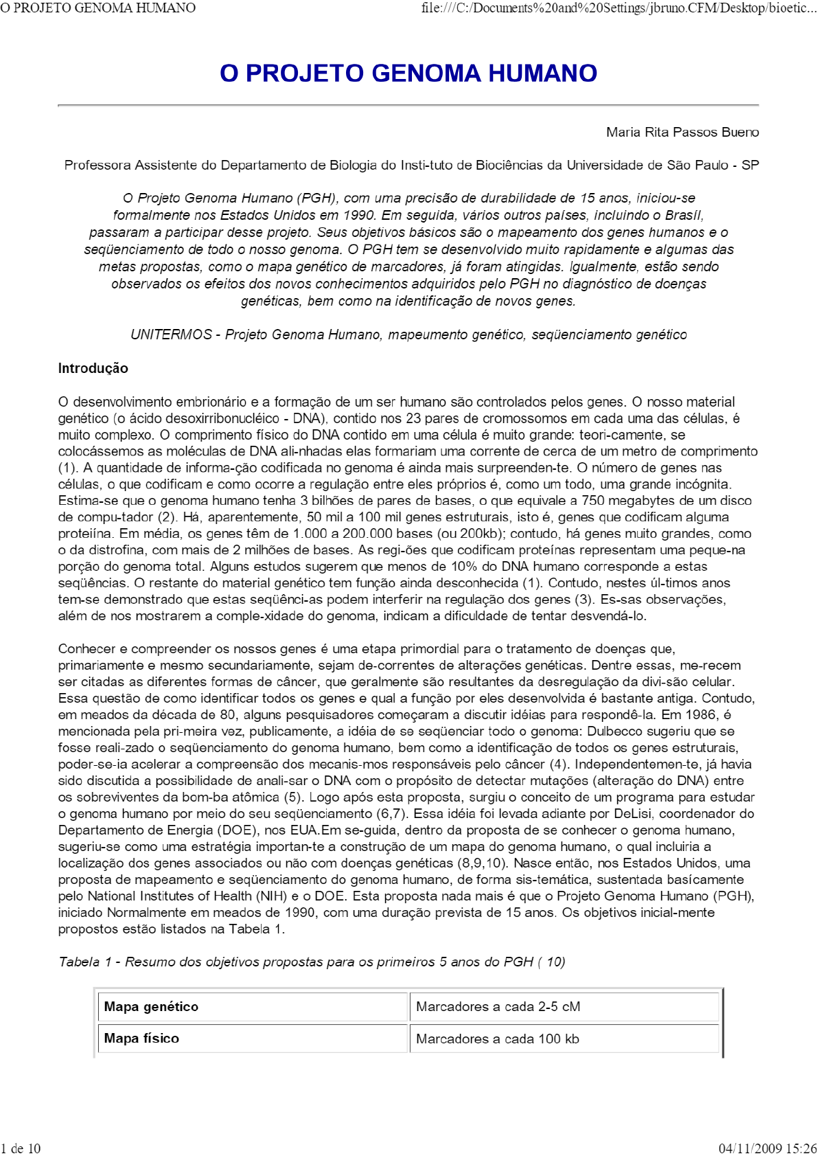 <p>PROJETO GENOMA HUMANO o PROJETO GENOMA HUMANO Maria Rita Passos Bueno Professora Assistente do Departamento de Biologia do Insti-tuto de Biociências da Universidade de São Paulo SP Projeto Genoma Humano (PGH), com uma precisão de durabilidade de 15 anos, iniciou-se formalmente nos Estados Unidos em 1990. Em seguida, vários outros países, incluindo Brasíl, passaram a participar desse projeto. Seus objetivos básicos são mapeamento dos genes humanos e seqüenciamento de todo nosso genoma. PGH tem se desenvolvido muito rapidamente e algumas das metas propostas, como mapa genético de marcadores, já foram atingidas. Igualmente, estão sendo observados os efeitos dos novos conhecimentos adquiridos pelo PGH no diagnóstico de doenças genéticas, bem como na identificação de novos genes. UNITERMOS Projeto Genoma Humano, mapeumento genético, seqüenciamento genético Introdução desenvolvimento embrionário e a formação de um ser humano são controlados pelos genes. nosso material genético (o ácido desoxirribonucléico DNA), contido nos 23 pares de cromossomos em cada uma das células, é muito complexo. comprimento físico do DNA contido em uma célula é muito grande: teori-camente, se colocássemos as moléculas de DNA ali-nhadas elas formariam uma corrente de cerca de um metro de comprimento (1). A quantidade de codificada no genoma é ainda mais surpreenden-te. número de genes nas células, o que codificam e como ocorre a regulação entre eles próprios é, como um todo, uma grande incógnita. Estima-se que o genoma humano tenha 3 bilhões de pares de bases, o que equivale a 750 megabytes de um disco de compu-tador (2). Há, aparentemente, 50 mil a 100 mil genes estruturais, isto é, genes que codificam alguma Em média, os genes têm de 1.000 a 200.000 bases (ou 200kb); contudo, há genes muito grandes, como o da distrofina, com mais de 2 milhões de bases. As regi-ões que codificam proteínas representam uma peque-na porção do genoma total. Alguns estudos sugerem que menos de 10% do DNA humano corresponde a estas restante do material genético tem função ainda desconhecida (1). Contudo, nestes úl-timos anos demonstrado que estas seqüênci-as podem interferir na regulação dos genes (3). Es-sas observações, além de nos mostrarem a comple-xidade do genoma, indicam a dificuldade de tentar desvendá-lo. Conhecer e compreender os nossos genes é uma etapa primordial para o tratamento de doenças que, primariamente e mesmo secundariamente, sejam de-correntes de alterações genéticas. Dentre essas, me-recem ser citadas as diferentes formas de câncer, que geralmente são resultantes da desregulação da divi-são celular. Essa questão de como identificar todos os genes e qual a função por eles desenvolvida é bastante antiga. Contudo, em meados da década de 80, alguns pesquisadores começaram a discutir idéias para respondê-la. Em 1986, é mencionada pela pri-meira vez, publicamente, a de se todo o genoma: Dulbecco sugeriu que se fosse reali-zado o seqüenciamento do genoma humano, bem como a identificação de todos os genes estruturais, poder-se-ia acelerar a compreensão dos mecanis-mos responsáveis pelo câncer (4). Independentemen-te, já havia sido discutida a possibilidade de anali-sar o DNA com o propósito de detectar mutações (alteração do DNA) entre os sobreviventes da bom-ba atômica (5). Logo após esta proposta, surgiu o conceito de um programa para estudar o genoma humano por meio do seu seqüenciamento (6,7). Essa idéia foi levada adiante por DeLisi, coordenador do Departamento de Energia (DOE), nos EUA.Em se-guida, dentro da proposta de se conhecer o genoma humano, sugeriu-se como uma estratégia importan-te a construção de um mapa do genoma humano, o qual incluiria a localização dos genes associados ou não com doenças genéticas (8,9,10). Nasce então, nos Estados Unidos, uma proposta de mapeamento e seqüenciamento do genoma humano, de forma sis-temática, sustentada pelo National Institutes of Health (NIH) e o DOE. Esta proposta nada mais é que o Projeto Genoma Humano (PGH), iniciado Normalmente em meados de 1990, com uma duração prevista de 15 anos. Os objetivos inicial-mente propostos estão listados na Tabela 1. Tabela 1 Resumo dos objetivos propostas para os primeiros 5 anos do PGH 10) Mapa genético Marcadores a cada 2-5 cM Mapa físico Marcadores a cada 100 kb de 10 04/11/2009 15:26</p><p>O PROJETO GENOMA HUMANO Seqüenciamento do genoma todo Melhorar as técnicas de seqüenciamento e desenvolver novas tecnologias, bem como reduzir os custos Organismos modelos Mapeamento e seqüenciamento de algums organismos: camundongo, Escherichia coli, levedura, Caenorhabditis elegans, Drosophila Informática Desenvolver programas e bancos de dados contendo os mapas genéticos e físicos do genoma humano e outros Problemas éticos, legais e sociais Desenvolver programas para estudar as implicações éticas ( e outras ) em decorrência do PGH Transferêcia de tecnologia Desenvolver tecnologia visando a automação do seqüenciamento de DNA e mapeamento; estimular a transferêcia da tecnologia para a indústria e a comunidade médica As raízes do PGH surgiram nos EUA, no entan-to o projeto é, hoje, internacional. Além do NIH e DOE, que coordenam o PGH nos Estados Unidos, há outras agências análogas coordenando esses es-forços em outros países, tais como Inglaterra, Itália, Canadá, Japão e No Brasíl, este projeto tem recebido apoio principalmente da de Amparo à Pesquisa do Estado de São Paulo (FAPESP), Conselho Nacional de Desenvolvimento Científico e Tecnológico (CNPq) e Programa de Apoio ao Desenvolvimento Científico e Tecnológico (PADCT). Assim sendo, há uma colaboração inter-nacional para o mapeamento e seqüenciamento do genoma humano, conforme a idéia preliminarmente constante no A seguir, pretendemos discutir com maior ênfa-se a proposta de construção de um mapa genético, tendo em vista ser esta u