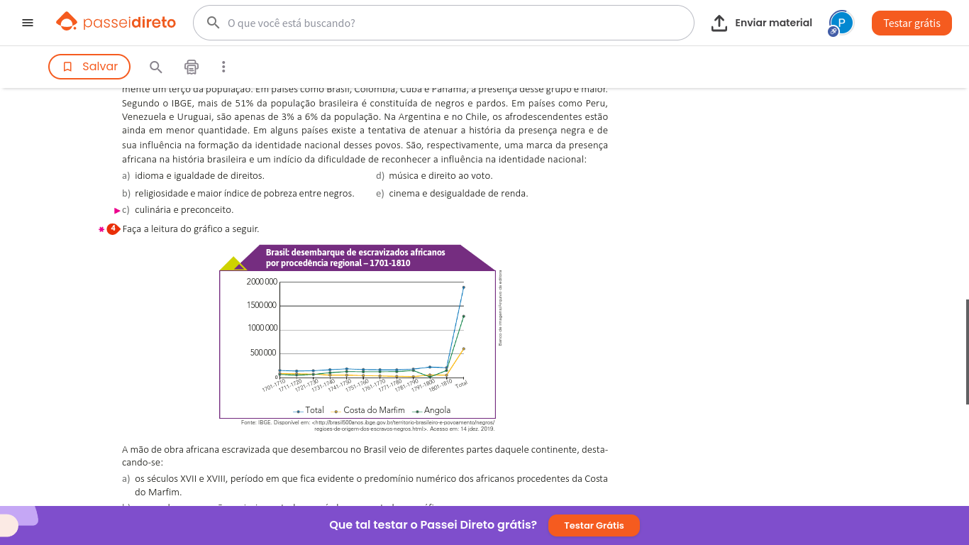 <p>= passeidireto que você está buscando? material P Testar grátis Salvar mente um terço ua paises como e a presença Segundo o IBGE, mais de 51% da população brasileira é constituída de negros e pardos. Em países como Peru, Venezuela e Uruguai, são apenas de 3% a 6% da população. Na Argentina e no Chile, os afrodescendentes estão ainda em menor Em alguns países existe a tentativa de atenuar a história da presença negra e de sua influência na formação da identidade nacional desses povos. São, respectivamente, uma marca da presença africana na história brasileira e um indício da dificuldade de reconhecer a influência na identidade nacional: a) idioma e igualdade de d) música e direito ao voto. b) religiosidade e maior índice de pobreza entre negros. e) cinema e desigualdade de renda. c) culinária e preconceito. * Faça a leitura do gráfico a seguir. Brasil: desembarque de escravizados africanos por procedência regional 1701-1810 1500000 500000 1760 1770 1810 1761 Total Total Costa Marfim Angola Fonte Disponível em gov de escravos negros Acesso em 14 2019 A mão de obra africana escravizada que desembarcou no Brasil veio de diferentes partes daquele continente, desta- cando-se: a) os séculos XVII e XVIII, período em que fica evidente o predomínio numérico dos africanos procedentes da Costa do Marfim. Que tal testar Passei Direto grátis? Testar Grátis</p>