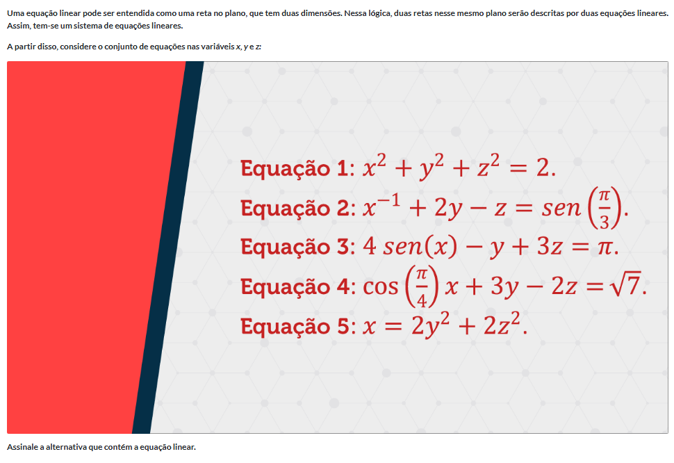 <p>Uma equação linear pode ser entendida como uma reta no que tem duas dimensões. Nessa duas retas nesse mesmo plano serão descritas por duas equações lineares. Assim, tem-se um sistema de equações lineares. A partir disso, considere o conjunto de equações nas variáveis Equação 1: Equação 2: 3 Equação 3:4 Equação 4: - Equação = Assinale a alternativa que a equação</p>