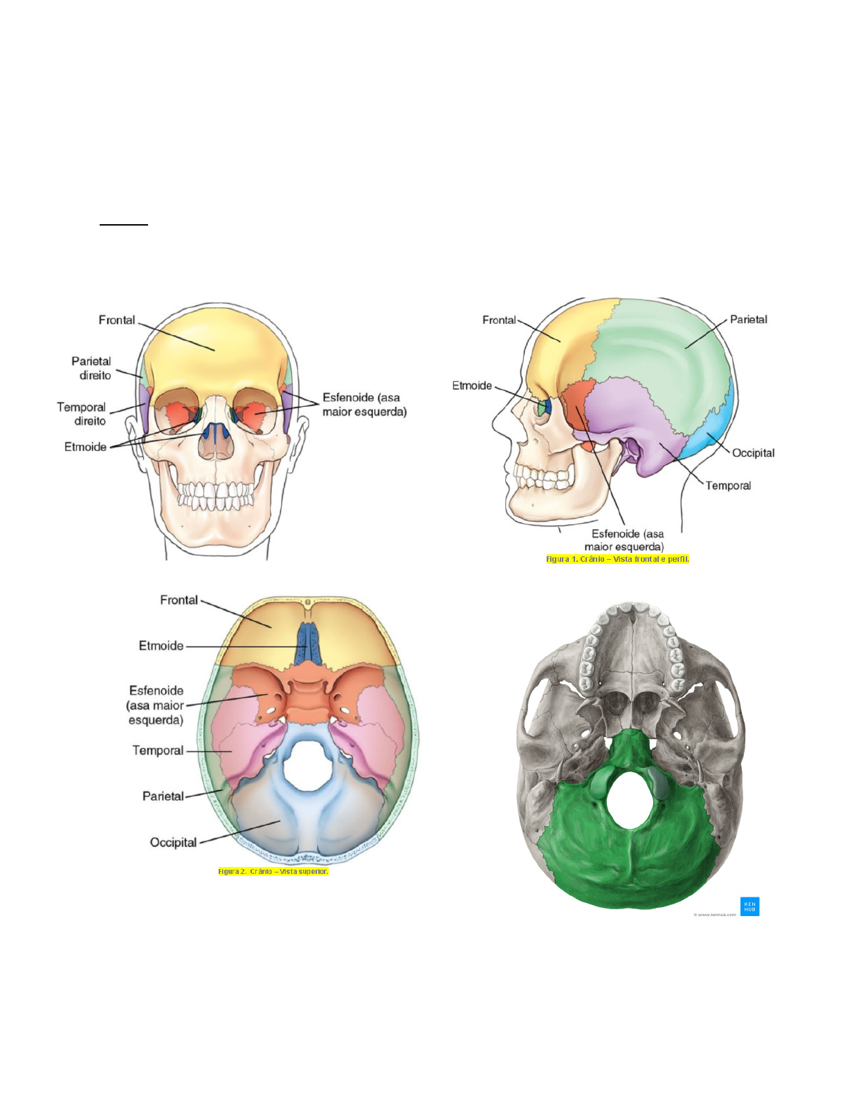 <p>ROTEIRO DE ANATOMIA ÓSSEA ( 20/08 - 27/08)</p><p>Esqueleto axial</p><p>Crânio</p><p>Neurocrânio</p><p>1) Osso frontal. (1):Testa</p><p>2) Osso parietal. (Parietais - 2): Atrás da testa - direita e esquerda</p><p>3) Osso temporal. (Temporais - 2): lateral</p><p>4) Osso etmoidal. (Etmóide -1): osso do olho, atrás do nariz</p><p>5) Osso esfenoidal. (Esfenóide -1): Na frente da tempora - parece uma borboleta</p><p>6) Osso occipital.(1): A parte de trás do crânio (nuca)</p><p>7) Canal carótico ou carotídeo: Protege a via carótida - buraco da frente (Pouco menor)</p><p>8) Fossa jugular: Imediatamente atrás do canal carótico (Pouco maior)</p><p>9) Sela turca: localizada na face superior ou cerebral do esfenóide</p><p>10) Meato acústico externo: onde fica o tímpano do ouvido</p><p>Viscerocrânio – Corresponde à face, aloja os órgãos dos sentidos e corresponde ao início dos</p><p>sistemas digestório e respiratório.</p><p>11) Osso zigomático. (Zigomáticos - 2): maça do rosto</p><p>12) Osso nasal. (Nasais - 2): osso do nariz (direita e esquerda)</p><p>13) Osso lacrimal (Lacrimais - 2): Na frente do etmóide, dentro do olho (direta e esquerda),</p><p>próximo ao nasal.</p><p>14) Osso maxilar (observar processos alveolares). (Maxilas -2): osso perto do nariz na face</p><p>15) Osso mandíbula (observar procesos alveolares)(1): encaixa no maxilar (móvel)</p><p>16) Seio frontal.</p><p>17) Seios maxilares.</p><p>18) Células etmoidais.</p><p>19) Seio esfenoidal.</p><p>20) Osso palatino: atrás da maxila (céu da boca)</p><p>21) Vômer (1): lâmina por dentro do nariz (osso do meio do nariz)</p><p>22) Vértebra Atlas. Primeira vertebra 23) Vértebra Axis. Segunda Vértebra</p><p>24) Osso Hióide: osso que fica na parte anterior do pescoço, abaixo</p><p>da mandíbula e à frente da porção cervical da coluna vertebral. Não</p><p>está articulado com nenhum outro osso, apenas com músculos. É</p><p>apenas suportado pelos músculos do pescoço.</p><p>Tórax</p><p>Esterno – manúbrio, corpo, ângulo do externo e processo xifóide.</p><p>Costelas - (7 pares de costelas verdadeiras, 3 pares de costelas falsas e 2 pares de costelas</p><p>flutuantes).</p><p>Vértebras Torácicas.</p><p>Coluna vertebral – 33 ossos</p><p>25) Diferenciar vértebras</p><p>Cervicais (7): C1 a C7 - mantém o peso da cabeça e permitem o movimento do pescoço,</p><p>únicas que formam artérias verbais que irrigam o cérebro.</p><p>Torácicas (12): T1 a T12 - se original na costela.</p><p>Lombares (5): L1 a L5 - maiores partes de baixo.</p><p>26) Sacro. (4 ou 5 ossos fundidos)</p><p>27) Cóccix. (3-4 ossos fundidos)</p><p>28) Osso Esterno (manúbrio, corpo e</p><p>processo xifóide).</p><p>29) 12 pares de costelas.</p><p>Esqueleto apendicular</p><p>Membro superior</p><p>]Cíngulo do Membro Superior</p><p>30) Osso da Clavícula: Saboneteira/Frente em cima</p><p>31) Escápula: Osso da “asas nas costas”</p><p>Braço</p><p>32) Úmero: Do ombro ao cotovelo</p><p>Antebraço</p><p>33) Rádio.</p><p>34) Ulna.</p><p>Mão</p><p>Ossos carpais</p><p>35) Escafóide: maior do pulso</p><p>36) Semilunar.</p><p>37) Piramidal.</p><p>38) Pisiforme: Bolinha</p><p>39) Hamato.</p><p>40) Capitato.</p><p>41) Trapezóide.</p><p>42) Trapézio.</p><p>43) Ossos metacarpais (1º ao 5): começa a nomear pelo polegar (dedão)</p><p>44) Falanges da Mão: proximais, mediais e distais.</p><p>(proximal, média e distal): Polegar só tem Proximal e distal</p><p>Membro Inferior</p><p>Cíngulo do Membro Inferior</p><p>Osso do quadril</p><p>45) Ílio: maior</p><p>46) Ísquio: Em baixo</p><p>47) Púbis: Frente e mais perto do gesticulo</p><p>48) Forame obturado: Buraco</p><p>Coxa</p><p>49) Fêmur: Coxa</p><p>Perna</p><p>50) Tíbia: Perna maior</p><p>+ grossa (Canela)</p><p>51) Fíbula: Perna menor</p><p>+ fina</p><p>Joelho</p><p>52) Patela: Osso solto do joelho</p><p>Pé</p><p>Ossos tarsais</p><p>53) Tálus: Em cima do calcanhar</p><p>54) Calcâneo: Calcanhar</p><p>55) Navicular:Em cima do Tálus (navio)</p><p>56) Cubóide: Formato de um (Cubo)</p><p>57) Cuneiformes lateral(Lado do Cubóide),</p><p>Cuneiformes intermédio(entre o lateral e medial) e</p><p>Cuneiformes medial (alinhado ao corpo) .</p><p>58) Ossos metatarsais (1º ao 5º).</p><p>59) Falanges do Pé: proximais, mediais e distais(1º ao 5º).</p><p>(proximal, média e distal) - Começa pela dedão/ 5º= dedinho</p><p>60) Ossos sesamóides do pé: Arredondado</p><p>Acidentes anatômicos</p><p>Depressões</p><p>● Fossa: região deprimida (ex.: fossa cerebelar no crânio);</p><p>● Sulco: depressão alongada (ex.: sulco do nervo ulnar do úmero).</p><p>Saliências</p><p>● Cabeça: extremidade articular redonda e grande (ex.: cabeça do fêmur);</p><p>● Capítulo: porção articular redonda e pequena (ex.: capítulo do úmero);</p><p>● Côndilo: porção articular elipsóide, porém geralmente ocorre em pares (ex.: côndilos do</p><p>fêmur); Crista: crista do osso (ex.: crista gali do etmóide e crista ilíaca);</p><p>● Epicôndilo: região onde há uma eminência que se localiza superiormente a um côndilo</p><p>(ex.: epicôndilo medial do úmero);</p><p>● Espinha: projeção óssea afilada (ex.: espinha ilíaca anterosuperior);</p><p>● Faceta: superfície articular lisa tendendo a plana (faceta articular dos processos</p><p>articulares das vértebras);</p><p>● Fóvea: porção lisa e plana encontrada nas áreas de articulação entre os ossos (ex.:</p><p>fóveas articulares – superior e inferior – presentes nos corpos vertebrais para a</p><p>articulação com as costelas);</p><p>● Linha: margem óssea suave (ex.: linha pectínea do fêmur); Maléolo: processo</p><p>arredondado (ex.: maléolo medial da tíbia);</p><p>● Processo: projeção óssea (ex.: processo estilóide do rádio);</p><p>● Protuberância: região onde há uma projeção do osso (ex.: protuberância occipital</p><p>externa); Ramo: processo alongado (ex.: ramo da mandíbula);</p>