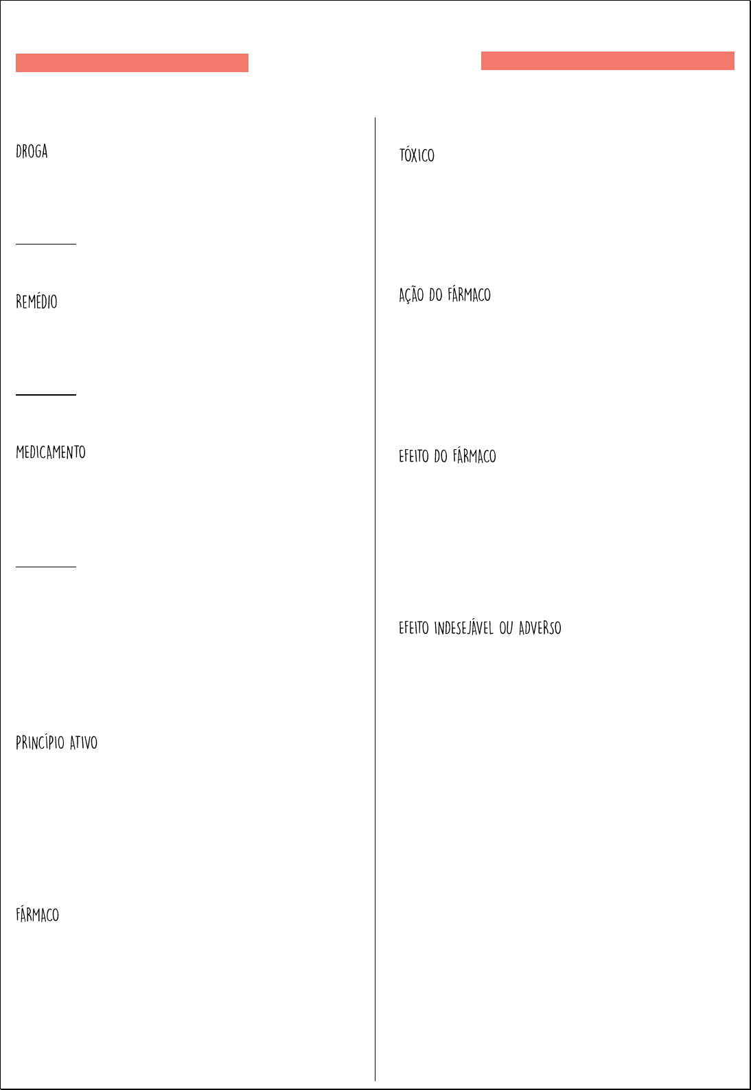 <p>Qualquer substância química capaz de interagir com</p><p>o organismo vivo em algum nível e produzir efeito.</p><p>Exemplos: Analgésicos, cocaína</p><p>Qualquer recurso ou droga utilizado para tratar ou</p><p>prevenir uma doença.</p><p>Exemplos: Psicoterapia, banho quente, analgésico.</p><p>Produto farmacêutico tecnicamente obtido ou</p><p>elaborado com finalidade profilática, curativa, paliativa</p><p>ou para fins de diagnóstico.</p><p>Exemplos: Profilática – vacina, flúor, antibioticoterapia;</p><p>Curativa – antibiótico, analgésicos;</p><p>Paliativa – salompas, analgésicos, anti-inflamatórios;</p><p>Para fins de diagnóstico – contraste, teste de</p><p>gravidez, evidenciador de placa dental.</p><p>Substâncias utilizadas que devem exercer efeito</p><p>farmacológico. É o nome do fármaco que produz</p><p>efeito terapêutico.</p><p>Exemplos: Paracetamol – é o princípio ativo do Tylenol.</p><p>Substãncia química definida que produz um efeito</p><p>farmacológico. É o princípio ativo.</p><p>Exemplos: Ácido acetilsalicílico, dipirona.</p><p>Droga que causa um efeito danoso ou lesivo ao</p><p>organismo. Algumas substâncias ingeridas em excesso</p><p>podem se tornar danoso ao organismo.</p><p>Interação do fármaco com o receptor (local de</p><p>ligação do fármaco no organismo), resultando em</p><p>eventos bioquímicos. Há fármacos que não precisam</p><p>de receptor, como por exemplo o leite de magnésio.</p><p>É o resultado final da ação do fármaco.</p><p>Exemplo: Paciente com febre, tomou um paracetamol,</p><p>o paracetamol se liga no receptor (ação do fármaco)</p><p>e o efeito disso é a diminuição da febre.</p><p>Qualquer resposta a um medicamento que seja</p><p>prejudicial, não intencional e que ocorra após ingestão</p><p>de doses corretas.</p><p>Exemplo: Reação alérgica a dipirona.</p><p>Terminologias da</p><p>Farmacologia</p>