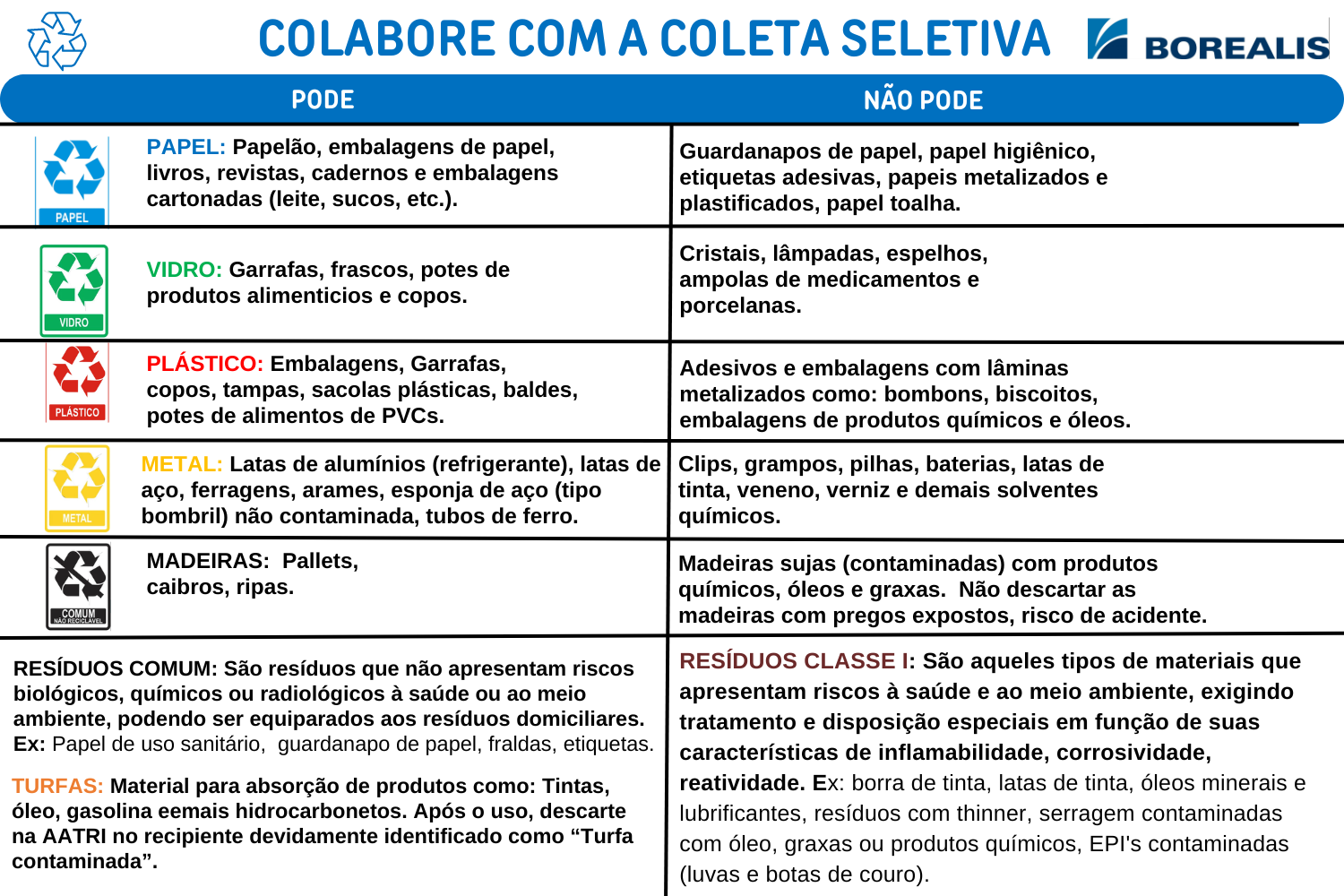 <p>COLABORE COM A COLETA SELETIVA BOREALIS PODE NÃO PODE PAPEL: Papelão, embalagens de papel, Guardanapos de papel, papel higiênico, livros, revistas, cadernos e embalagens etiquetas adesivas, papeis metalizados e cartonadas (leite, sucos, etc.). plastificados, papel toalha. PAPEL Cristais, lâmpadas, espelhos, VIDRO: Garrafas, frascos, potes de ampolas de medicamentos e produtos alimenticios e copos. porcelanas. VIDRO PLÁSTICO: Embalagens, Garrafas, Adesivos e embalagens com lâminas copos, tampas, sacolas plásticas, baldes, metalizados como: bombons, biscoitos, PLASTICO potes de alimentos de PVCs. embalagens de produtos químicos e óleos. METAL: Latas de alumínios (refrigerante), latas de Clips, grampos, pilhas, baterias, latas de aço, ferragens, arames, esponja de aço (tipo tinta, veneno, verniz e demais solventes METAL bombril) não contaminada, tubos de ferro. químicos. MADEIRAS: Pallets, Madeiras sujas (contaminadas) com produtos caibros, ripas. químicos, óleos e graxas. Não descartar as COMUM madeiras com pregos expostos, risco de acidente. RESÍDUOS COMUM: São resíduos que não apresentam riscos RESÍDUOS CLASSE I: São aqueles tipos de materiais que biológicos, químicos ou radiológicos à saúde ou ao meio apresentam riscos à saúde e ao meio ambiente, exigindo ambiente, podendo ser equiparados aos resíduos domiciliares. tratamento e disposição especiais em função de suas Ex: Papel de uso sanitário, guardanapo de papel, fraldas, etiquetas. características de inflamabilidade, corrosividade, TURFAS: Material para absorção de produtos como: Tintas, reatividade. Ex: borra de tinta, latas de tinta, óleos minerais e óleo, gasolina eemais hidrocarbonetos. Após o uso, descarte lubrificantes, resíduos com thinner, serragem contaminadas na AATRI no recipiente devidamente identificado como "Turfa com óleo, graxas ou produtos químicos, EPI's contaminadas contaminada". (luvas e botas de couro).</p>