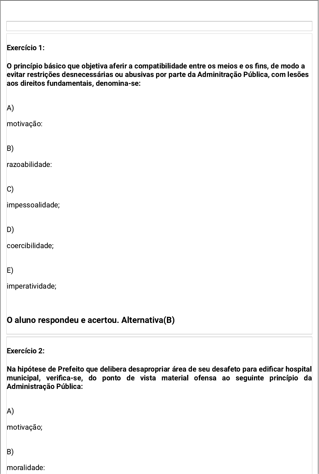 <p>Exercício 1:</p><p>O princípio básico que objetiva aferir a compatibilidade entre os meios e os fins, de modo a</p><p>evitar restrições desnecessárias ou abusivas por parte da Adminitração Pública, com lesões</p><p>aos direitos fundamentais, denomina-se:</p><p>A)</p><p>motivação:</p><p>B)</p><p>razoabilidade:</p><p>C)</p><p>impessoalidade;</p><p>D)</p><p>coercibilidade;</p><p>E)</p><p>imperatividade;</p><p>O aluno respondeu e acertou. Alternativa(B)</p><p>Exercício 2:</p><p>Na hipótese de Prefeito que delibera desapropriar área de seu desafeto para edificar hospital</p><p>municipal, verifica-se, do ponto de vista material ofensa ao seguinte princípio da</p><p>Administração Pública:</p><p>A)</p><p>motivação;</p><p>B)</p><p>moralidade:</p><p>C)</p><p>legalidade;</p><p>D)</p><p>devido processo legal;</p><p>E)</p><p>Inalienabilidade dos bens públicos.</p><p>O aluno respondeu e acertou. Alternativa(B)</p><p>Exercício 3:</p><p>Sobre os princípios que regem a administração pública, é incorreto afirmar que:</p><p>A)</p><p>o princípio da moralidade exige que o administrador se paute por conceitos éticos;</p><p>B)</p><p>corolário do princípio da igualdade é a vedação de se estabelecer diferenças em razão de</p><p>sede ou domicílio dos licitantes;</p><p>C)</p><p>o princípio da supremacia do interesse público decorre da posição privilegiada dos órgãos e</p><p>entes públicos encarregados da preservação do interesse público;</p><p>D)</p><p>em decorrência do princípio da hierarquia, que é restrito às funções administrativas e não</p><p>aplicáveis às funções tipicamente legislativas e judiciais, a Administração Pública possui a</p><p>prerrogativa de avocar atribuições, e também de rever os atos dos subordinados;</p><p>E)</p><p>A Constituição Federal prevê, expressamente, os princípios da legalidade, publicidade,</p><p>impessoalidade, moralidade, eficiência e razoabilidade.</p><p>O aluno respondeu e acertou. Alternativa(E)</p><p>Exercício 4:</p><p>Com relação aos princípios consitucionais da Administração Pública, está em conformidade</p><p>com a</p><p>A)</p><p>moralidade o ato administrativo praticado por agente público em favorecimento próprio,</p><p>desde que revestido de legalidade.</p><p>B)</p><p>eficiência a prestação de serviço público que satisfaça em parte às necessidades dos</p><p>administrados, desde que realizados com rapidez e prontidão;</p><p>C)</p><p>publicidade o sigilo imprescindível à segurança da sociedade e do Estado ou o inidispensável</p><p>à defesa da intimidade;</p><p>D)</p><p>impressoalidade a violação da ordem cronológica dos precatórios para o pagamento dos</p><p>créditos de natureza comum;</p><p>E)</p><p>legalidade a inobservância a quaisquer atos normativos que não sejam lei em sentido estrito</p><p>e provindos de autoridades admnistrativas.</p><p>O aluno respondeu e acertou. Alternativa(C)</p><p>Exercício 5:</p><p>Acerca dos princípios de Direito Administrativo, assinale a alternativa correta.</p><p>A)</p><p>o rol dos principios elencados pela Constituição não é exaustiva, tanto que existem os</p><p>chamados "princípios implícitos".</p><p>B)</p><p>o princípio da legalidade é uma das poucas previsões constitucionais que se relaciona à</p><p>possibilidade de existir tirania e autoritarismo dos membros do Poder Executivo.</p><p>C)</p><p>o princípio da moralidade se aplica apenas aos entes da administração pública indireta.</p><p>D)</p><p>a moralidade e a razoabilidade são exemplos de princípios administrativos sem previsão</p><p>expressa.</p><p>E)</p><p>A Constituição Federal prevê, expressamente, os princípios da legalidade, publicidade,</p><p>impessoalidade, moralidade, eficiência e proporcionalidade.</p><p>O aluno respondeu e acertou. Alternativa(A)</p><p>Exercício 6:</p><p>Pedro foi aprovado em concurso público e acabou por ser contrato. Logo depois da sua</p><p>nomeação, a Administração Pública, analisando com mais detalhe a documentação de</p><p>Pedro, chega à conclusão de que os documentos apresentados eram falsos e, portanto,</p><p>tornou sem efeito a sua aprovação e a sua nomeação.</p><p>Assinale a alternativa que apresenta o princípio aplicado nesse caso.</p><p>A)</p><p>heterocomposição;</p><p>B)</p><p>segurança jurídica;</p><p>C)</p><p>tutela;</p><p>D)</p><p>autotutela;</p><p>E)</p><p>motivação.</p><p>O aluno respondeu e acertou. Alternativa(D)</p><p>Exercício 7:</p><p>É princípio comezinho de direito público que as despesas previstas devem ser liquidadas no</p><p>pertintente contrato, antecedido, em regra, de licitação. Atualmente a imprensa veiculou</p><p>notícias sobre o uso indevido de cartões de crédito corporativos por agentes políticos em</p><p>supermercados, free shops, restaurantes e até para saques em dinheiro em caixas</p><p>eletrônicos. Cuida-se de evidente desrespeito ao princípio da:</p><p>A)</p><p>tutela;</p><p>B)</p><p>continuidade;</p><p>C)</p><p>impessoalidade;</p><p>D)</p><p>proporcionalidade;</p><p>E)</p><p>eficiência.</p><p>O aluno respondeu e acertou. Alternativa(C)</p><p>Exercício 8:</p><p>A vedação à Administração Pública de, por meio de mero ato administrativo, concecer</p><p>direitos, criar obrigações ou impor proibições, vincula-se :</p><p>A)</p><p>legalidade</p><p>B)</p><p>moralidade</p><p>C)</p><p>impessoalidade</p><p>D)</p><p>hierarquia</p><p>E)</p><p>eficiência</p><p>O aluno respondeu e acertou. Alternativa(A)</p><p>Exercício 9:</p><p>O princípio constitucional que impõe à Administração Pública direta e indireta a busca pela</p><p>qualidade e aperfeiçoamento na prestação de seus serviços, preservando os interesses que</p><p>representa, e o princípio estabelecendo que todos têm direito de receber dos órgãos</p><p>públicos, de regra, informações de seu interesse particular ou de interesse coletivo ou geral,</p><p>que serão prestadas no prazo da lei