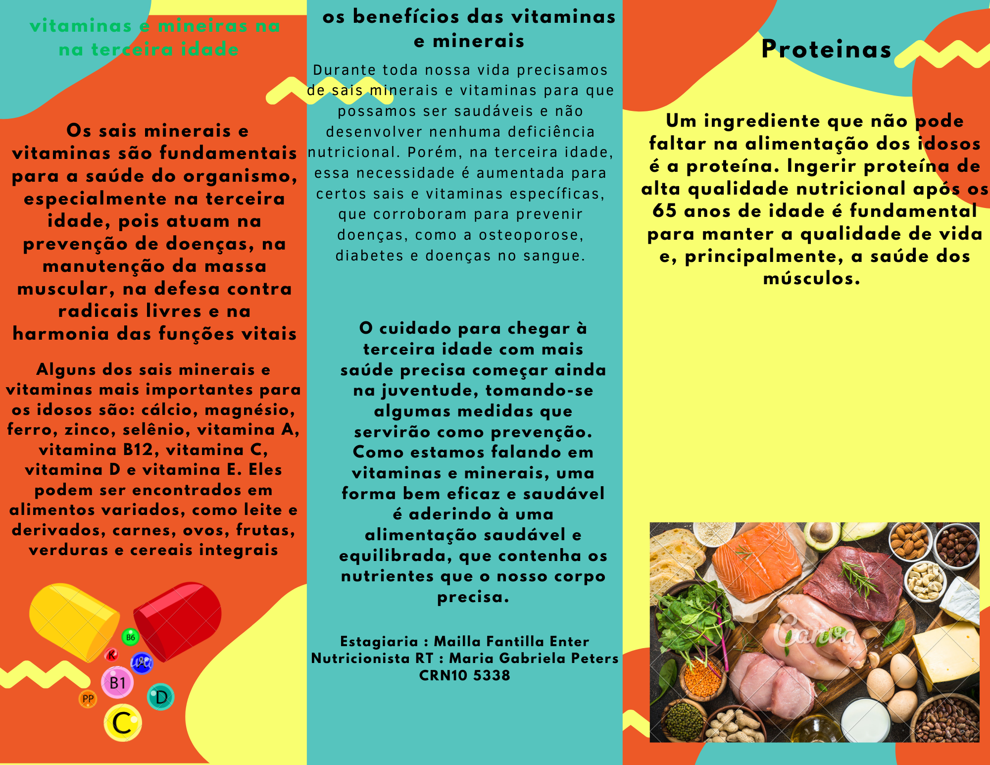 <p>os benefícios das vitaminas vitaminas e mineiras na na terceira idade e minerais Proteinas Durante toda nossa vida precisamos de sais minerais e vitaminas para que possamos ser saudáveis e não Os sais minerais e Um ingrediente que não pode desenvolver nenhuma deficiência vitaminas são fundamentais nutricional. Porém, na terceira idade, faltar na alimentação dos idosos para a saúde do organismo, essa necessidade é aumentada para é a proteína. Ingerir proteína de especialmente na terceira certos sais e vitaminas específicas, alta qualidade nutricional após os idade, pois atuam na que corroboram para prevenir 65 anos de idade é fundamental prevenção de doenças, na doenças, como a osteoporose, para manter a qualidade de vida diabetes e doenças no sangue. manutenção da massa e, principalmente, a saúde dos músculos. muscular, na defesa contra radicais livres e na harmonia das funções vitais cuidado para chegar à terceira idade com mais Alguns dos sais minerais e saúde precisa ainda vitaminas mais importantes para na juventude, tomando-se os idosos são: cálcio, magnésio, algumas medidas que ferro, zinco, selênio, vitamina A, servirão como prevenção. vitamina B12, vitamina C, Como estamos falando em vitamina D e vitamina E. Eles vitaminas e minerais, uma podem ser encontrados em forma bem eficaz e saudável alimentos variados, como leite e é aderindo à uma derivados, carnes, ovos, frutas, alimentação saudável e verduras e cereais integrais equilibrada, que contenha os nutrientes que o nosso corpo precisa. B6 Estagiaria : Mailla Fantilla Enter Nutricionista RT : Maria Gabriela Peters CRN10 5338 B1 PP D</p>