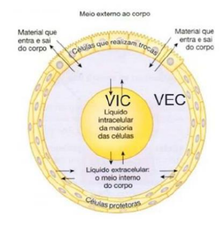 <p>Meio Interno Corporal</p><p>Todas as células são revestidas por soluções corporais contendo íons e outras</p><p>substâncias, dentro do espaço da célula, chamado de LIC ou VIC e fora da</p><p>célula, chamado de LEC ou VEC.</p><p>Líquido extracelular (LEC): Composto pelo líquido intersticial (circunda uma</p><p>célula e outra), plasma sanguíneo (interior dos vasos) e linfa. O LEC possui</p><p>20% da água corporal total (ACT)</p><p>Líquido intracelular (LIC): constituído por toda a água e solutos dissolvidos</p><p>dentro das células. Possui 40% da ACT.</p><p>OBS:</p><p>- Todas as alterações do meio interno corporal ocorrem primeiramente no VEC</p><p>- Ocorre constantes trocas entre o VIC e o VEC para alcançar a homeostase</p><p>corporal</p><p>- íons em maiores concentrações no VEC: sódio, cloretos, íons bicarbonato...</p><p>- íons em maiores concentrações no VIC: potássio, magnésio e fosfatos</p><p>- Alterações no VEC altera também o VIC</p><p>Homeostasia:</p><p>Refere-se à manutenção das condições estáveis do meio interno. É a busca</p><p>constante pelo equilíbrio das funções do corpo. Nesse sentido, a ruptura da</p><p>homeostasia pode causar doenças.</p><p>Osmolaridade:</p><p>É o número de partículas de soluto em 1 litro de solução. Quanto maior a</p><p>concentração de solutos em uma solução, maior será a osmolaridade.</p><p>Tonicidade:</p><p>É capacidade de uma solução de causar mudanças no volume ou na pressão</p><p>de uma célula. Existem 3 formas de descrever a tonicidade de uma solução:</p><p>isotônica, hipertônica e hipotônica.</p><p>Isotônica: mesma concentração de solutos que o fluido intracelular.</p><p>Hipertônica: concentração de solutos maior que o fluido intracelular. Isso leva à</p><p>saída de água da célula, alterando o LIC</p><p>Hipotônica: concentração de solutos menor que o fluido intracelular. Isso leva à</p><p>entrada de água na célula, alterando o LIC</p><p>OBS:</p><p>- A osmolaridade fisiológica é igual no VIC e VEC, de aproximadamente 0,3</p><p>mOsm/L</p><p>- A concentração plasmática do sódio é um indicador do nível de hidratação</p><p>de um paciente, já que o sódio possui grande afinidade com a água.</p><p>Anormalidades clínicas:</p><p>Hipernatremia: alta concentração plasmática de sódio (Na)</p><p>Hiponatremia: baixa concentração plasmática de sódio</p><p>Hipertensão arterial</p><p>A alta concentração de sódio no sangue, dentre outros compostos, aumenta a</p><p>retenção de água, aumentando a volemia e, por conseguinte, aumenta a</p><p>pressão arterial. além disso, a grande retenção de água aumenta a pressão</p><p>hidrostática nos vasos sanguíneos, o que pode causar extravasamento de</p><p>água para o interstício e gerar edema.</p><p>Casos de diarreia e vômitos: gera uma perda excessiva de água e eletrólitos</p><p>(Na, k), causando desidratação.</p><p>Como tratar uma pessoa com desidratação grave? Deve-se fazer uma</p><p>hidratação intravenosa, juntamente com a administração de soluções de sais. É</p><p>o caso das bebidas isotônicas, que contêm água e eletrólitos, como sódio,</p><p>potássio e cloreto.</p><p>E se consumir somente água? Irá desidratar ainda mais, pois sem solutos não</p><p>há retenção de água. Isso porque o aumento da concentração de solutos faz</p><p>com que por osmose reabsorva água.</p><p>Osmolaridade retenção de água volemia pressão arterial</p><p>Hipocalemia: Condição caracterizada por níveis baixos de potássio no sangue</p><p>Causa: Diarreia, vômito, sudorese intensa, uso de diurético, urina excessiva</p><p>Sinais clínicos: fraqueza muscular, apatia, fadiga, câmbrias na panturrilha,</p><p>constipação intestinal, letargia, sonolência</p><p>Influência: a baixa concentração de K+ no LEC (Líquido Extracelular) reduz a</p><p>sua osmolaridade nesse meio, o que provoca a saída desse íon do meio</p><p>intracelular por gradiente de concentração, aumentando a negatividade no</p><p>interior da célula. Isso fará com que haja um aumento do potencial de repouso</p><p>da célula, levando a uma hiperpolarização e, assim, tornando a célula menos</p><p>propensa a disparar impulsos elétricos.</p><p>Consequência:</p><p>-Redução da excitabilidade neuronal e muscular</p><p>-Redução da contratilidade do miocárdio</p><p>Hipercalemia: condição caracterizada por níveis elevados de potássio no</p><p>sangue</p><p>Causa: insuficiência renal (baixa excreção de K+, acumulando no LEC),</p><p>ingestão excessiva de K+</p><p>Sinais clínicos: fraqueza muscular, arritmias cardíacas, fadiga, palpitações</p><p>Influência: na hipercalemia, a concentração extracelular de K+ está elevada, o</p><p>que reduz a saída desse íon do LIC (Líquido Intracelular), fazendo com que o</p><p>interior da célula se torne menos negativo, ou seja, o potencial de repouso é</p><p>reduzido.</p><p>Qual a função dos isotônicos para os atletas?</p><p>Durante os exercícios, os atletas perdem grande quantidade de água e</p><p>eletrólitos. Desse modo, para manter o equilíbrio hidroeletrolítico, fazem o</p><p>consumo de bebidas isotônicas, que são formuladas para repor água e</p><p>eletrólitos, como sódio, potássio e cloreto, perdidos durante a sudorese intensa</p><p>Os eletrólitos como sódio, potássio, magnésio e cloreto são essenciais para as</p><p>funções corporais, incluindo a contração muscular, a condução nervosa e o</p><p>equilíbrio de fluidos. A perda desses eletrólitos pelo suor pode causar</p><p>desequilíbrios que levam a cãibras musculares, fadiga, e, em casos extremos,</p><p>condições mais graves, como a hiponatremia (baixo nível de sódio no sangue).</p>