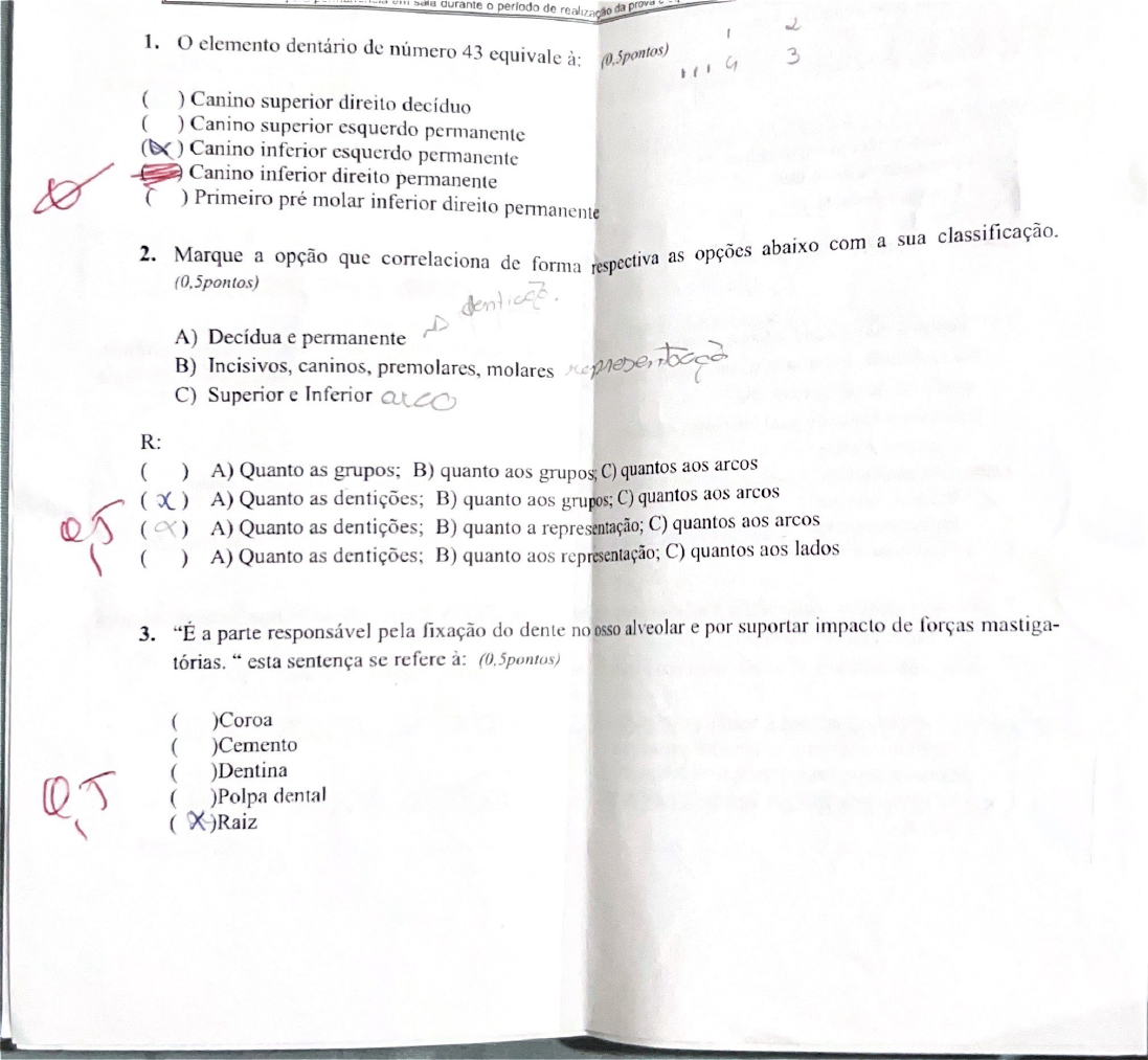 <p>de realização da prova . 1. elemento dentário de número 43 equivale à: (0.5pontos) 3 ( ) Canino superior direito decíduo ( ) Canino superior esquerdo permanente Canino inferior esquerdo permanente Canino inferior direito permanente ) Primeiro pré molar inferior direito permanente 2. Marque a opção que correlaciona de forma respectiva as opções abaixo com a sua classificação. (0,5pontos) A) Decídua e permanente B) Incisivos, caninos, premolares, molares C) Superior e Inferior R: ( ) A) Quanto as grupos; B) quanto aos C) quantos aos arcos ( A) Quanto as dentições; B) quanto aos C) quantos aos arcos ( A) Quanto as dentições; B) quanto a representação; C) quantos aos arcos ( ) A) Quanto as dentições; B) quanto aos representação; C) quantos aos lados 3. "É a parte responsável pela fixação do dente no osso alveolar e por suportar impacto de forças mastiga- tórias. " esta sentença se refere à: (0,5pontos) ( )Coroa ( ( )Dentina )Cemento ( )Polpa dental</p><p>4. "Vai do ápice radicular à curvatura cervical Essa sentença se refere a: (0,5pontos) ( ) Diâmetro vestibulo-lingual do colo ) Diâmetro vestibulo-lingual da coroa Comprimento da raiz ) Curvatura cervical mesial ) Curvatura cervical distal 5. "Tem no centro uma elevação longitudinal em forma de crista que termina na ponta da É acompanhada de cada lado por sulcos rasos, que dão um aspecto de 3 lobos à face, sendo que lobo central é o mais proeminente". Esta informação se refere à: Face vestibular dos caninos ( ) Faces proximais dos pré-molares ( ) Face vestibular dos incisivos ( ) Face vestibular dos pre-molares ) Faces proximais dos caninos 6. Observa-se na borda incisal três dentículos que desaparecem com a mastigação. Esta frase se refere à: (lponto) ( ) Caninos recém-irrompidos ( ) Pré molares deciduos ( ) Caninos decíduos molares Incisivos 7. "Tenho a coroa mais longa e estreita em comparação ao meu homônimo da arcada diferente da minha. Na realidade, a coroa é só um pouco mais longa, mas a sua reduzida dimensão mésio-distal dá-lhe a aparência de coroa bem alta." Estamos falando de qual elemento dentário: ( ) Canino superior Canino inferior Incisivo inferior ( ) Incisivo superior ( ) Pré-molar inferior 8. Fossa, rebordos marginais e com aspectos vestigiais X Fossa, rebordos marginais e cingulos com aspectos evidenciados. Esta comparação está sendo feita entre quais elementos dentários respectivamente? ( ) incisivos superiores X Incisivos inferiores ( ) Incisivos inferiores X caninos superiores ( ) caninos superiores X Incisivos inferiores Incisivos inferiores X incisivos superiores ( ) N.R.A</p><p>9. "Coroa que de contorno a divide pentagonal em duas e não quadrangular Isto se deve e distal à presença convergem de uma para colo; a na conver- borda gência da inclinações. mesial borda distal é mais acentuada." Esta As bordas informação se refere à: ( ) Faces proximais dos pré-molares ( ) Face vestibular dos caninos ( Face vestibular dos incisivos ( ) Face vestibular dos pre-molares Faces proximais dos caninos 10. Descreva de forma completa a identificação dos elementos dentários (1,5pontos) 26 do quadrante 45 dente do do segundo 18 dente do molar 11. Descreva de forma completa a identificação doselementos dentários (1,5 pontos) 63 dente decidual, do canino do mdar ( 81 dente central 74 dente</p>