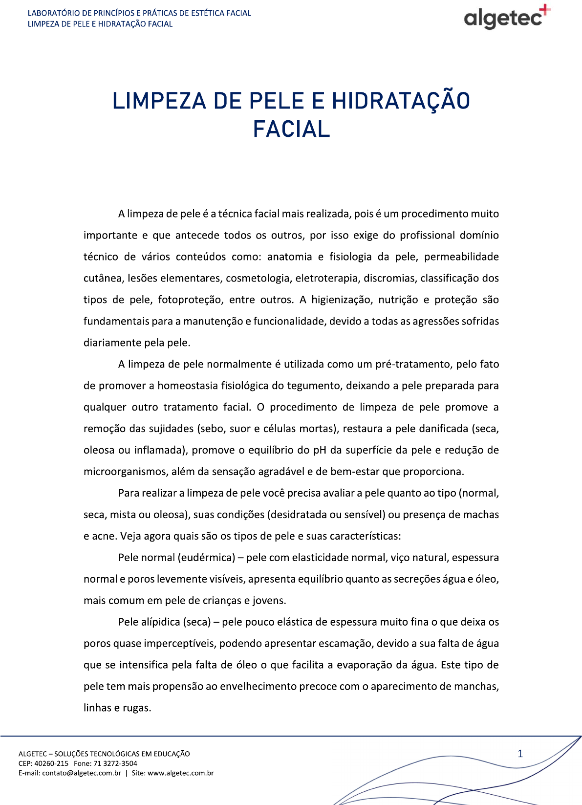 <p>LABORATÓRIO DE PRINCÍPIOS E PRÁTICAS DE ESTÉTICA FACIAL LIMPEZA DE PELE E HIDRATAÇÃO FACIAL algetec LIMPEZA DE PELE E HIDRATAÇÃO FACIAL A limpeza de pele é a técnica facial mais realizada, pois é um procedimento muito importante e que antecede todos os outros, por isso exige do profissional domínio técnico de vários conteúdos como: anatomia e fisiologia da pele, permeabilidade cutânea, lesões elementares, cosmetologia, eletroterapia, discromias, classificação dos tipos de pele, fotoproteção, entre outros. A higienização, nutrição e proteção são fundamentais para a manutenção e funcionalidade, devido a todas as agressões sofridas diariamente pela pele. A limpeza de pele normalmente é utilizada como um pré-tratamento, pelo fato de promover a homeostasia fisiológica do tegumento, deixando a pele preparada para qualquer outro tratamento facial. procedimento de limpeza de pele promove a remoção das sujidades (sebo, suor e células mortas), restaura a pele danificada (seca, oleosa ou inflamada), promove o equilíbrio do pH da superfície da pele e redução de microorganismos, além da sensação agradável e de bem-estar que proporciona. Para realizar a limpeza de pele você precisa avaliar a pele quanto ao tipo (normal, seca, mista ou oleosa), suas condições (desidratada ou sensível) ou presença de machas e acne. Veja agora quais são os tipos de pele e suas características: Pele normal (eudérmica) - pele com elasticidade normal, viço natural, espessura normal e poros levemente visíveis, apresenta equilíbrio quanto as secreções água e óleo, mais comum em pele de crianças e jovens. Pele alípidica (seca) pele pouco elástica de espessura muito fina o que deixa os poros quase imperceptíveis, podendo apresentar escamação, devido a sua falta de água que se intensifica pela falta de óleo o que facilita a evaporação da água. Este tipo de pele tem mais propensão ao envelhecimento precoce com o aparecimento de manchas, linhas e rugas. ALGETEC SOLUÇÕES TECNOLÓGICAS EM EDUCAÇÃO 1 CEP: 40260-215 Fone: 71 E-mail: contato@algetec.com.br Site: www.algetec.com.br</p><p>LABORATÓRIO DE PRINCÍPIOS E PRÁTICAS DE ESTÉTICA FACIAL LIMPEZA DE PELE E HIDRATAÇÃO FACIAL algetec Pele mista - tipo de pele mais comum, que apresenta oleosidade concentrada no centro do rosto, mais conhecida como zona T (testa, nariz e queixo), podendo apresentar desidratação nas regiões laterais do rosto. Este tipo de pele apresenta poros mais aparentes na zona central e podem surgir acompanhado de cravos também. Pele lipídica (oleosa) - pele com produção excessiva de óleo, que apresenta poros bem dilatados, cravos e brilho excessivo. Este tipo de pele é mais espesso e mais resistente, por isso normalmente demora mais para envelhecer e mesmo se tratando de uma pele oleosa isso não significa que ela não necessite de hidratação. Para uma análise mais completa você pode utilizar a lâmpada de wood, que permite uma avaliação mais profunda da pele. A utilização desta lâmpada deve ser feita em ambiente escuro com a pele limpa. Seu nome se deve a presença de óxido de níquel (cristal de wood) em sua composição, também contém vapor de mercúrio de alta pressão, coberta por um filtro escuro. A eletroterapia pode lhe auxiliar e muito em uma limpeza de pele, os aparelhos mais utilizados são: vapor de ozônio e alta frequência. vapor de ozônio traz muitos benefícios para a limpeza de pele, ajuda a melhorar a circulação, promovendo vasodilatação, relaxa a pele e os tecidos através do calor e promove a emoliência, facilitando a extração dos comedões. Figura 1 Vapor de ozônio. A alta frequência é utilizada com eletrodos de vidro que promove um faiscamento produzindo ozônio, com função bactericida, fungicida, oxigenante e estimulante da circulação. ALGETEC - SOLUÇÕES TECNOLÓGICAS EM EDUCAÇÃO 2 CEP: 40260-215 Fone: 71 3272-3504 E-mail: contato@algetec.com.br Site: www.algetec.com.br</p><p>LABORATÓRIO DE PRINCÍPIOS E PRÁTICAS DE ESTÉTICA FACIAL LIMPEZA DE PELE E HIDRATAÇÃO FACIAL + Figura Alta frequência. Aqui segue a sequência da limpeza de pele para orientá-lo no processo: higienização; esfoliação; tonificação; emoliente; vapor de ozônio; extração; alta frequência; máscara; fotoproteção. Agora que já relembramos os pontos mais importantes para uma boa limpeza de pele e hidratação facial é hora de você colocar em prática e não esqueça de iniciar por uma boa avaliação de pele. ALGETEC - SOLUÇÕES TECNOLÓGICAS EM EDUCAÇÃO 3 CEP: 40260-215 Fone: 71 3272-3504 E-mail: contato@algetec.com.br I Site: www.algetec.com.br</p><p>LABORATÓRIO DE PRINCÍPIOS E PRÁTICAS DE ESTÉTICA FACIAL LIMPEZA DE PELE E HIDRATAÇÃO FACIAL REFERÊNCIAS BIBLIOGRÁFICAS Tassinary, João. Raciocínio clínico aplicado à estética facial. 1 ed. Lajeado: Estética Experts, 2019. ALGETEC - SOLUÇÕES TECNOLÓGICAS EM EDUCAÇÃO 4 CEP: 40260-215 Fone: 71 E-mail: contato@algetec.com.br Site: www.algetec.com.br</p>