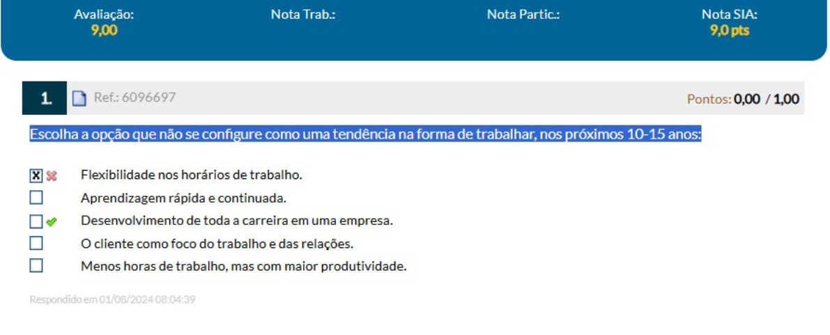 <p>Avaliação: Nota Trab.: Nota Partic.: Nota SIA: 9,00 9,0 pts 1. Ref.: 6096697 Pontos: Escolha a opção que não se configure como uma tendência na forma de trabalhar, nos próximos 10-15 anos: Flexibilidade nos horários de trabalho. Aprendizagem rápida e continuada. Desenvolvimento de toda a carreira em uma empresa. o cliente como foco do trabalho e das relações. Menos horas de trabalho, mas com maior produtividade. Respondido em 01/08/2024 08:04:39</p>