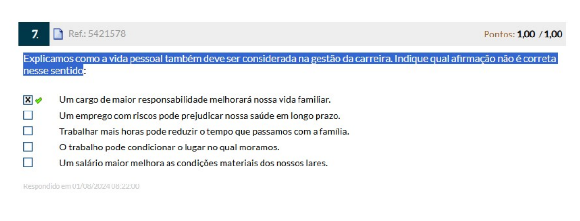 <p>7. Ref.: 5421578 Pontos: Explicamos como a vida pessoal também deve ser considerada na gestão da carreira. Indique qual afirmação não é correta nesse sentido: Um cargo de maior responsabilidade melhorará nossa vida familiar. Um emprego com riscos pode prejudicar nossa saúde em longo prazo. Trabalhar mais horas pode reduzir tempo que passamos com a família. trabalho pode condicionar o lugar no qual moramos. Um salário maior melhora as condições materiais dos nossos lares. Respondido em 01/08/2024 08:22:00</p>