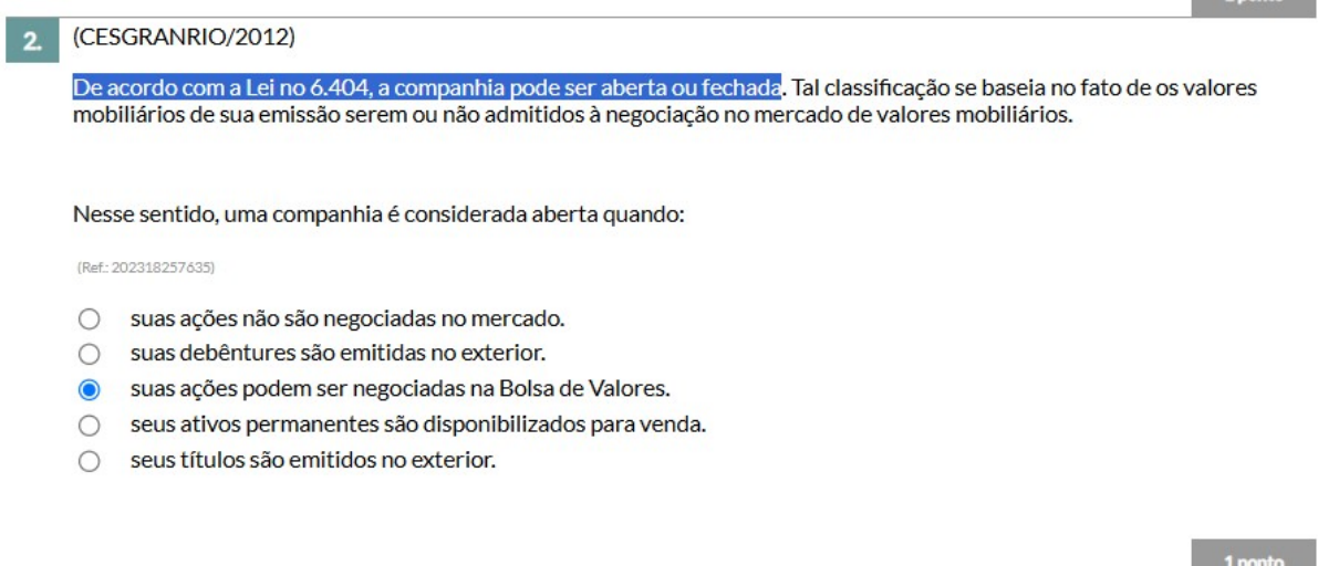 <p>2. (CESGRANRIO/2012) De acordo com a Lei no 6.404, a companhia pode ser aberta ou fechada. Tal classificação se baseia no fato de os valores mobiliários de sua emissão serem ou não admitidos à negociação no mercado de valores mobiliários. Nesse sentido, uma companhia é considerada aberta quando: (Ref.: suas ações não são negociadas no mercado. suas debêntures são emitidas no exterior. suas ações podem ser negociadas na Bolsa de Valores. seus ativos permanentes são disponibilizados para venda. seus títulos são emitidos no exterior.</p>
