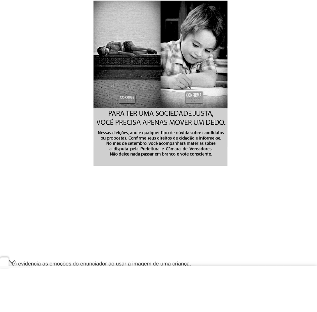 <p>Enem: lista de exercícios sobre funções da</p><p>linguagem</p><p>Com esta lista de exercícios, você testa seus conhecimentos sobre as funções da linguagem,</p><p>assunto sempre presente na prova de Linguagens do Enem.</p><p>Perguntas</p><p>Questão: 1</p><p>(Enem 2020 / Aplicação Digital)</p><p>Disponível em: www.ricmais.com.br. Acesso em: 10 nov. 2011 (adaptado).</p><p>De acordo com as intenções comunicativas e os recursos linguísticos que se destacam, determinadas funções são</p><p>atribuídas à linguagem. A função que predomina nesse texto é a conativa, uma vez que ele</p><p>a) atua sobre o interlocutor, procurando convencê-lo a realizar sua escolha de maneira consciente.</p><p>b) coloca em evidência o canal de comunicação pelo uso das palavras “corrige” e “confirma”.</p><p>c) privilegia o texto verbal, de base informativa, em detrimento do texto não verbal.</p><p>d) usa a imagem como único recurso para interagir com o público a que se destina.</p><p>e) evidencia as emoções do enunciador ao usar a imagem de uma criança.</p><p>Questão: 2</p><p>Aprenda a chamar a polícia</p><p>9/18/24, 6:25 PM Enem: lista de exercícios sobre funções da linguagem - Brasil Escola</p><p>https://exercicios.brasilescola.uol.com.br/imprimir/123668 1/17</p><p>Eu tenho o sono muito leve, e numa noite dessas notei que havia alguém andando sorrateiramente no quintal de casa.</p><p>Levantei em silêncio e fiquei acompanhando os leves ruídos que vinham lá de fora, até ver uma silhueta passando pela</p><p>janela do banheiro. Como minha casa era muito segura, com grades nas janelas e trancas internas nas portas, não fiquei</p><p>muito preocupado, mas era claro que eu não ia deixar um ladrão ali, espiando tranquilamente. Liguei baixinho para a</p><p>polícia, informei a situação e o meu endereço. Perguntaram-me se o ladrão estava armado ou se já estava no interior da</p><p>casa. Esclareci que não e disseram-me que não havia nenhuma viatura por perto para ajudar, mas que iriam mandar</p><p>alguém assim que fosse possível. Um minuto depois liguei de novo e disse com a voz calma: — Oi, eu liguei há pouco</p><p>porque tinha alguém no meu quintal. Não precisa mais ter pressa. Eu já matei o ladrão com um tiro da escopeta calibre 12,</p><p>que tenho guardada em casa para estas situações. O tiro fez um estrago danado no cara! Passados menos de três minutos,</p><p>estavam na minha rua cinco carros da polícia, um helicóptero, uma unidade do resgate, uma equipe de TV e a turma dos</p><p>direitos humanos, que não perderiam isso por nada neste mundo. Eles prenderam o ladrão em flagrante, que ficava olhando</p><p>tudo com cara de assombrado. Talvez ele estivesse pensando que aquela era a casa do Comandante da Polícia. No meio</p><p>do tumulto, um tenente se aproximou de mim e disse: — Pensei que tivesse dito que tinha matado o ladrão. Eu respondi: —</p><p>Pensei que tivesse dito que não havia nenhuma viatura disponível.</p><p>Luis Fernando Veríssimo</p><p>Disponível em: https://armazemdetexto.blogspot.com/2020/07/cronica-aprenda-chamar-policia-luis.html. Acesso</p><p>em: 22 jul. 2021.</p><p>Predomina nesse texto a função da linguagem que se constitui</p><p>a) na organização da mensagem a partir de critérios estéticos que objetivam envolver os leitores na narrativa.</p><p>b) no retrato das distintas condutas assumidas pelo referente em situações diversas.</p><p>c) no intento de se escrever uma crônica tendo como objeto referenciado a própria crônica.</p><p>d) no uso de interjeições que destacam, no texto, o ato comunicacional.</p><p>e) no registro de uma experiência pessoal, sob uma visão parcial dos fatos.</p><p>Questão: 3</p><p>(Enem 2018)</p><p>Deficientes visuais já podem ir a algumas salas de cinema e teatros para curtir, em maior intensidade, as atrações em</p><p>cartaz. Quem ajuda na tarefa é o aplicativo Whatscine, recém-chegado ao Brasil e disponível para os sistemas operacionais</p><p>iOS (Apple) ou Android (Google). Ao ser conectado à rede wi-fi de cinemas e teatros, o app sincroniza um áudio que</p><p>descreve o que ocorre na tela ou no palco com o espetáculo em andamento: o usuário, então, pode ouvir a narração em</p><p>seu celular.</p><p>O programa foi desenvolvido por pesquisadores da Universidade Carlos III, em Madri. “Na Espanha, 200 salas de cinema já</p><p>oferecem o recurso e filmes de grandes estúdios já são exibidos com o recurso do Whatscine!”, diz o brasileiro Luis Mauch,</p><p>que trouxe a tecnologia para o país. “No Brasil, já fechamos parceria com a São Paulo Companhia de Dança para adaptar</p><p>os espetáculos deles! Isso já é um avanço. Concorda?”</p><p>Disponível em: http//veja.abril.com.br.</p><p>Acesso em: 25 jun. 2014 (adaptado).</p><p>Por ser múltipla e apresentar peculiaridades de acordo com a intenção do emissor, a linguagem apresenta funções</p><p>diferentes. Nesse fragmento, predomina a função referencial da linguagem, porque há a presença de elementos que</p><p>a) buscam convencer o leitor, incitando o uso do aplicativo.</p><p>b) definem o aplicativo, revelando o ponto de vista da autora.</p><p>9/18/24, 6:25 PM Enem: lista de exercícios sobre funções da linguagem - Brasil Escola</p><p>https://exercicios.brasilescola.uol.com.br/imprimir/123668 2/17</p><p>c) evidenciam a subjetividade, explorando a entonação emotiva.</p><p>d) expõem dados sobre o aplicativo, usando linguagem denotativa.</p><p>e) objetivam manter um diálogo com o leitor, recorrendo a uma indagação.</p><p>Questão: 4</p><p>“Mesmo quando tudo parece desabar, cabe a mim decidir entre rir ou chorar, ir ou ficar, desistir ou lutar, porque descobri, no</p><p>caminho incerto da vida, que o mais importante é o decidir.”</p><p>Cora Coralina</p><p>No texto, a função emotiva da linguagem pode ser identificada por meio da característica indicada em</p><p>a) objetividade da informaç