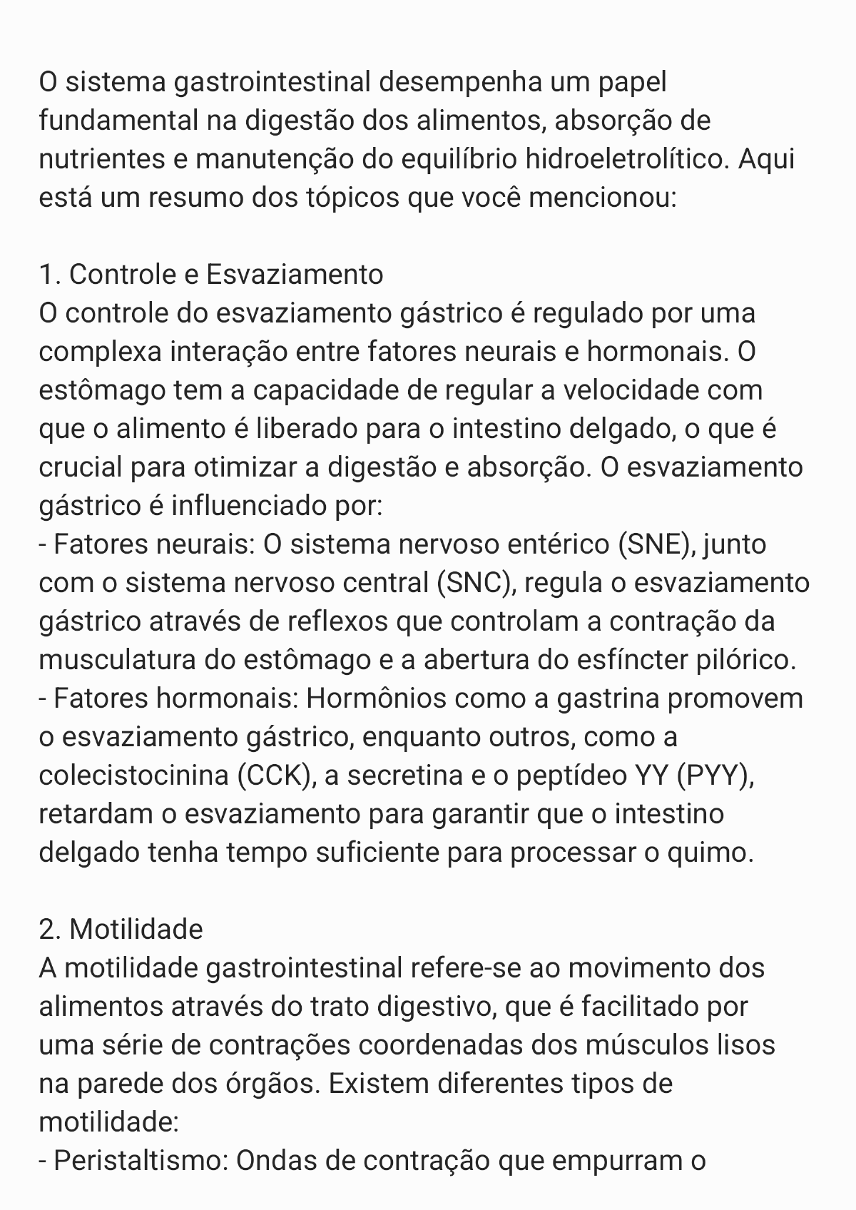 <p>sistema gastrointestinal desempenha um papel fundamental na digestão dos alimentos, absorção de nutrientes e manutenção do equilíbrio hidroeletrolítico. Aqui está um resumo dos tópicos que você mencionou: 1. Controle e Esvaziamento controle do esvaziamento gástrico é regulado por uma complexa interação entre fatores neurais e hormonais. estômago tem a capacidade de regular a velocidade com que o alimento é liberado para o intestino delgado, o que é crucial para otimizar a digestão e absorção. esvaziamento gástrico é influenciado por: - Fatores neurais: sistema nervoso entérico (SNE), junto com o sistema nervoso central (SNC), regula o esvaziamento gástrico através de reflexos que controlam a contração da musculatura do estômago e a abertura do esfíncter pilórico. Fatores hormonais: Hormônios como a gastrina promovem o esvaziamento gástrico, enquanto outros, como a colecistocinina (CCK), a secretina e o peptídeo YY (PYY), retardam o esvaziamento para garantir que o intestino delgado tenha tempo suficiente para processar o quimo. 2. Motilidade A motilidade gastrointestinal refere-se ao movimento dos alimentos através do trato digestivo, que é facilitado por uma série de contrações coordenadas dos músculos lisos na parede dos órgãos. Existem diferentes tipos de motilidade: - Peristaltismo: Ondas de contração que empurram o</p><p>conteúdo ao longo do trato digestivo. Segmentação: Contrações que misturam o conteúdo intestinal, expondo-o a enzimas digestivas e aumentando o contato com a superfície absortiva. - Contrações tônicas: Manutenção de uma tensão muscular constante, importante para a função dos como o esfíncter esofágico inferior e o esfíncter anal. 3. Parede dos Órgãos A parede dos órgãos do trato gastrointestinal é composta por várias camadas, cada uma com funções específicas: - Mucosa: A camada mais interna, responsável pela secreção de muco, enzimas digestivas e hormônios. Ela também contém células absortivas que transportam nutrientes para o sangue. - Submucosa: Uma camada de tecido conjuntivo que suporta a mucosa e contém vasos sanguíneos, linfáticos e nervos. - Camada muscular: Composta por músculos lisos em duas direções (circular e longitudinal), que são responsáveis pela motilidade. - Serosa: A camada externa que protege os órgãos e secreta fluido seroso para reduzir atrito entre os órgãos durante o movimento. 4. Equilíbrio Hidroeletrolítico sistema digestório tem um papel crucial na manutenção do equilíbrio hidroeletrolítico, que é equilíbrio de água e eletrólitos (sódio, potássio, cloreto, etc.) no corpo: - Absorção de água e eletrólitos: A maior parte da absorção de água ocorre no intestino delgado e no cólon, onde</p><p>eletrólitos também são absorvidos ou secretados para manter a osmolaridade e o pH do corpo. - Secreção: trato gastrointestinal secreta grandes volumes de líquidos (suco gástrico, suco pancreático, bile), que são, em grande parte, reabsorvidos no intestino. Qualquer desequilíbrio na absorção pode resultar em condições como diarreia ou desidratação. - Regulação hormonal: Hormônios como aldosterona e vasopressina (ADH) regulam a reabsorção de sódio e água no trato gastrointestinal, influenciando diretamente o equilíbrio hidroeletrolítico. Compreender esses processos é fundamental para avaliar como o sistema digestório contribui para a homeostase geral do corpo, garantindo a distribuição adequada de nutrientes, eletrólitos e água.</p>
