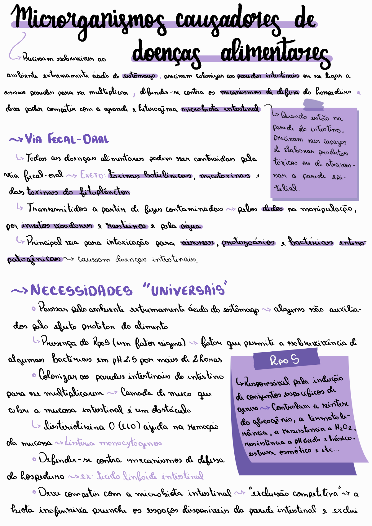 <p>Microrganismos de ao doenças alimentares ambiente acido do colonizar as ligar a para multiplicar contra de do poder competin com a microbiota intestinal Quando na do intestino, ViA FECAL-ORAL elaborar Todar as alimentares ser toxicos on via EXETO: toxinas sar a toxinas do Transmitidos a partir na per & agua Principal para para entero NECESSIDADES acido do auxilia- dos Relo efeito do alimento do Rpos (um fater sigma) que permite a L algumas em PH 2.5 por main 2 homas Rpo S Colonizar as do intestino para Camada muco que de conjuntes a mucosa intestinal i um obstaculo genes ~> Controlam a sintere (LLO) ajuda na do glicoginio, a a a H2O2, da mucosa a acido Defender-se contra do tecido intestinal com a microhiota intestinal a hiota da intestinal exclui</p><p>0 gastrointestinal i um ambiente com Baixa O2 predomina microorganismos de aderidos ao microorganismes produ- zir toxicos on atravessar a epitelial nos em gastrenterite Rila ingustas alimentos que contenham uma on main nas per linhagens estabilococus associada a S Aureus & ENTEROTOXINA produzidas estafilococus. SEA, SEB, SEC1-3, SED, SEE, SEG, SEH, SEI, SEK, SEL, SEM, SEN, SEO, da do choque toxico ESFOLIATIVAS pela estabilococica pele dada do tipo i a para ferenciar entre now habitam on humanos & outros animain FONTES IMPORTANTES DE manipula- de alimentos com maiona dos abriga bilococica lm rebanhos A TOXINA NO ALIMENTO!! EM ALIMENTOS alimentos de animal on manipula- Tratamento termico elimina Estabilococus Temperatura cruscimento : 7°C a 47,8°C produzidas entre 10°C 46°C</p><p>Faixa otima entre 6 0 com pH depende Las outras para entre pH 4 & 9,8 MODO DE São Se ligam as 3 day Thelpen as SE's estimulam as T a produzirem Ativam T. per muitos da GASTRENTERITE de 4hrs da 24 48 minima FATORES Refrigeração inadequada ~>25,5% cases preparados com muita antiadincia com habitos Cozimento on mantidos rob em temperaturas BACTÉRIAS ESPORULADAS GRAM - Clostridium perfringens Produz linhagen causadran perten- am ao PRODUZ TOXINAS NO PRESENTE no na em & notrato intestinal do homem animals tipos comuny no trato intestinal humano Sao otima entre 37°C 45°C / PH 5,5 a 8</p><p>alimentos contaminados solo on e sob condi- de do muito relacionado a on Og ESPOROS a temperaturas normain, germinam multiplicam no linto armazinado em temp. ambienk lou a 60°C 10min A i um proteina cuja ecorre ao mesmo tempo que a entre 6 24 a alimentos contaminades abdominal e vomitos raros Dura 1 dia on minos grave para primidos PREVENÇÃO Cozinhar ati a temperatura interna 75°C Lavar carne as on manusear franges carnus no congelador alimentos refrigerador Clostridium Botulinum uma exotoxina toxica causam em humanos As G alguman B F E i PRESENTE no solo na agua ligumes, humanas & alimentos contaminados Embutidos ou com PH ' sensivel as Por via conjuntival LINHAGENS An digerem a cassina produzem H2S não abaixo 12,5°C acima 50°C</p><p>As fermintam a no de 3.3°C 45°C Exato na não inferior a 4.5 dintro do organismo lactobacilus E termolabil 65°C a 80°C per 30min on atuam forma anta- 100°C per 5min ante Clostri- dium Apaream entre 2 a 5 dian on altera- na ( turva, da voz, muscular generalizada cabega conservas pendente) relacionadas lm geral palmitos, do mar provocar & em embalagens per parada a respiratoria otiginio Pode durar de 1 a 10 mais Depende da resistincia do bacillus cereus Formador de emitica SINDROME um complexo tripartido & a hemoli- BL (HBL) alto molicular Apariam entre dura 6 a 12 dores aquoras Pratos a milho, milho. assada pratos a arroz SINDROME Toxina um agua Toxina baixo molicular</p><p>Apariam entre 6 Principal i a arroz, no solo e ambient Baixa quantidade alimentos on Alimentos mantidos em timperatuma amBiente per longo timpo de Ex: cozido que em temperatura ambiente BACTÉRIAS E da E Coli microscopio on agar nu Rila salmonela habitat natural i intestinal humanos AGRUPADAS 3 GRUPOS: 1. Ass que infectam Thyphi S. A C. Agentes da bebre parati Alta mortalidade 2. adaptados ao Algunes humanos ser S. (frango), S.Dublin (gado), S. Abortus- S. (suino) 3. adaptados Sim preferencia per Patoginico ads e outros A salmonela a membrana da cilula Alimento A salmonela A epitelial penetra contaminado multiplica com uma cilula dentro da salmonela l (intestino)</p><p>microorganismes has a agua solo SINTOMAS A gravidade & e dos depender do Li ingerido 12 a 24 horas Febre acompanhada abdominal Taxa baixa por septiamia Recuperacio em alguns dias may nusmo em ati 6 meses TRATAMENTO: oral PRODUTOS frango owes! Pode contaminadas no processamento Para cada 4 botados per uma galinha infectada 1 dissemina a An galinhar assintomaticas otimo em acima 9 abaixo 4. EXCLUSÃO COMPETITIVA: Probioticos a para colonizar a pare- intestinal competin com a salmonela FEBRE Ela ca na cilula e Causada per Salmonella Typhi troi a Periods de incubacao al (40°C) e continua na remana multiplicam nas cilular do epitilio intestinal, continuam a multiplicar nas disxminam por corpo & pool isolado no na urina nas Pool ecorrer intestinal graves</p><p>Shigeloge familia live 4 S. S. diarreia grave Com muco Sao no TGI chimpanzi e macacos Saw muito pela acidiz do estomago na mucosa produzem exotoxinas que a matando as no intestino mas no intestino egcherichia coli podem E. coli entero- agregativas. E. coli E. coli E. coli entero patoginicar e E. coli especializadas que que a do epitilio intestinal E. COLi ENTEROA GREGATIVA tipo especifico a com > 14 dias E. ENTERO - HEMORRAGICA Abitam I intestino grosso produzem grandes quantidades de toxinas as toxinas Shiga Shigella colite habitonte does tratos do now tem patoginico SINDROME guando toxinas alta GRAVE Diarriia i per</p><p>EM A carne for a EHEC main do que qualquer outro alimento que principain desse ENTEROINVASIVA nas do colon, e apariam 2a 48 hrs now E. Aderincia localizada a cultura com um bator de que possibilita a a mucora com minos E. coli Se ligam colonizam intestino dilgado mlio fatores antiginicos bimbrial tanto em quanto em do ENTEROTO