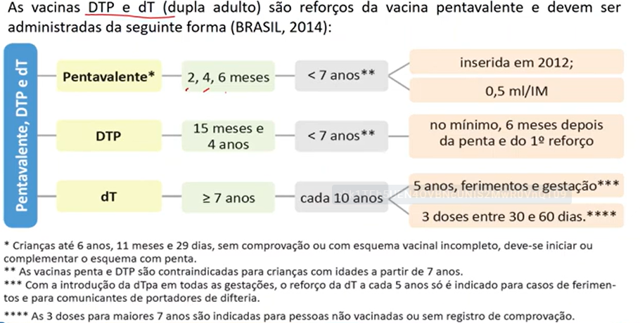 <p>As vacinas DTP e dT (dupla adulto) são reforços da vacina pentavalente e devem ser administradas da seguinte forma (BRASIL, 2014): inserida em 2012; Pentavalente* 2, 4, 6 meses < 7 anos** 0,5 ml/IM 15 meses e no mínimo, 6 meses depois DTP < 7 anos** 4 anos da penta e do 1° reforço 5 anos, ferimentos e gestação*** dT 7 anos cada 10 anos 3 doses entre 30 e 60 dias.**** Crianças até 6 anos, 11 meses e 29 dias, sem comprovação ou com esquema vacinal incompleto, deve-se iniciar ou complementar O esquema com penta. ** As vacinas penta e DTP são contraindicadas para crianças com idades a partir de 7 anos. Com a introdução da dTpa em todas as gestações, reforço da dT a cada 5 anos só é indicado para casos de ferimen- tos e para comunicantes de portadores de difteria. **** As 3 doses para maiores 7 anos são indicadas para pessoas não vacinadas ou sem registro de comprovação.</p>