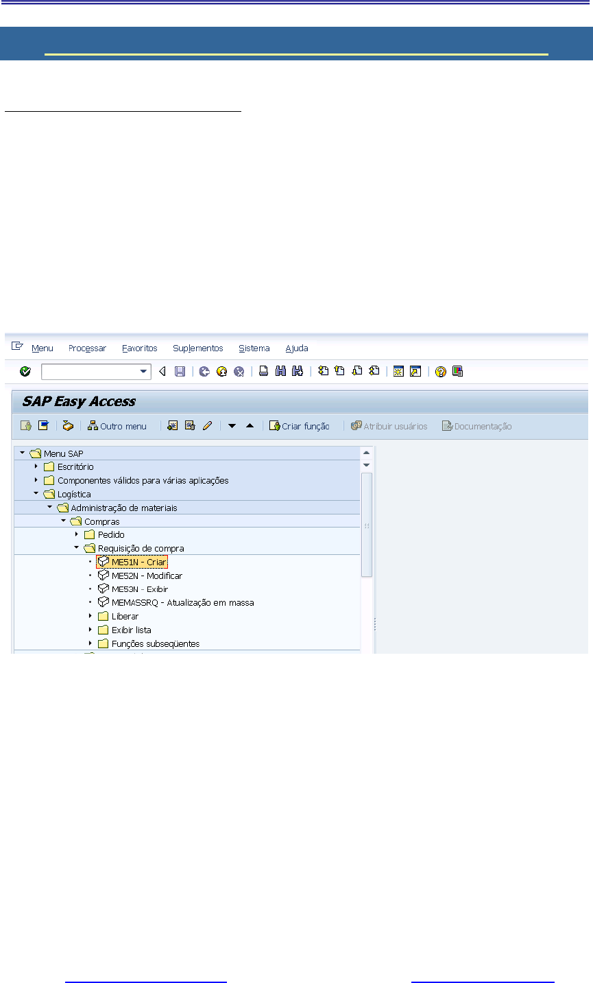 <p>Curso Prático de MM – Aula 10</p><p>Sites: www.grandesprojetos.com www.juliobattisti.com.br</p><p>Página 1 – Última Atualização – 14.01.2021</p><p>Proibido o uso deste material em sala de aula e em treinamentos sem autorização do autor.</p><p>Aula 12 – Criar Requisição de Compras – me51n</p><p>Criar Requisição de Compras – me51n</p><p> O que é: A Uma Requisição de Compra (RC) é uma solicitação interna feita por</p><p>escrito (documento) para a aquisição de itens ou serviços;</p><p> Quando usar: Quando um determinado setor (compras, vendas, produção ou</p><p>administração) deseja adquirir materiais para uma data e quantidade específica.</p><p>Ex: material de escritório, serviços, embalagens, matérias primas, produto</p><p>acabado, máquinas, veículos, imobilizados e assim por diante;</p><p> Como Fazer: O código da transação é: me51n</p><p>Copyright by SAP AG</p><p>Figura – Transação me51n – Criar Requisição de Compra</p><p>Existem 04 áreas na requisição de compras:</p><p>1- O Tipo de Requisição – Compra Normal – NB.</p><p>2- Cabeçalho – Informações adicionais sobre a Requisição ou Avisos.</p><p>3- Síntese dos Itens – Uma síntese breve dos itens (itens de necessidade).</p><p>4- Detalhe – Subir ou descer na lista de itens ou demais informações</p><p>complementares.</p><p>Curso Prático de MM – Aula 10</p><p>Sites: www.grandesprojetos.com www.juliobattisti.com.br</p><p>Página 2 – Última Atualização – 14.01.2021</p><p>Proibido o uso deste material em sala de aula e em treinamentos sem autorização do autor.</p><p>1- Criar Requisição de Compras – me51n – Método Rápido</p><p>Copyright by SAP AG</p><p>Figura – Áreas da Requisição de Compras - RC</p><p>A primeira área da requisição de Compras é o Tipo de Requisição. Selecione o Tipo NB –</p><p>Requisição Normal.</p><p>Copyright by SAP AG</p><p>Figura – Áreas da Requisição de Compras – RC – Tipo de Requisição</p><p>Curso Prático de MM – Aula 10</p><p>Sites: www.grandesprojetos.com www.juliobattisti.com.br</p><p>Página 3 – Última Atualização – 14.01.2021</p><p>Proibido o uso deste material em sala de aula e em treinamentos sem autorização do autor.</p><p>Copyright by SAP AG</p><p>Figura – Figura – Áreas da Requisição de Compras – RC – Cabeçalho</p><p>Em seguida você pode preencher a área do Cabeçalho. Esta área não é obrigatória, sendo</p><p>apenas informativa.</p><p>Copyright by SAP AG</p><p>Figura – Figura – Áreas da Requisição de Compras – RC - Itens</p><p>Depois preencha a área de itens. São obrigatórios os campos: Material, Quantidade e Centro.</p><p>Os demais campos são opcionais. Após o preenchimento, tecle ENTER.</p><p>Curso Prático de MM – Aula 10</p><p>Sites: www.grandesprojetos.com www.juliobattisti.com.br</p><p>Página 4 ��� Última Atualização – 14.01.2021</p><p>Proibido o uso deste material em sala de aula e em treinamentos sem autorização do autor.</p><p>Copyright by SAP AG</p><p>Figura – Figura – Áreas da Requisição de Compras – RC – Detalhe</p><p>Em seguida você pode colocar o nome do Requisitante. Feito isso clique no botão Gravar.</p><p>Copyright by SAP AG</p><p>Figura – Botão Gravar</p><p>2- Criar Requisição de Compras – me51n – Método Completo</p><p>Copyright by SAP AG</p><p>Figura – Áreas da Requisição de Compras - RC</p><p>A primeira área da requisição de Compras é o Tipo de Requisição. Selecione o Tipo NB –</p><p>Requisição Normal.</p><p>Curso Prático de MM – Aula 10</p><p>Sites: www.grandesprojetos.com www.juliobattisti.com.br</p><p>Página 5 – Última Atualização – 14.01.2021</p><p>Proibido o uso deste material em sala de aula e em treinamentos sem autorização do autor.</p><p>Copyright by SAP AG</p><p>Figura – Áreas da Requisição de Compras – RC – Tipo de Requisição</p><p>Copyright by SAP AG</p><p>Figura – Figura – Áreas da Requisição de Compras – RC – Cabeçalho</p><p>Em seguida você pode preencher a área do Cabeçalho. Esta área não é obrigatória, sendo</p><p>apenas informativa.</p><p>Curso Prático de MM – Aula 10</p><p>Sites: www.grandesprojetos.com www.juliobattisti.com.br</p><p>Página 6 – Última Atualização – 14.01.2021</p><p>Proibido o uso deste material em sala de aula e em treinamentos sem autorização do autor.</p><p>Copyright by SAP AG</p><p>Figura – Figura – Áreas da Requisição de Compras – RC - Itens</p><p>Depois preencha a área de itens. São obrigatórios os campos: Material, Quantidade e Centro.</p><p>Os demais campos são opcionais. Após o preenchimento de cada linha, tecle ENTER.</p><p>Campo Valor 1 Valor 2 Valor 3</p><p>Material m-01,</p><p>m-10 ...m-15</p><p>400-512,</p><p>400-430</p><p>100-100,</p><p>1300-100</p><p>Quantidade 1000 2000 3000</p><p>Centro 3000 3000 3000</p><p>Copyright by SAP AG</p><p>Figura – Figura – RC – Detalhe – Dados de Material</p><p>Nesta área você pode complementar:</p><p>Lote – Número de Lote específico</p><p>Material Forn. – Número do material no catálogo do fornecedor</p><p>Relevante IUID – Se este material for único no mundo.</p><p>Curso Prático de MM – Aula 10</p><p>Sites: www.grandesprojetos.com www.juliobattisti.com.br</p><p>Página 7 – Última Atualização – 14.01.2021</p><p>Proibido o uso deste material em sala de aula e em treinamentos sem autorização do autor.</p><p>Copyright by SAP AG</p><p>Figura – Figura – RC – Detalhe – Quantidades e Datas</p><p>Nesta área você pode complementar:</p><p>Concluída – Lembrete que não se devem criar mais solicitações para o material.</p><p>Cód. Fixação. – Não permite alteração automática. Ex: MRP.</p><p>Tempo proc.EM – Indica o tempo necessário para recebimento e armazenagem do material;</p><p>TmpValdRest – Indica o tempo de validade da mercadoria após o recebimento</p><p>Copyright by SAP AG</p