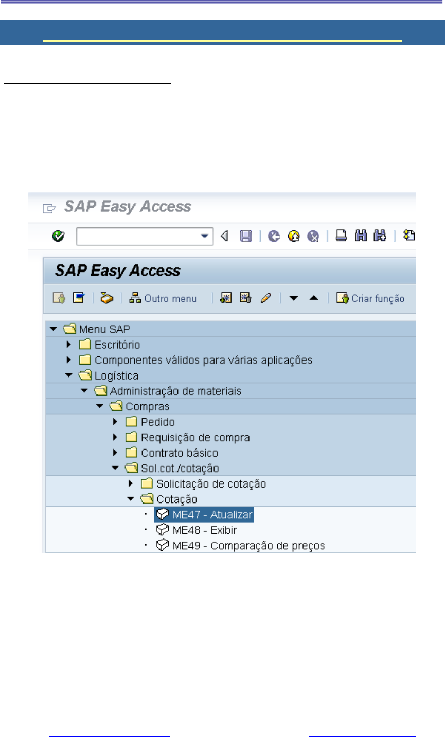 <p>Curso Prático de MM 2 – Administração de Materiais</p><p>Sites: www.grandesprojetos.com www.juliobattisti.com.br</p><p>Página 1 – Última Atualização – 16.01.2021</p><p>Proibido o uso deste material em sala de aula e em treinamentos sem autorização do autor.</p><p>Aula 15 – Atualizar Preços de Cotação – me47</p><p>Atualizar Preços de Cotação – me47</p><p> O que é: A atualização de Preços dos Fornecedores;</p><p> Quando usar: Quando se quer atualizar os preços enviados pelos Fornecedores;</p><p> Como Fazer: O código da transação é: me47</p><p>Copyright by SAP AG</p><p>Figura – Atualizar Cotação</p><p>Curso Prático de MM 2 – Administração de Materiais</p><p>Sites: www.grandesprojetos.com www.juliobattisti.com.br</p><p>Página 2 – Última Atualização – 16.01.2021</p><p>Proibido o uso deste material em sala de aula e em treinamentos sem autorização do autor.</p><p>Copyright by SAP AG</p><p>Figura – Números das Cotações Gerados Anteriormente</p><p>Na aula anterior, pedimos para que você anotasse os números das cotações geradas. Os</p><p>nossos números foram (mas no seu caso, serão números diferentes):</p><p>Curso Prático de MM 2 – Administração de Materiais</p><p>Sites: www.grandesprojetos.com www.juliobattisti.com.br</p><p>Página 3 – Última Atualização – 16.01.2021</p><p>Proibido o uso deste material em sala de aula e em treinamentos sem autorização do autor.</p><p>Copyright by SAP AG</p><p>Figura – 1ª Tela</p><p>Copyright by SAP AG</p><p>Figura – Botão ENTER</p><p>Campo Valor 1 Valor 2 Valor 3</p><p>Solic.</p><p>Cotação</p><p>6000000068 6000000069 6000000070</p><p>Fornecedor 1030 3000 3020</p><p>Material –</p><p>M-11</p><p>20 19 22</p><p>Material –</p><p>M-12</p><p>15 16 13</p><p>Material –</p><p>M-13</p><p>10 12 10</p><p>Curso Prático de MM 2 – Administração de Materiais</p><p>Sites: www.grandesprojetos.com www.juliobattisti.com.br</p><p>Página 4 – Última Atualização – 16.01.2021</p><p>Proibido o uso deste material em sala de aula e em treinamentos sem autorização do autor.</p><p>Copyright by SAP AG</p><p>Figura – Preço Líq.</p><p>Copyright by SAP AG</p><p>Figura – Preço Líq. – Fornecedor 1030</p><p>Copyright by SAP AG</p><p>Figura – Botão Gravar</p><p>Note em seguida que você terá que atualizar os preços dos fornecedores um a um tendo como</p><p>base o Número da Solicitação de Cotação.</p><p>Curso Prático de MM 2 – Administração de Materiais</p><p>Sites: www.grandesprojetos.com www.juliobattisti.com.br</p><p>Página 5 – Última Atualização – 16.01.2021</p><p>Proibido o uso deste material em sala de aula e em treinamentos sem autorização do autor.</p><p>Copyright by SAP AG</p><p>Figura – Segunda Solicitação de Cotação - Atualizar</p><p>Copyright by SAP AG</p><p>Figura – Preço Líq. – Segundo Fornecedor</p><p>Copyright by SAP AG</p><p>Figura – Preço Líq. – Fornecedor 3000</p><p>Curso Prático de MM 2 – Administração de Materiais</p><p>Sites: www.grandesprojetos.com www.juliobattisti.com.br</p><p>Página 6 – Última Atualização – 16.01.2021</p><p>Proibido o uso deste material em sala de aula e em treinamentos sem autorização do autor.</p><p>Copyright by SAP AG</p><p>Figura – Botão Gravar</p><p>Copyright by SAP AG</p><p>Figura – Terceira Solicitação de Cotação - Atualizar</p><p>Copyright by SAP AG</p><p>Figura – Preço Líq. – Terceiro Fornecedor</p><p>Curso Prático de MM 2 – Administração de Materiais</p><p>Sites: www.grandesprojetos.com www.juliobattisti.com.br</p><p>Página 7 – Última Atualização – 16.01.2021</p><p>Proibido o uso deste material em sala de aula e em treinamentos sem autorização do autor.</p><p>Copyright by SAP AG</p><p>Figura – Preço Líq. – Fornecedor 1033</p><p>Copyright by SAP AG</p><p>Figura – Botão Gravar</p><p>Visão Geral do Ambiente de Negócios:</p><p>Ao receber a resposta dos fornecedores o Analista ou Responsável de compras deverá anotar</p><p>em cada solicitação de cotação os preços fornecidos.</p><p>Mesmo com o sistema, o fornecedor precisa ser pró ativo, cobrando por email ou por telefone</p><p>uma resposta às cotações enviadas ao Fornecedor.</p><p>O Analista ou Responsável de compras pode solicitar uma atualização de preços, caso queira</p><p>“lamber o fundo do poço” solicitando que os preços sejam reajustados para baixo de acordo</p><p>com os valor médio de mercado que será visto na próxima aula.</p>